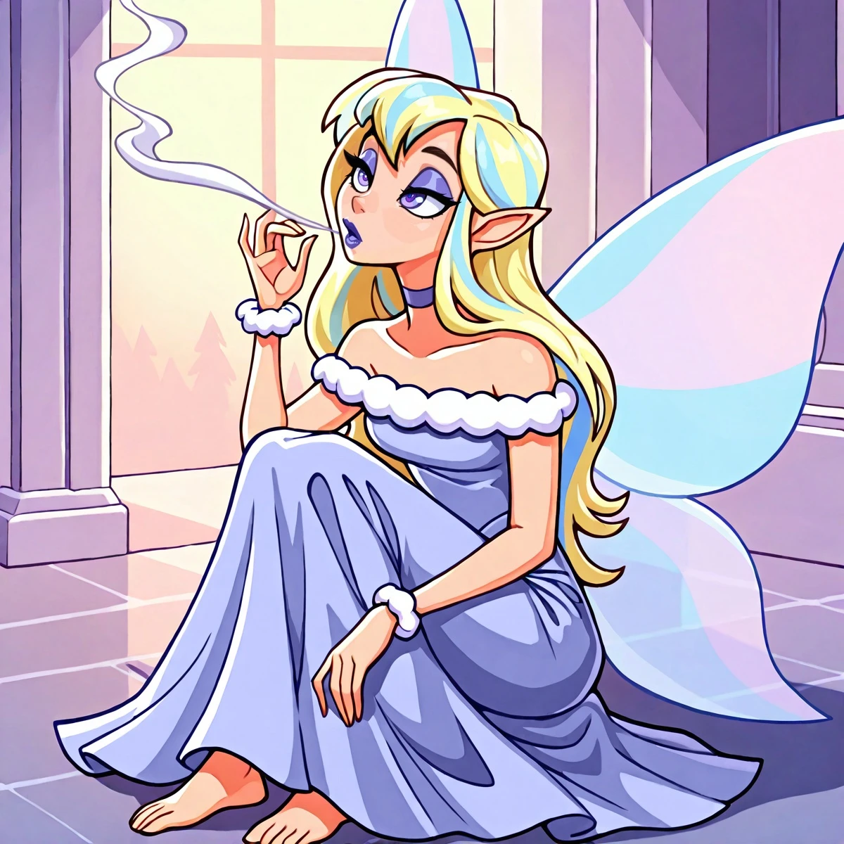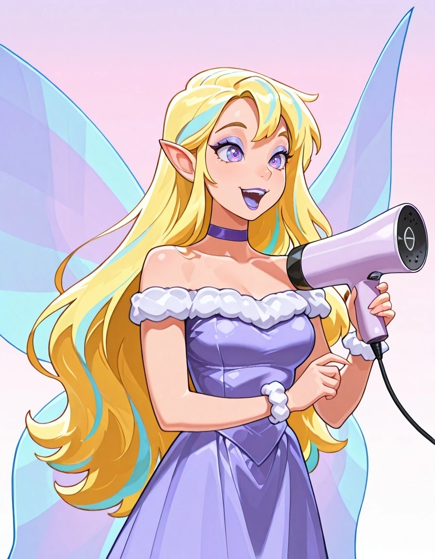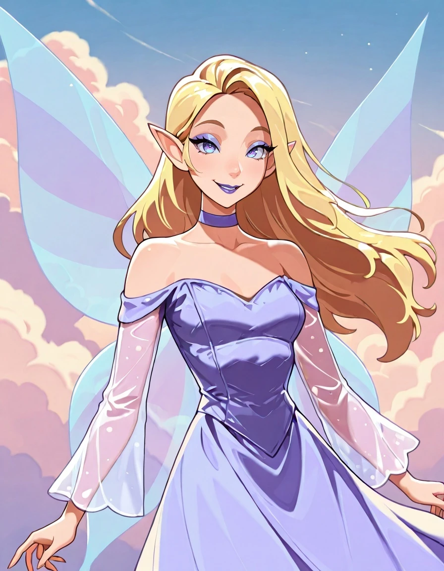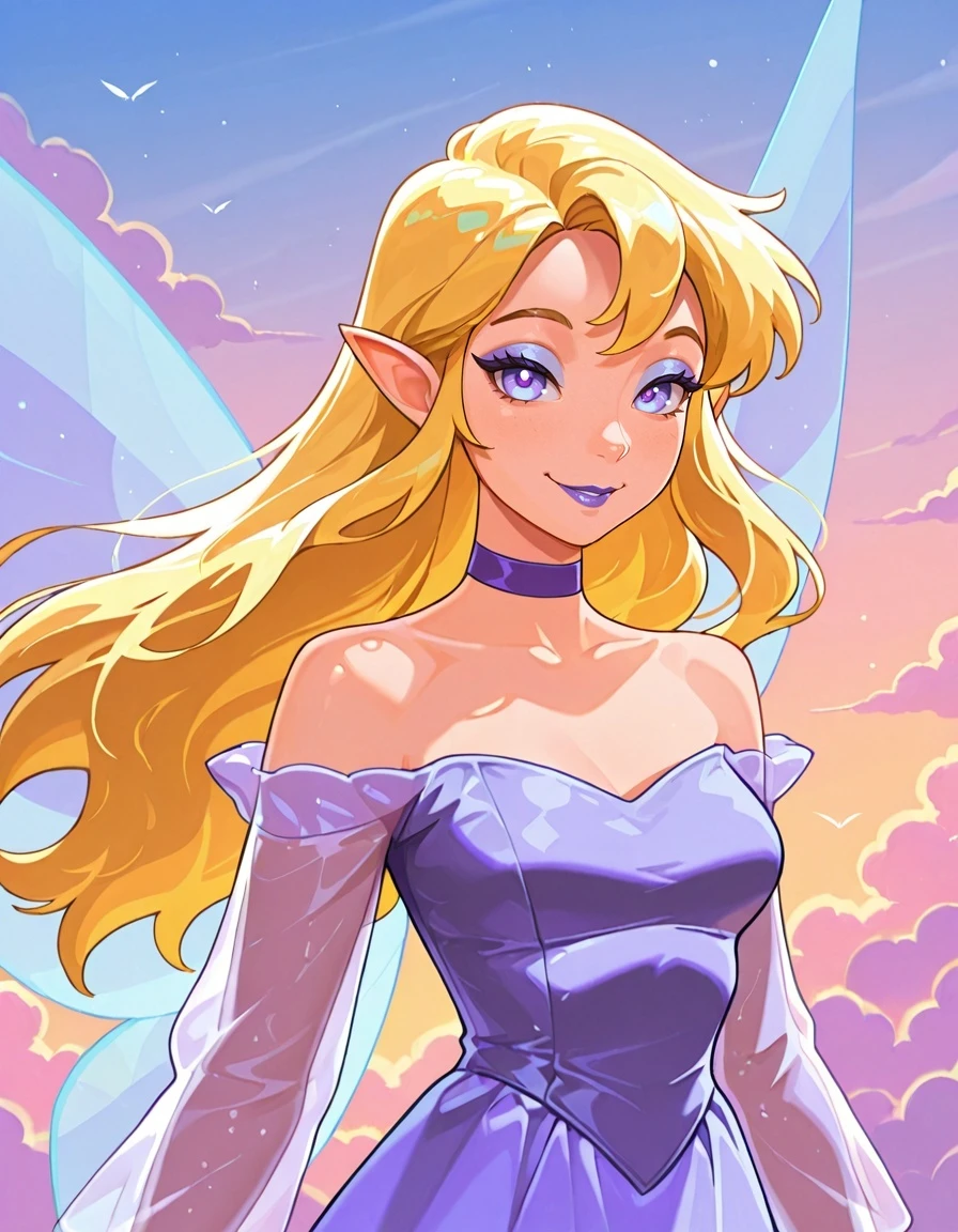 Cl4ssfae, long hair, blonde hair, pointy ears, eyeshadow, purple lips, purple choker,