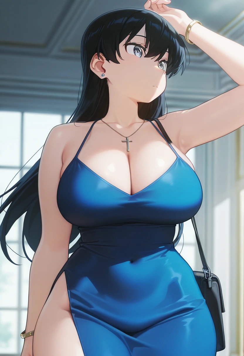 Tags for her look: 1girl, solo, long hair, large breasts, black hair, hair between eyes, grey eyes, thick thighs, straight hair, stud earrings,