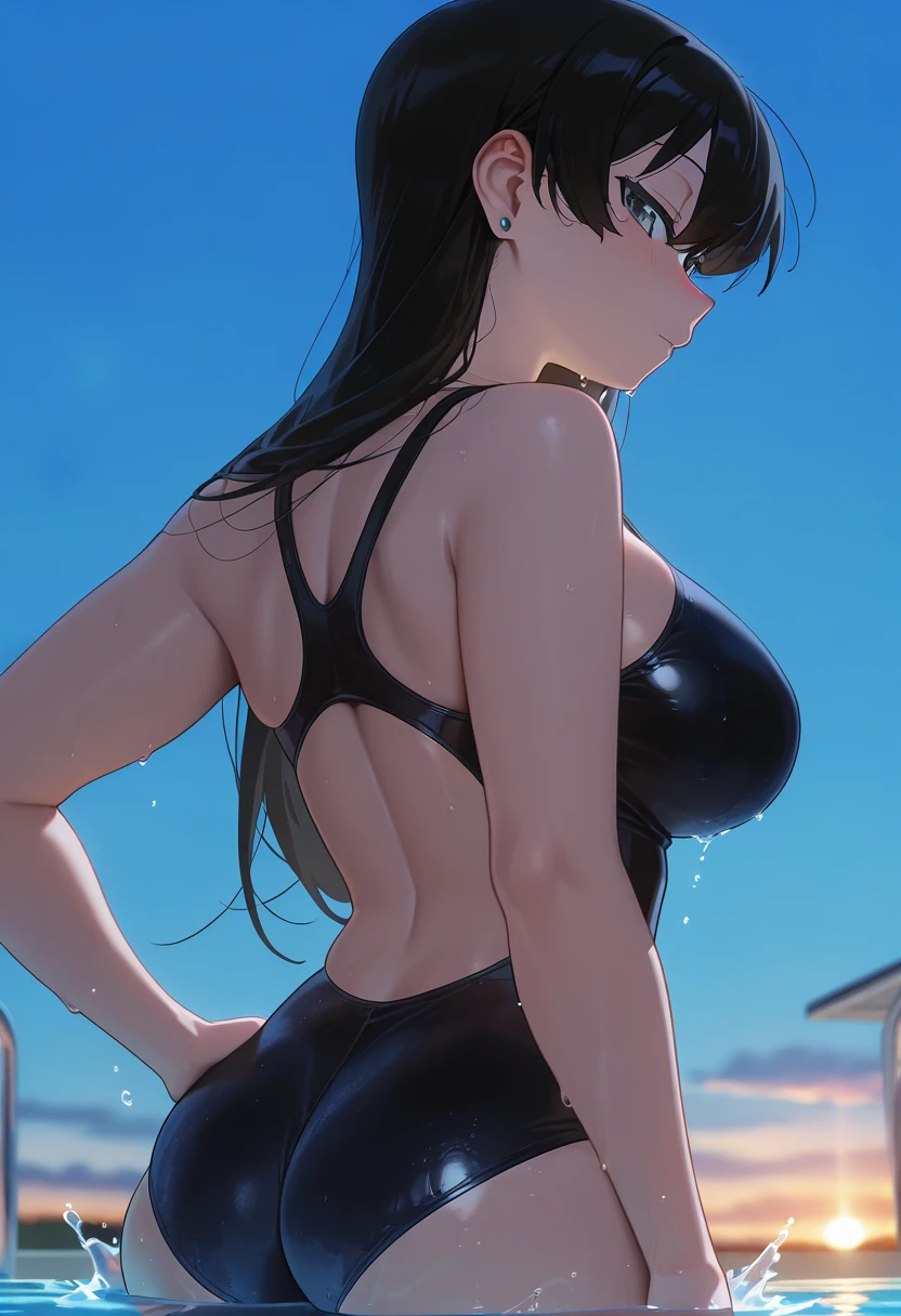 1girl, solo, long hair, large breasts, black hair, hair between eyes, grey eyes, thick thighs, straight hair, stud earrings,