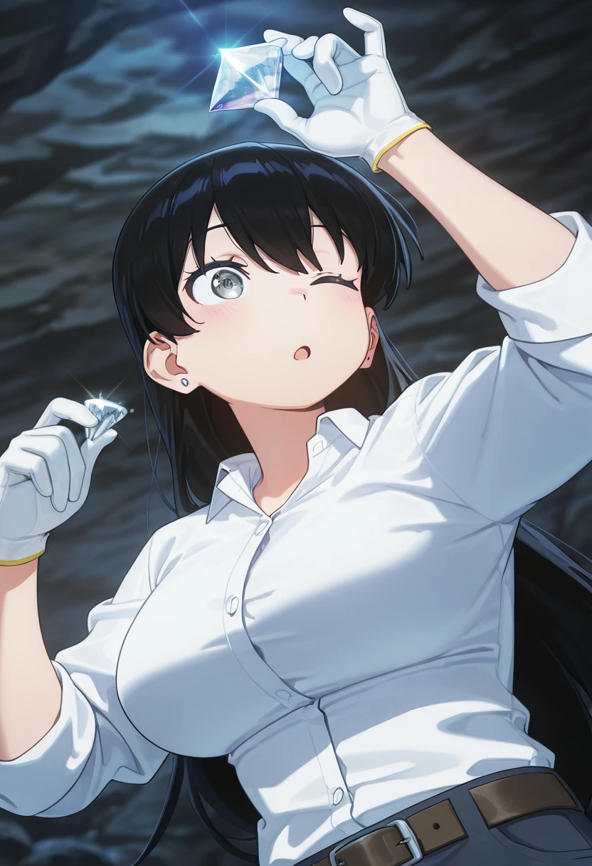Tags for her outfit: long sleeves, white shirt, collared shirt, dress shirt, denim, wing collar, sleeves rolled up, impossible clothes, jeans, belt buckle, blue pants, shirt tucked in, brown belt, tight clothes, jaggy lines,