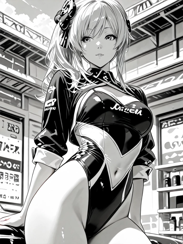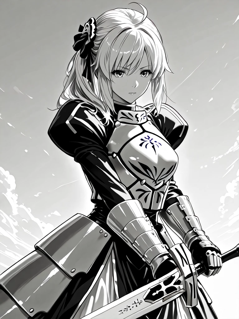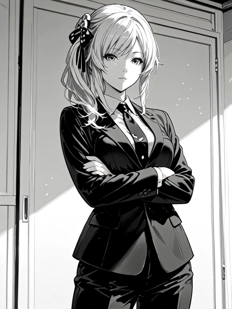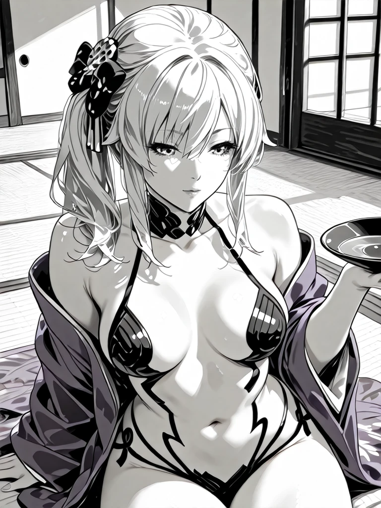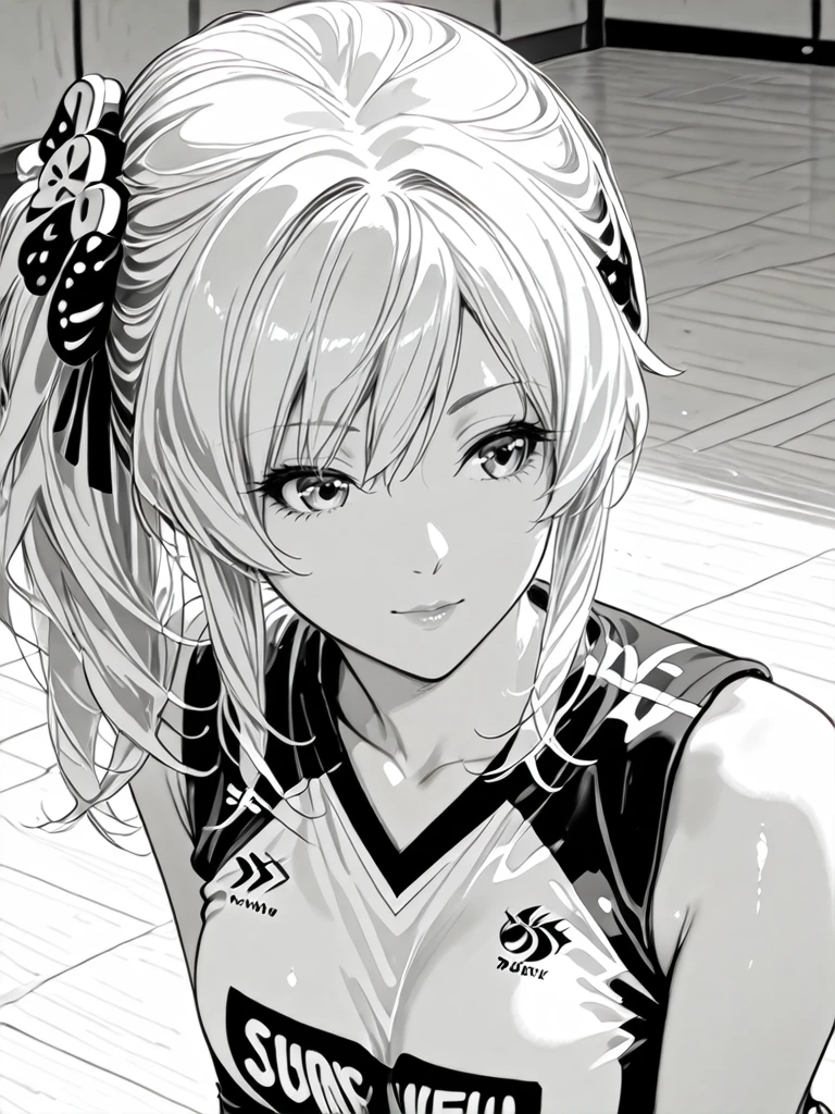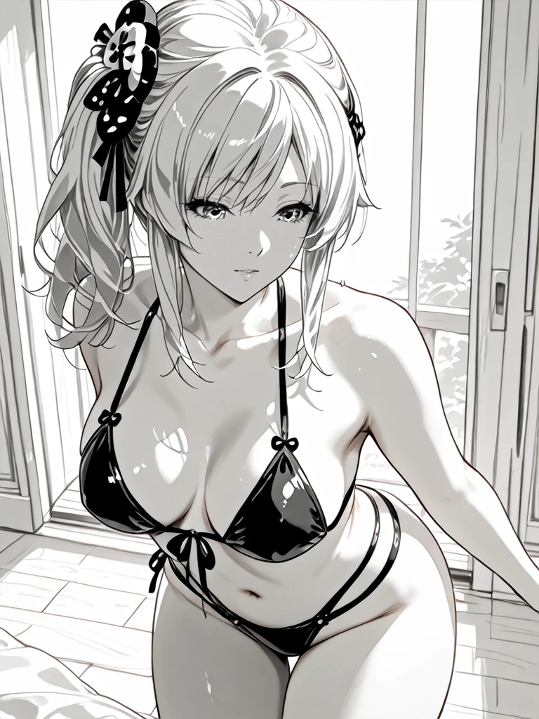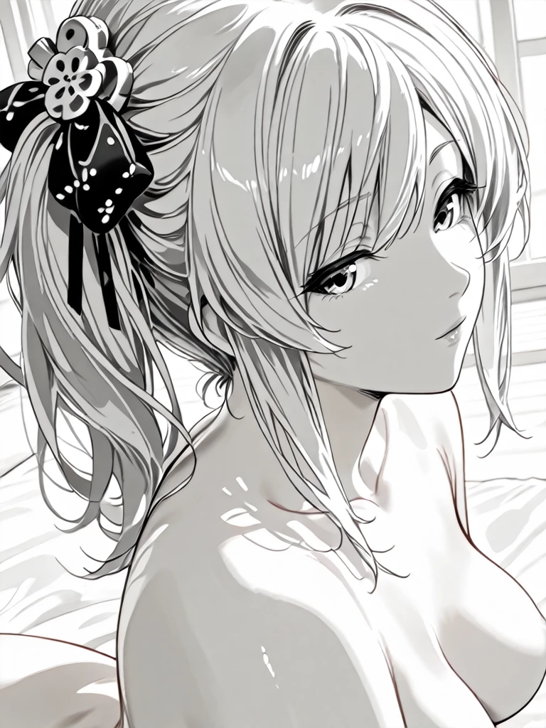 1girl,monochrome,greyscale,eyelash,long hair,silver hair,medium breasts,side ponytail,hair ornament,hair bow,