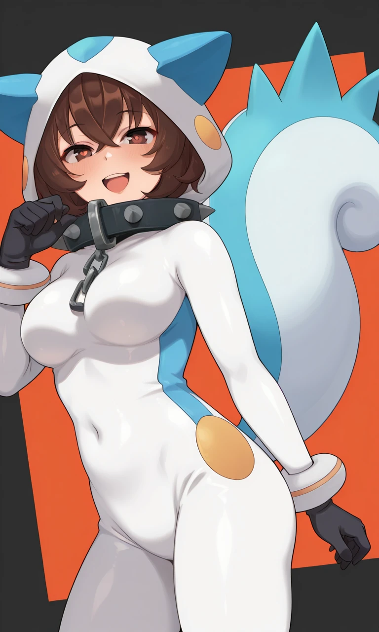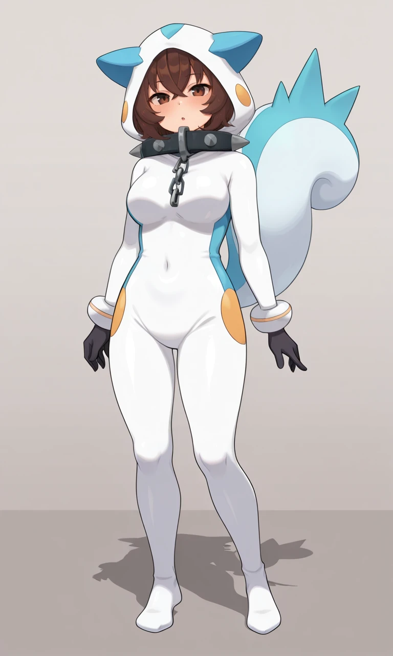 P4ch1G1rl, 1girl, solo, short hair, brown hair, gloves, animal ears, hair between eyes, medium breasts, brown eyes, tail, full body, black gloves, hood, collar, cosplay, covered navel, , chain, hood up, crossed bangs, spikes, white , squirrel tail, animal costume, animal costume