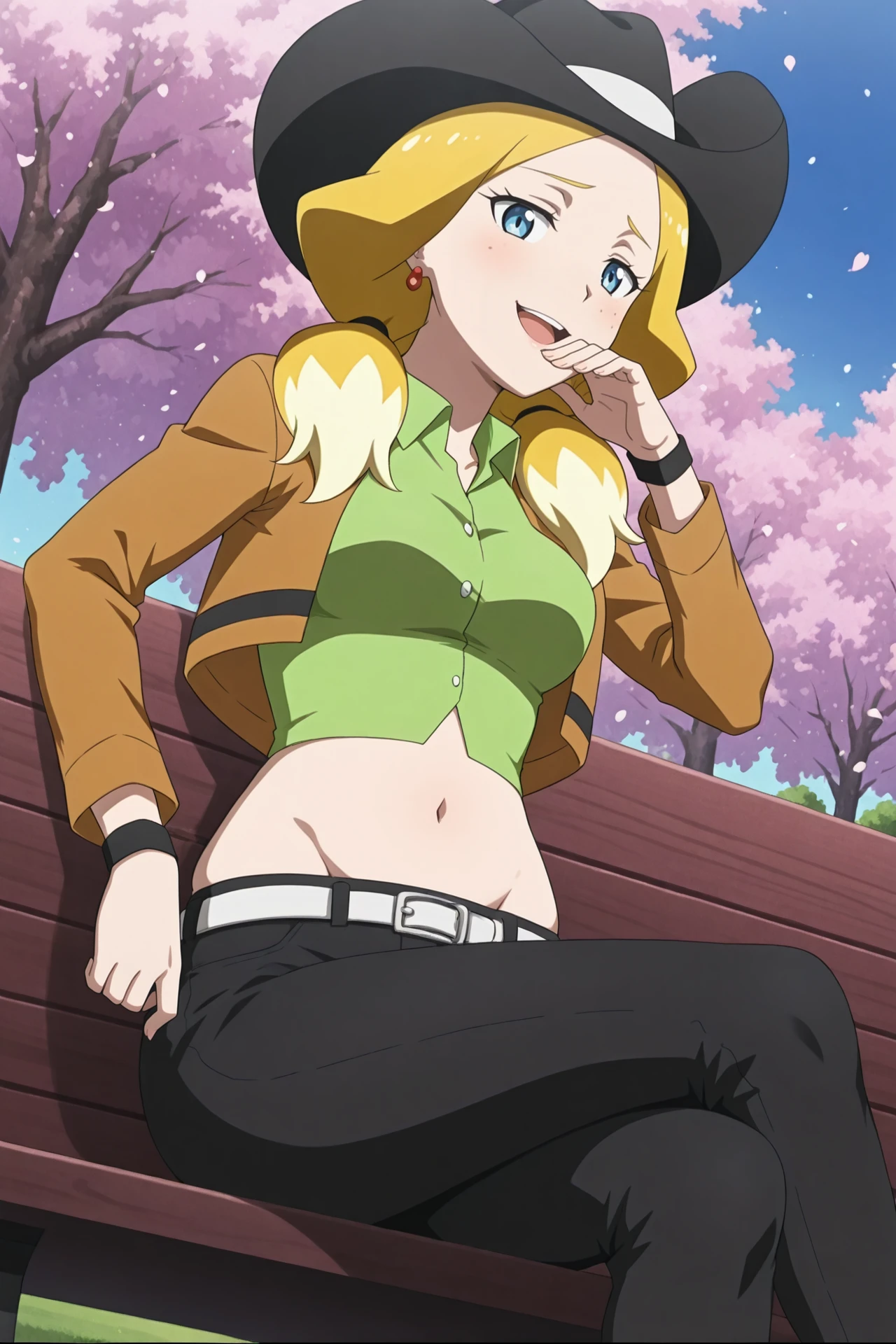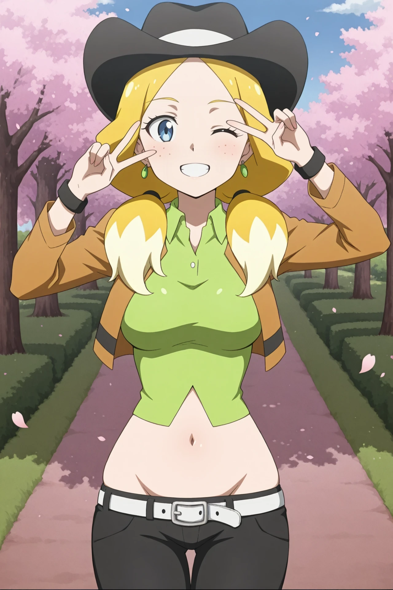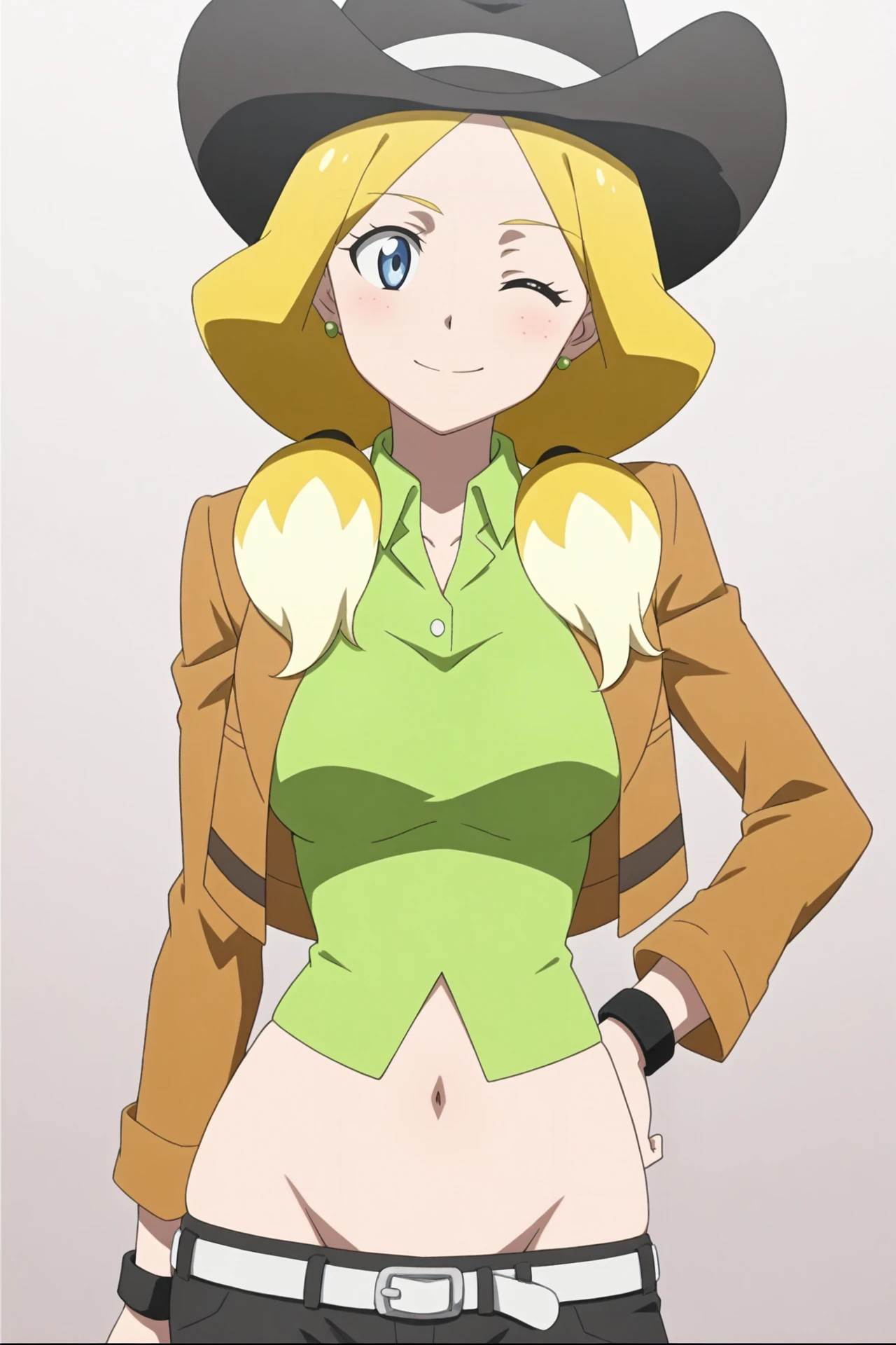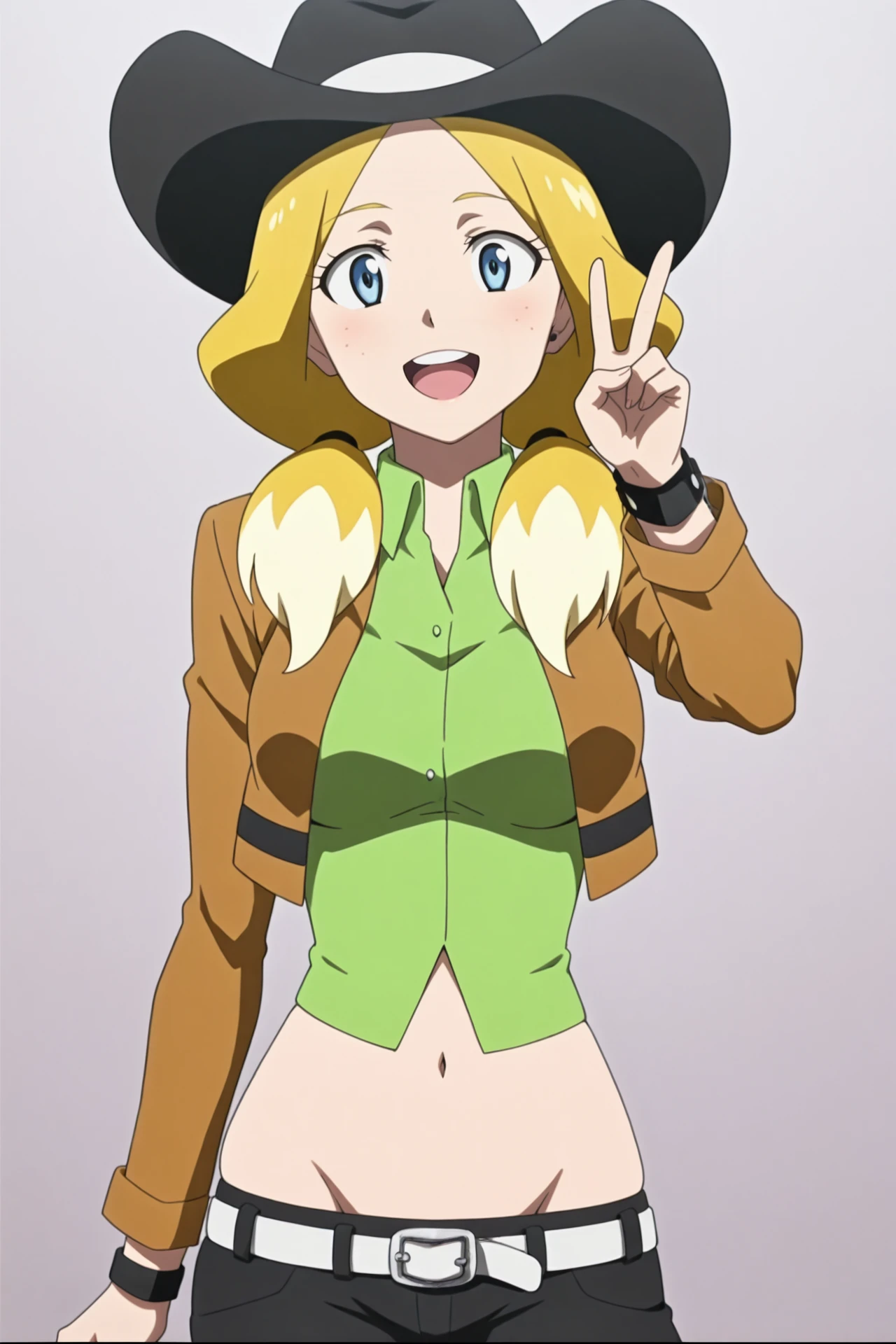 Clothing prompt: cowboy hat, brown jacket, green shirt, collared shirt, crop top, white drawstring, front slit, long sleeves, bracelets, white belt, belt buckle, black pants, cowboy boots, white boots