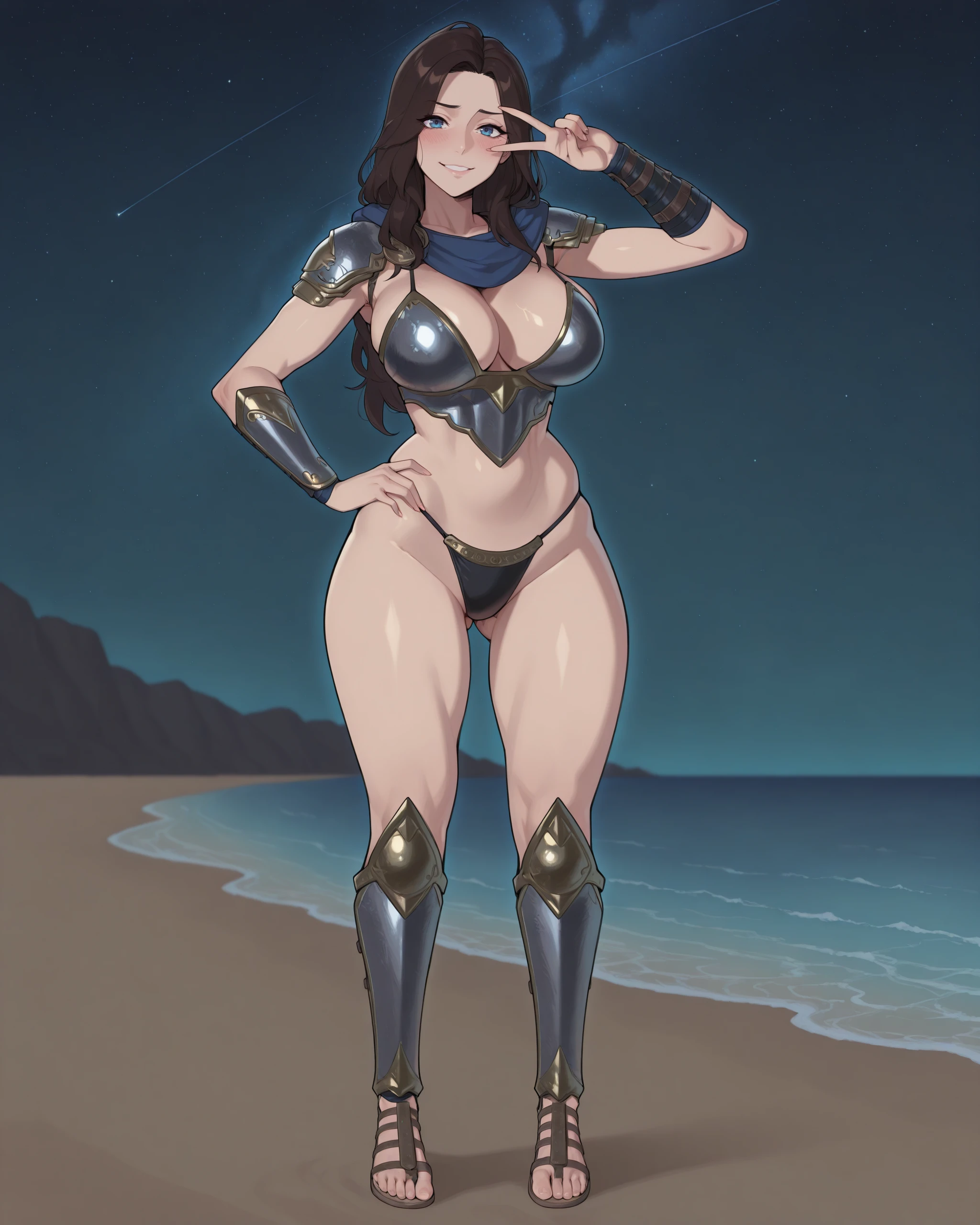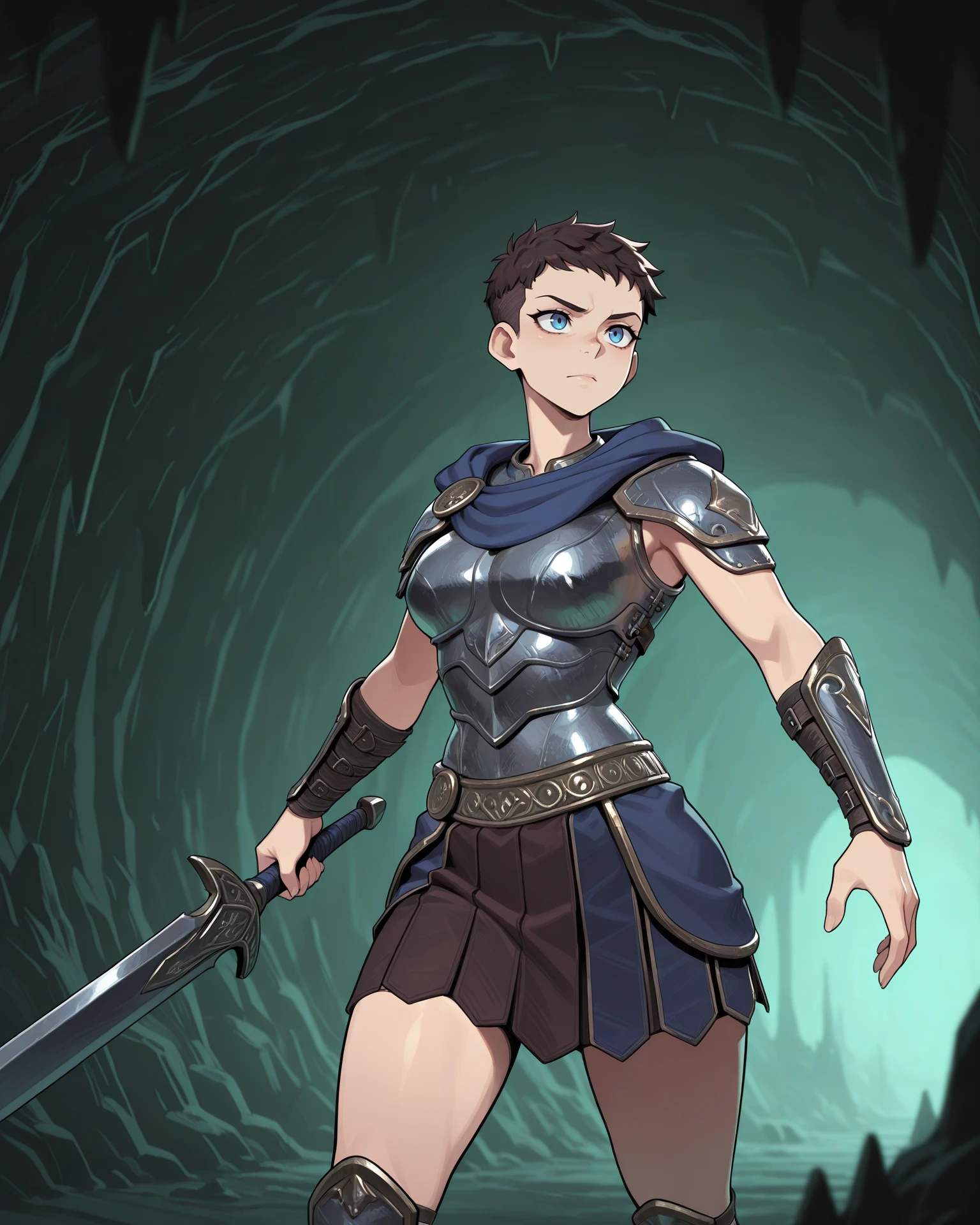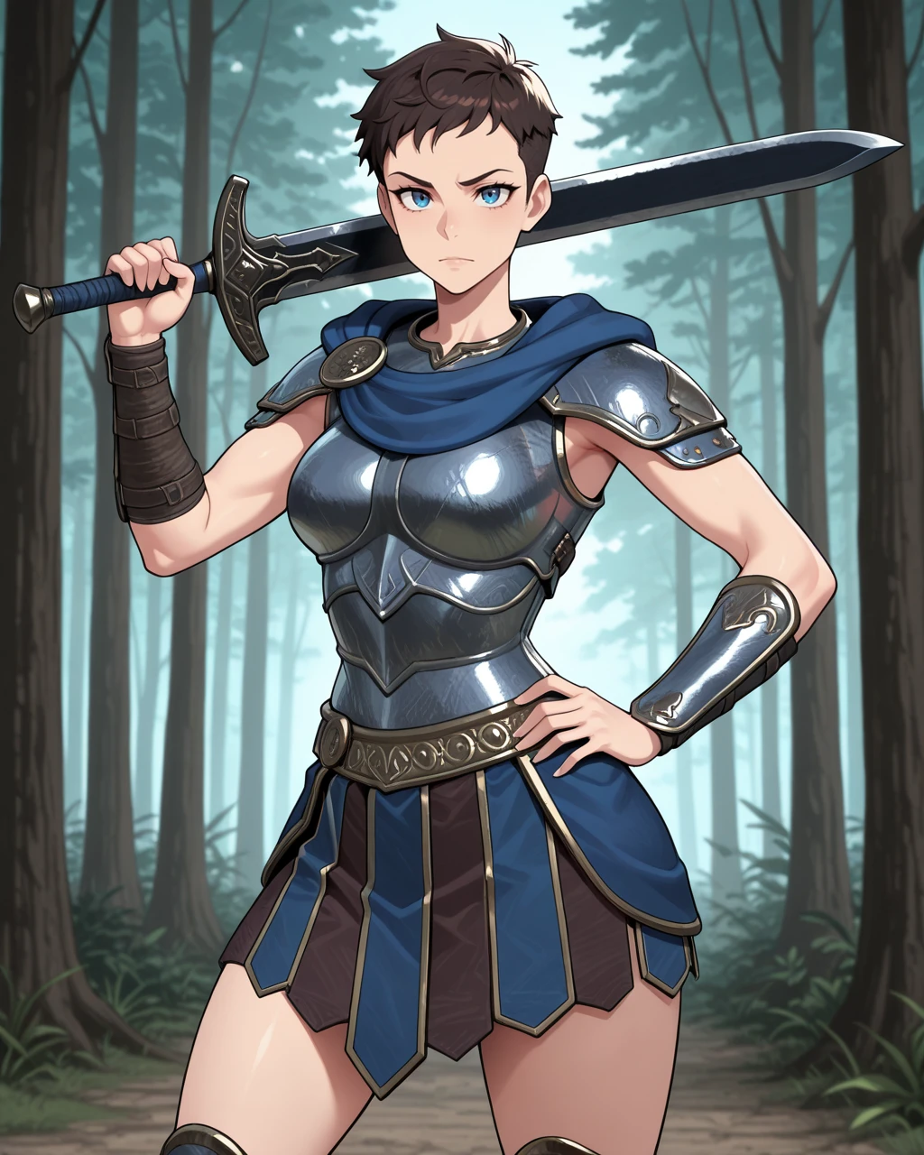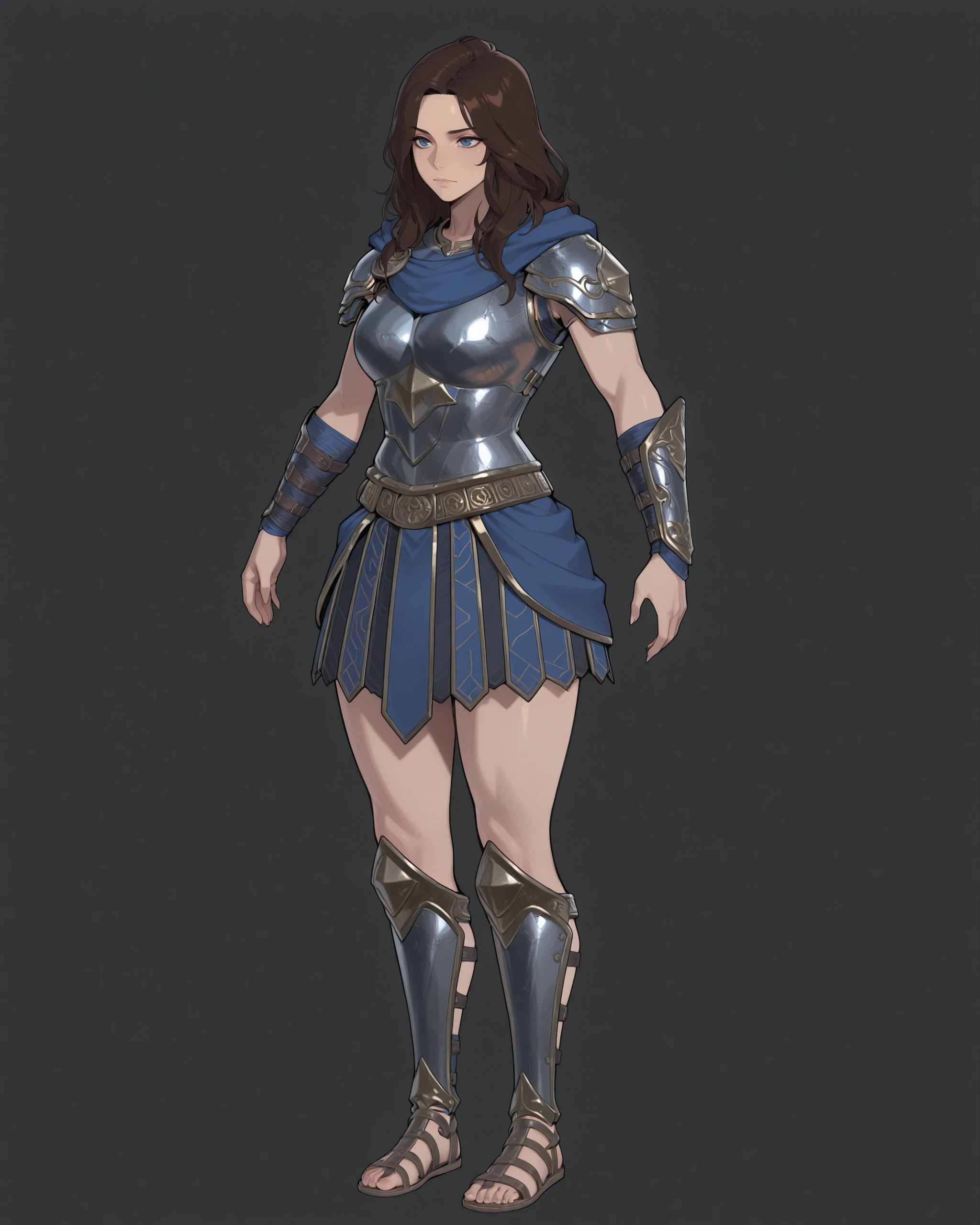 blue eyes, vambraces, skirt, blue scarf, dark brown hair, gladiator sandals, hood down, shoulder plates, shin guards, breastplate