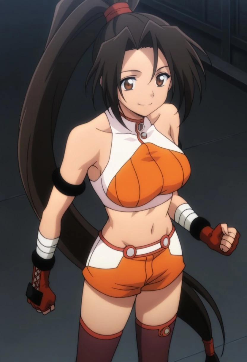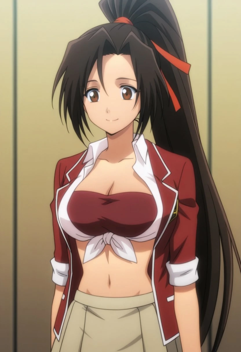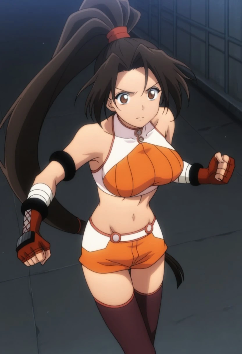 moxiaofang, high ponytail, large breasts, midriff, navel,