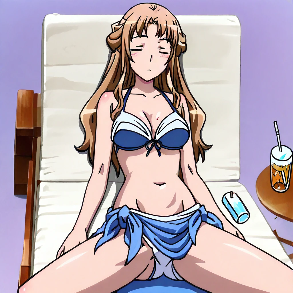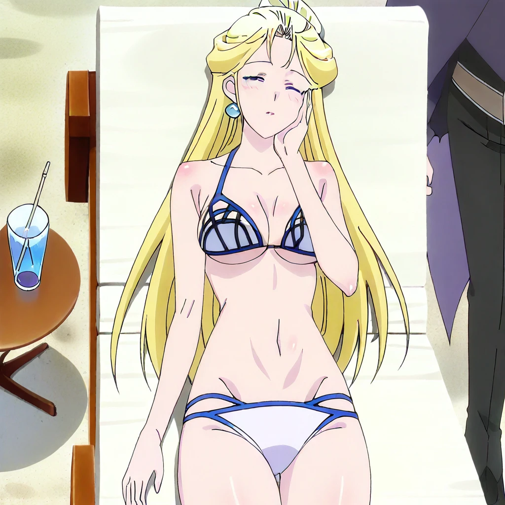 source_anime, yuel ernea belfast, long hair, blonde hair, large breasts, ponytail, closed eyes, very long hair, half updo, mature female, yuel_earrings, yuel_bikini, navel, from above, yuel_sarong, lying on lounge_chair, full of body, table, drink, shadow, smile