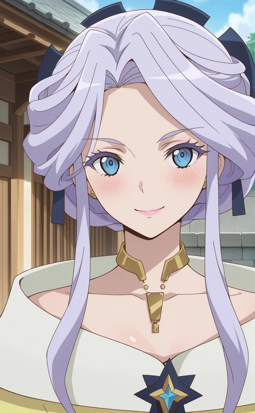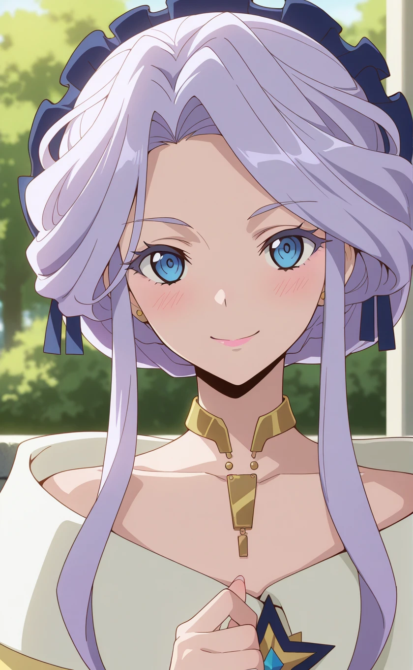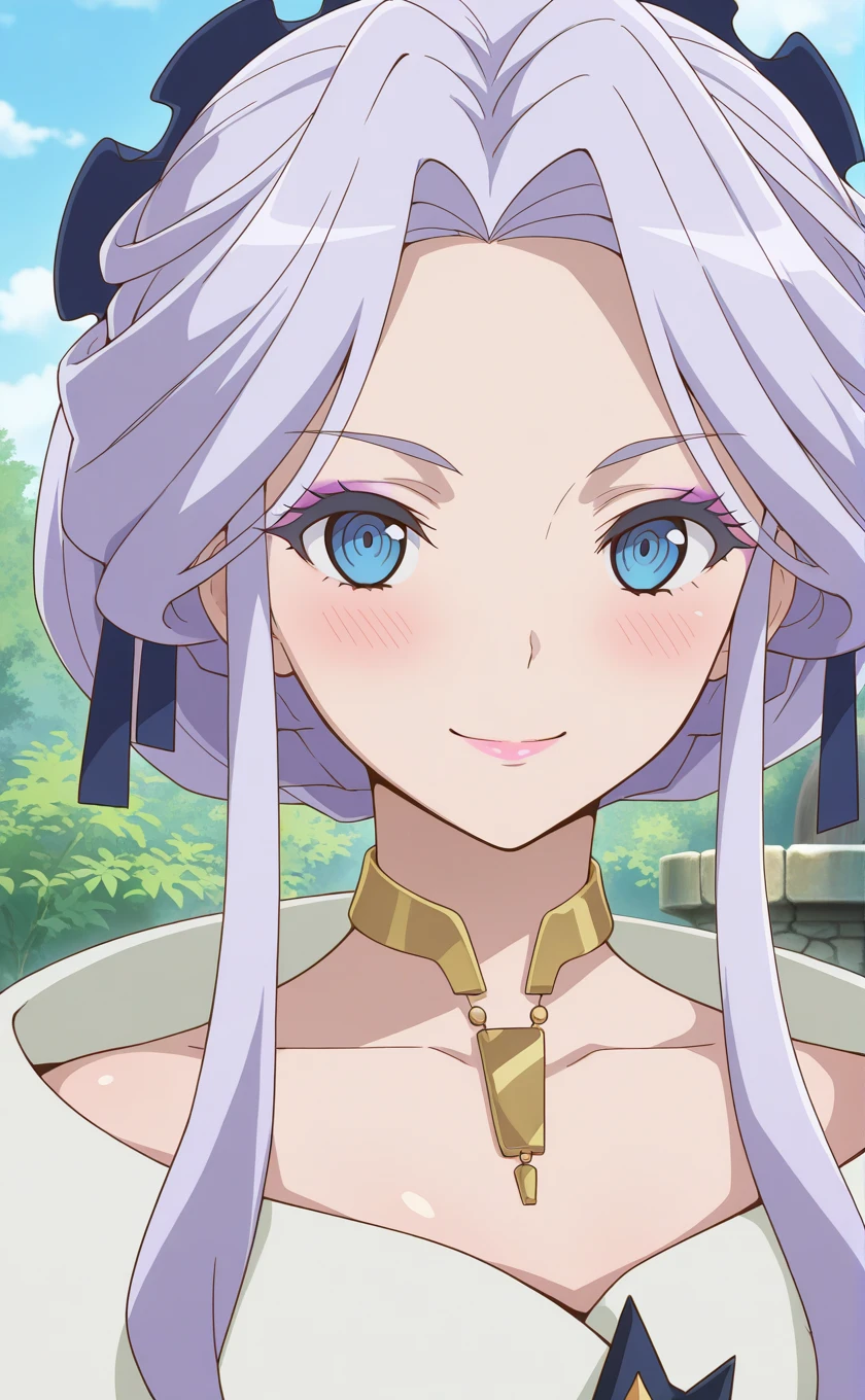 long hair,purple hair,hair up,hair ornament,makeup,sidelocks,blue eyes