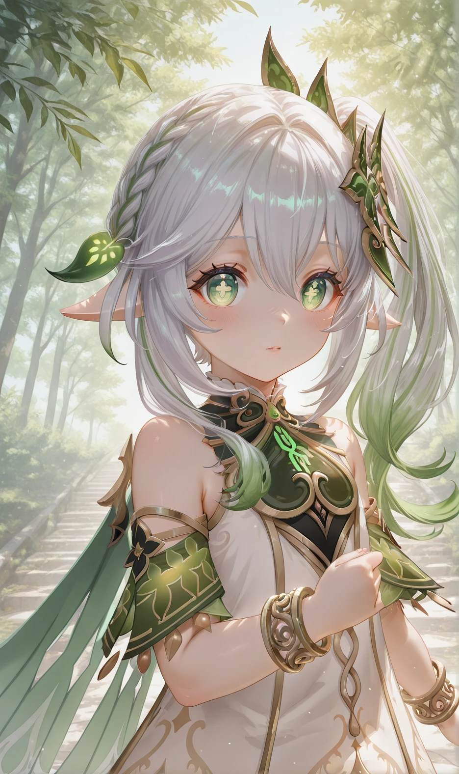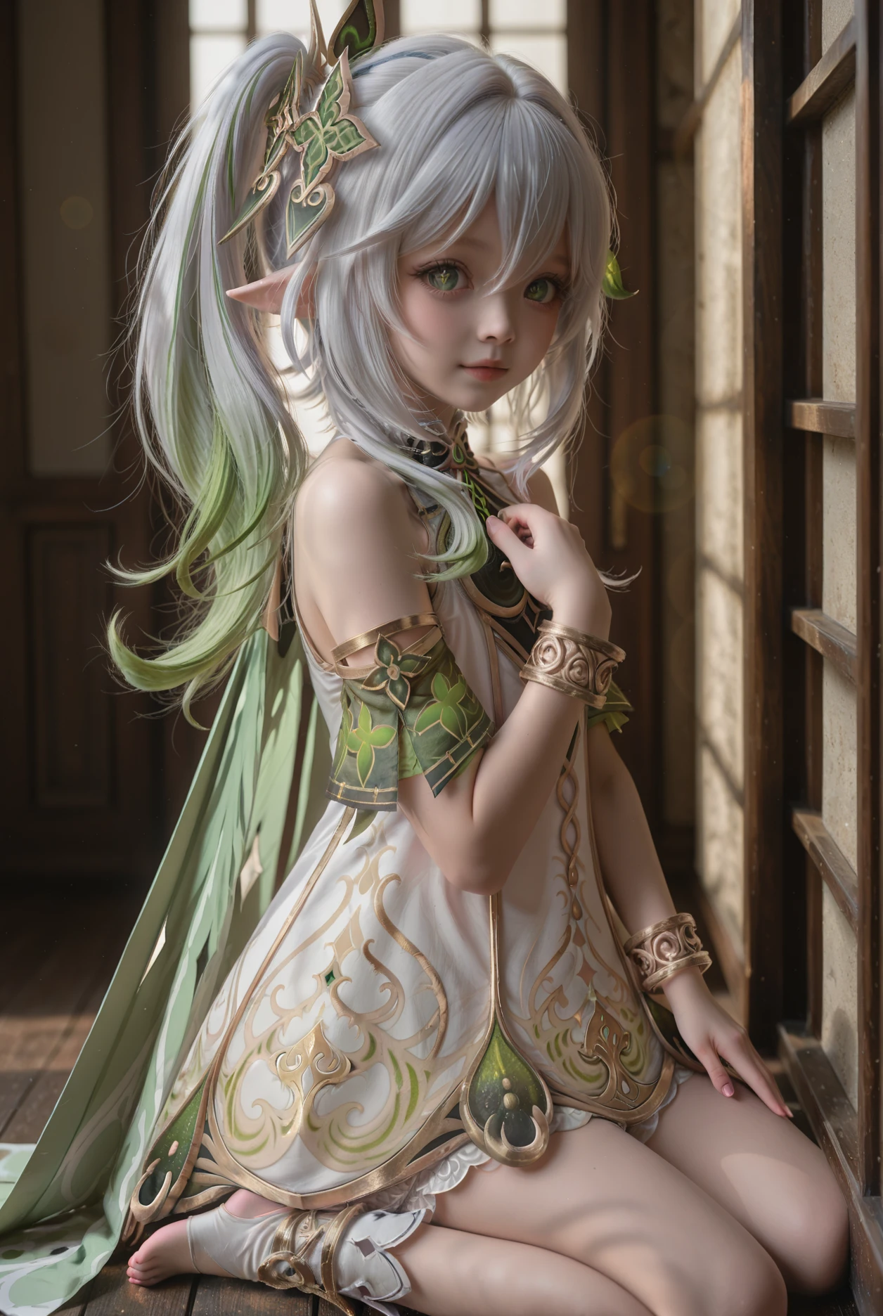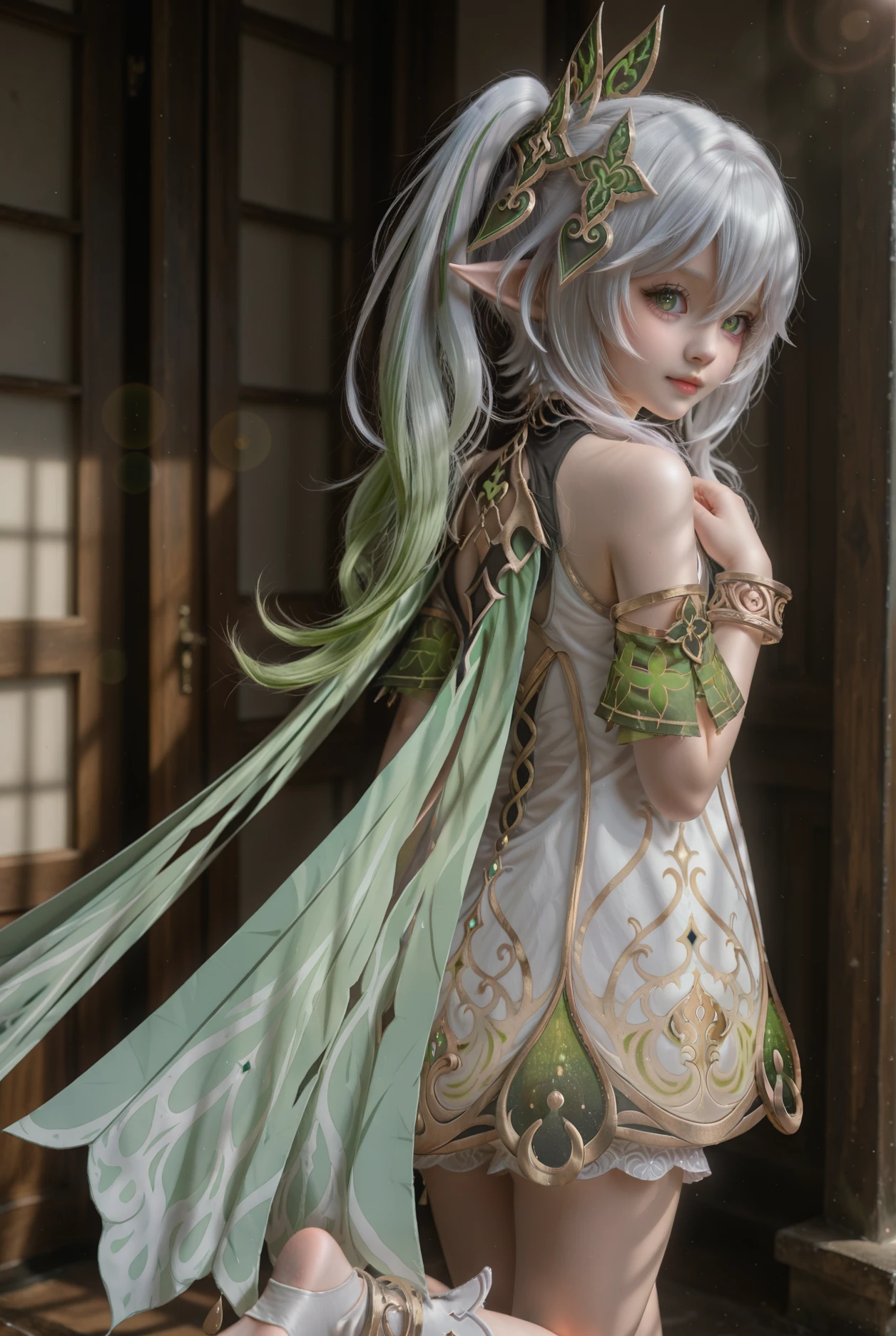 NahidaV2,1girl,nahida \(genshin impact\),solo,green eyes,dress,pointy ears,symbol-shaped pupils,white dress,side ponytail,bracelet,multicolored hair,jewelry,toeless footwear,white hair,cross-shaped pupils,gradient hair,hair ornament,long hair,green hair,detached sleeves,white bloomers,green cape,toeless legwear,leaf hair ornament,green sleeves,grey hair,stirrup legwear,white footwear,sleeveless dress,underwear,