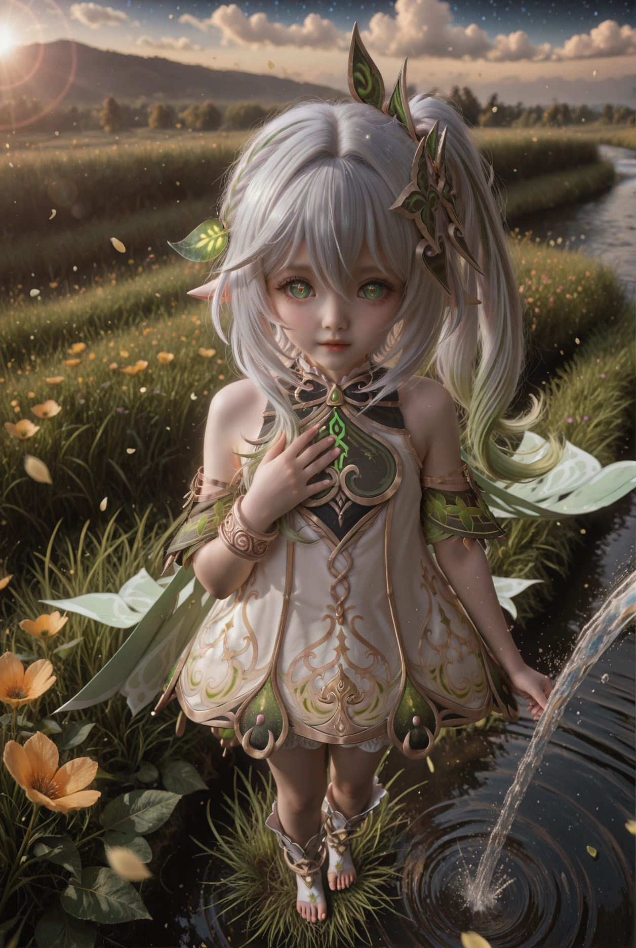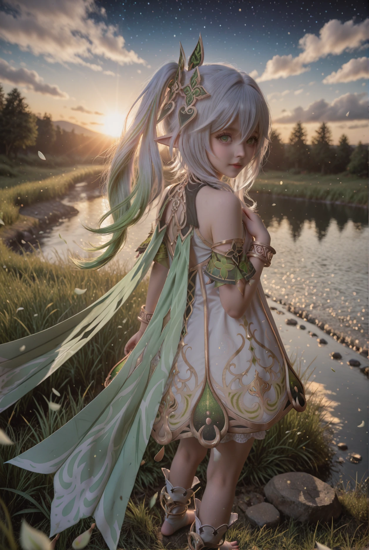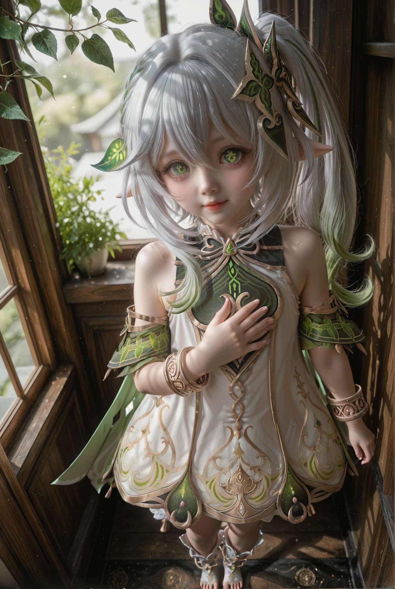 NahidaV2,1girl,nahida \(genshin impact\),solo,green eyes,dress,pointy ears,symbol-shaped pupils,white dress,side ponytail,bracelet,multicolored hair,jewelry,toeless footwear,white hair,cross-shaped pupils,gradient hair,hair ornament,long hair,green hair,detached sleeves,white bloomers,green cape,toeless legwear,leaf hair ornament,green sleeves,grey hair,stirrup legwear,white footwear,sleeveless dress,underwear,