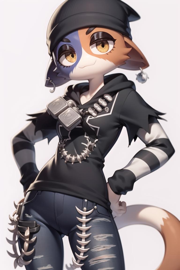 Likes to generate noses. For noseless version, try emphasizing 'noseless' and add 'nose, animal nose' to negative prompt.