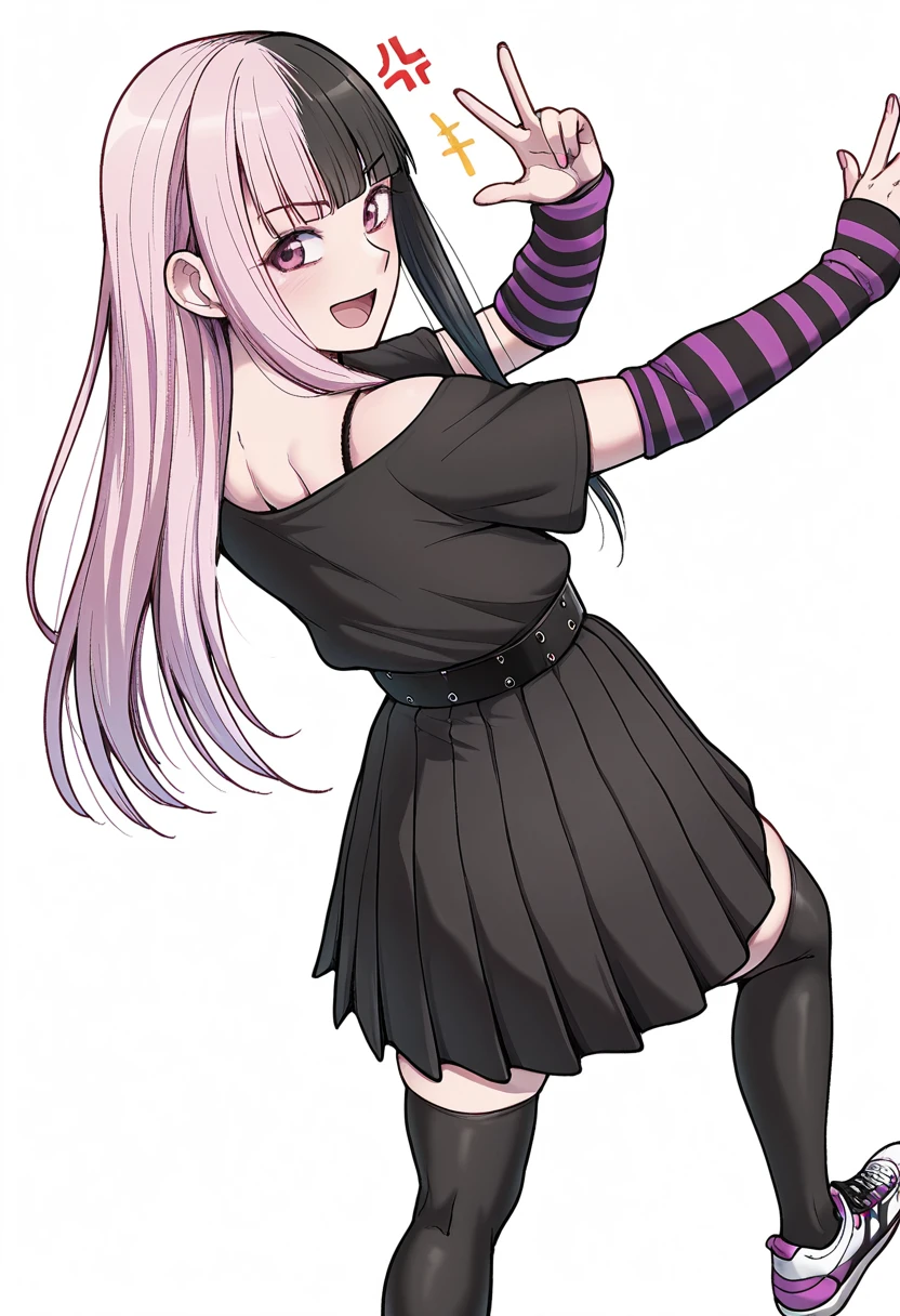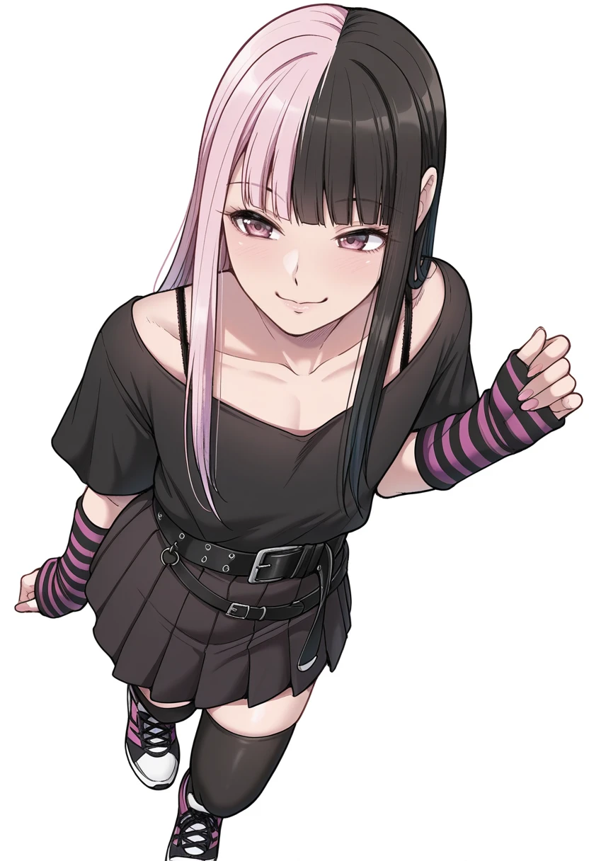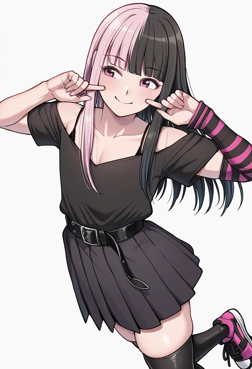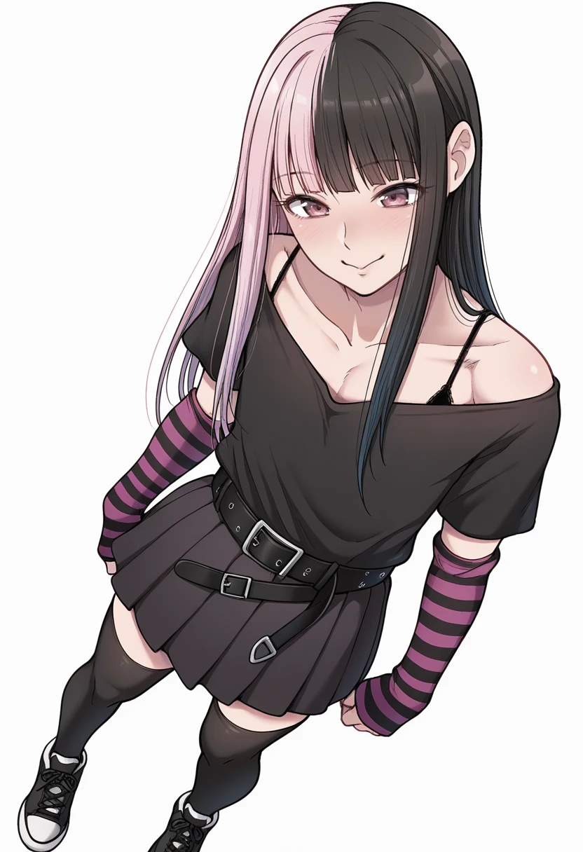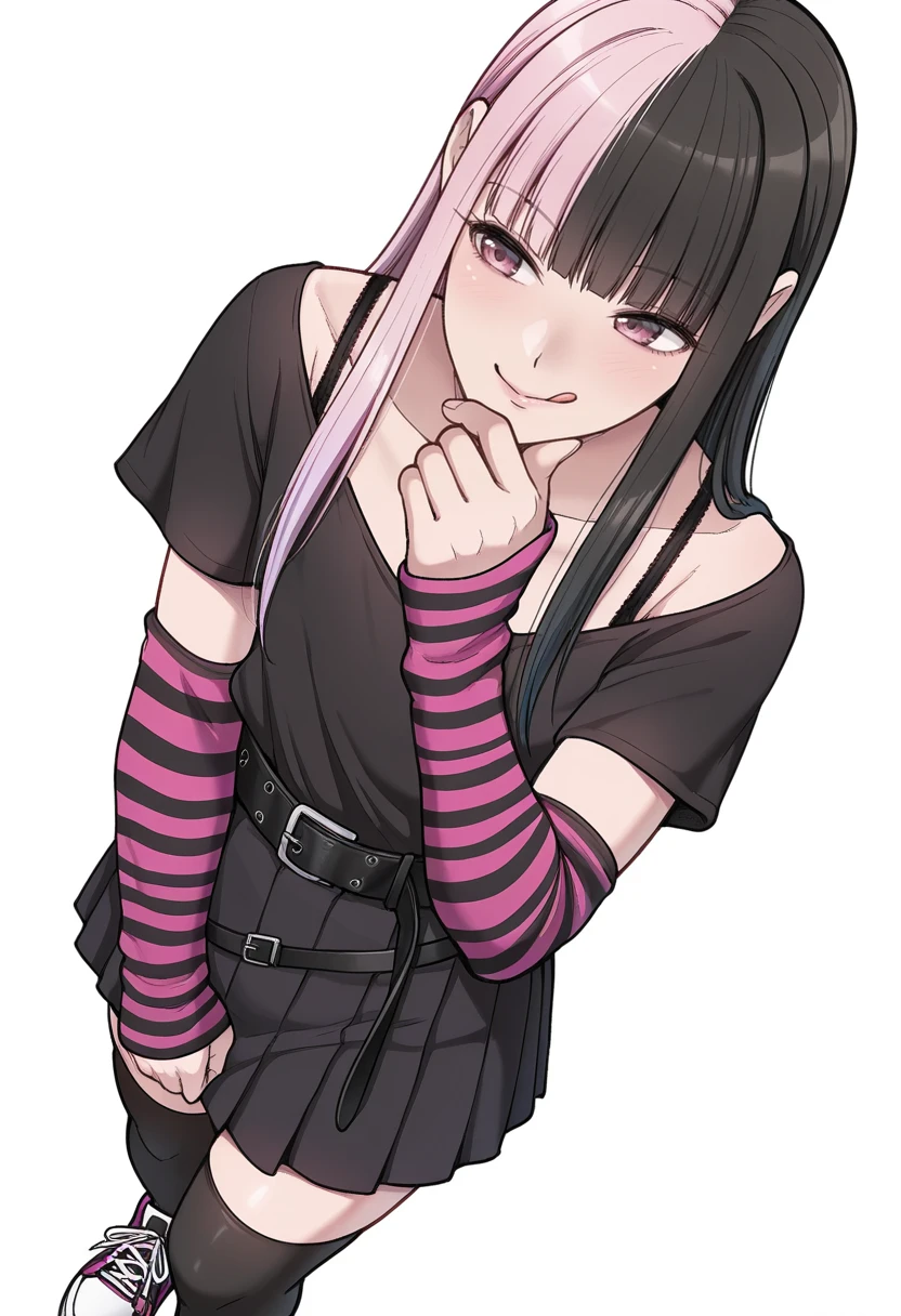 black shirt, off-shoulder shirt, short sleeves, shirt tucked in,pleated skirt, belt, thighhighs,striped arm warmers,bra strap,sneakers, Description