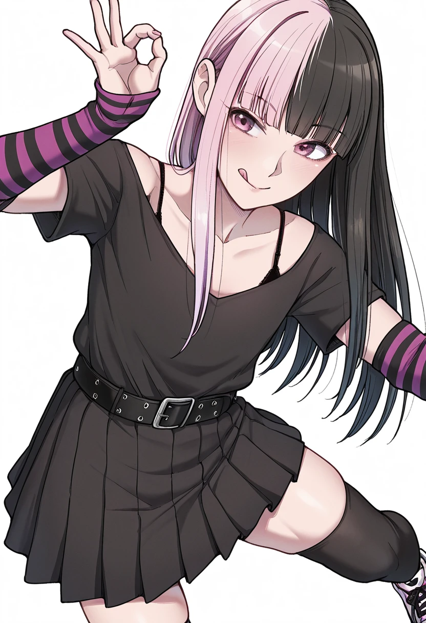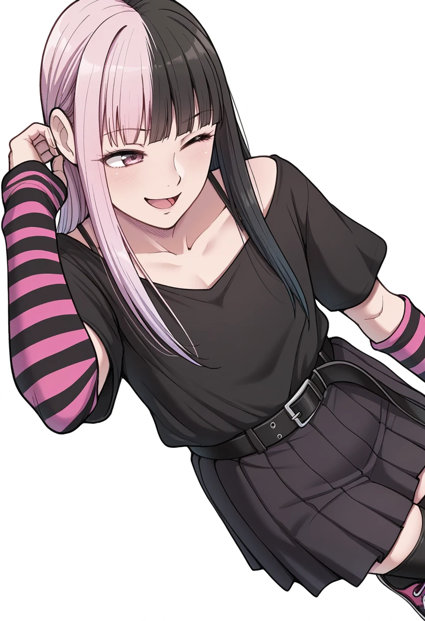 dangerousfemb_cnr, 1boy,androgynous,pink hair,split-color hair, black hair, long hair, blunt bangs, pink eyes, otoko no ko, Default Outfit
