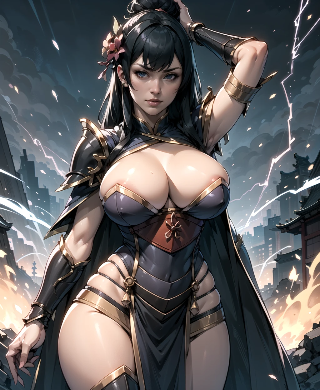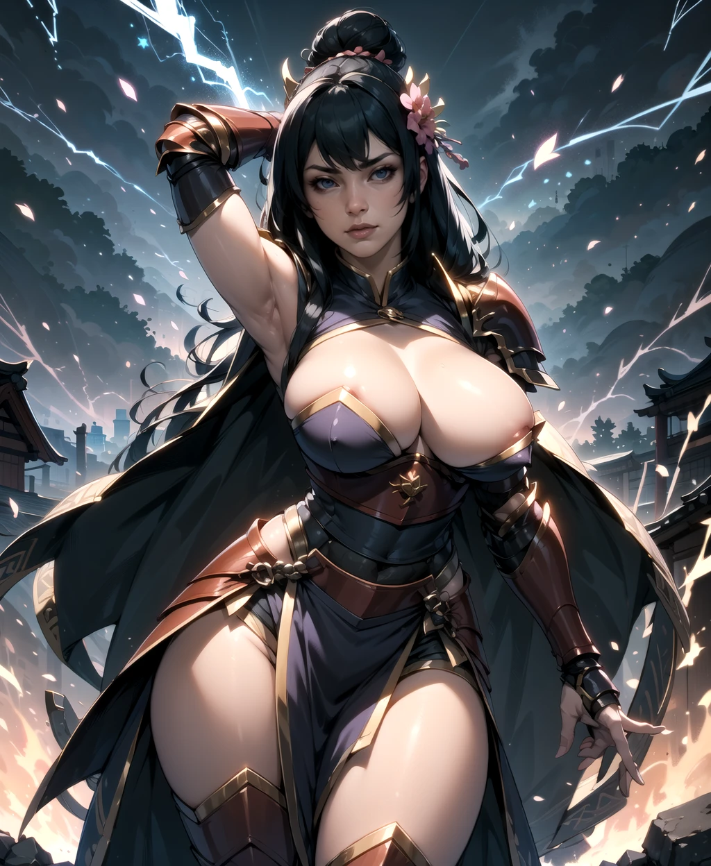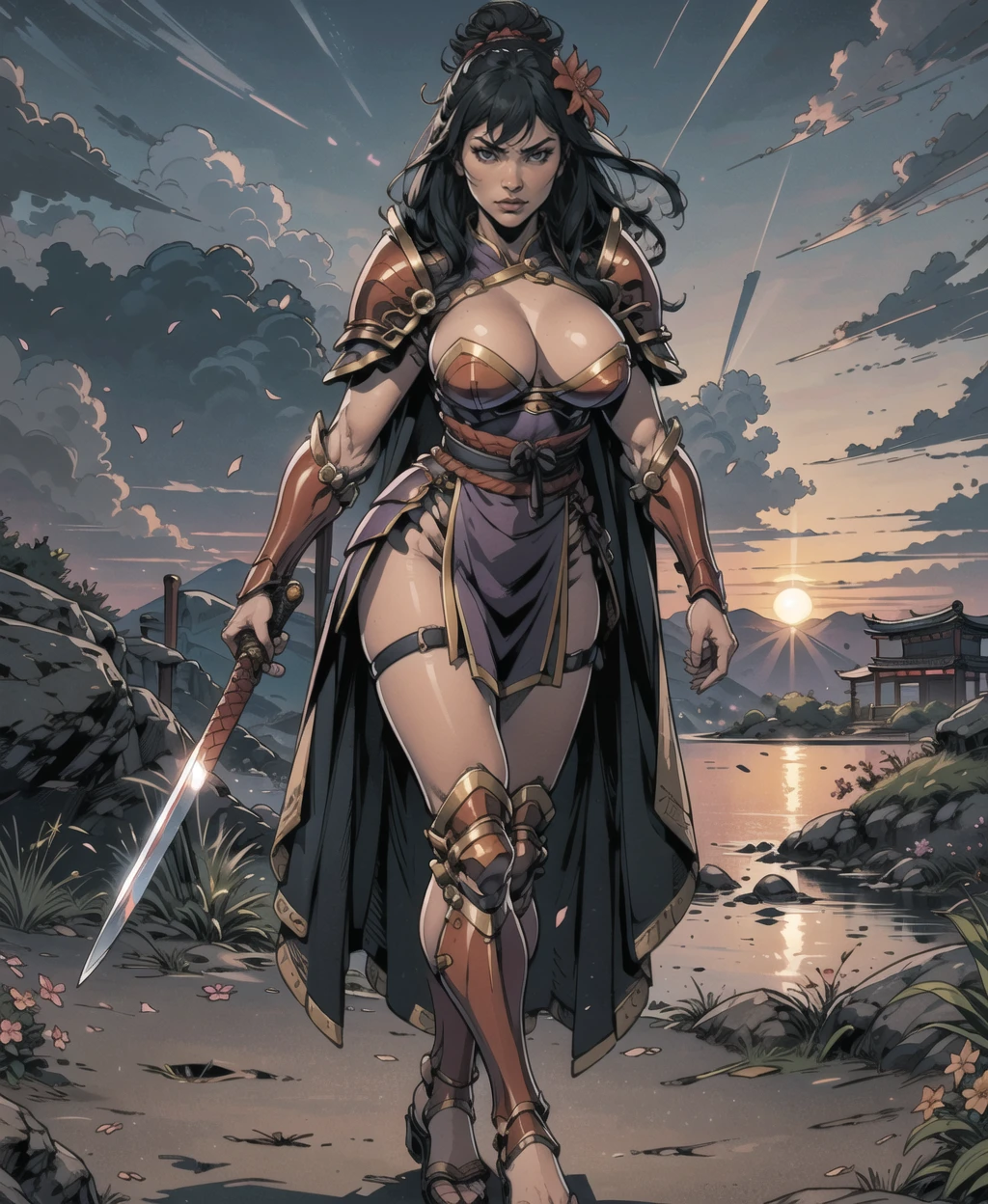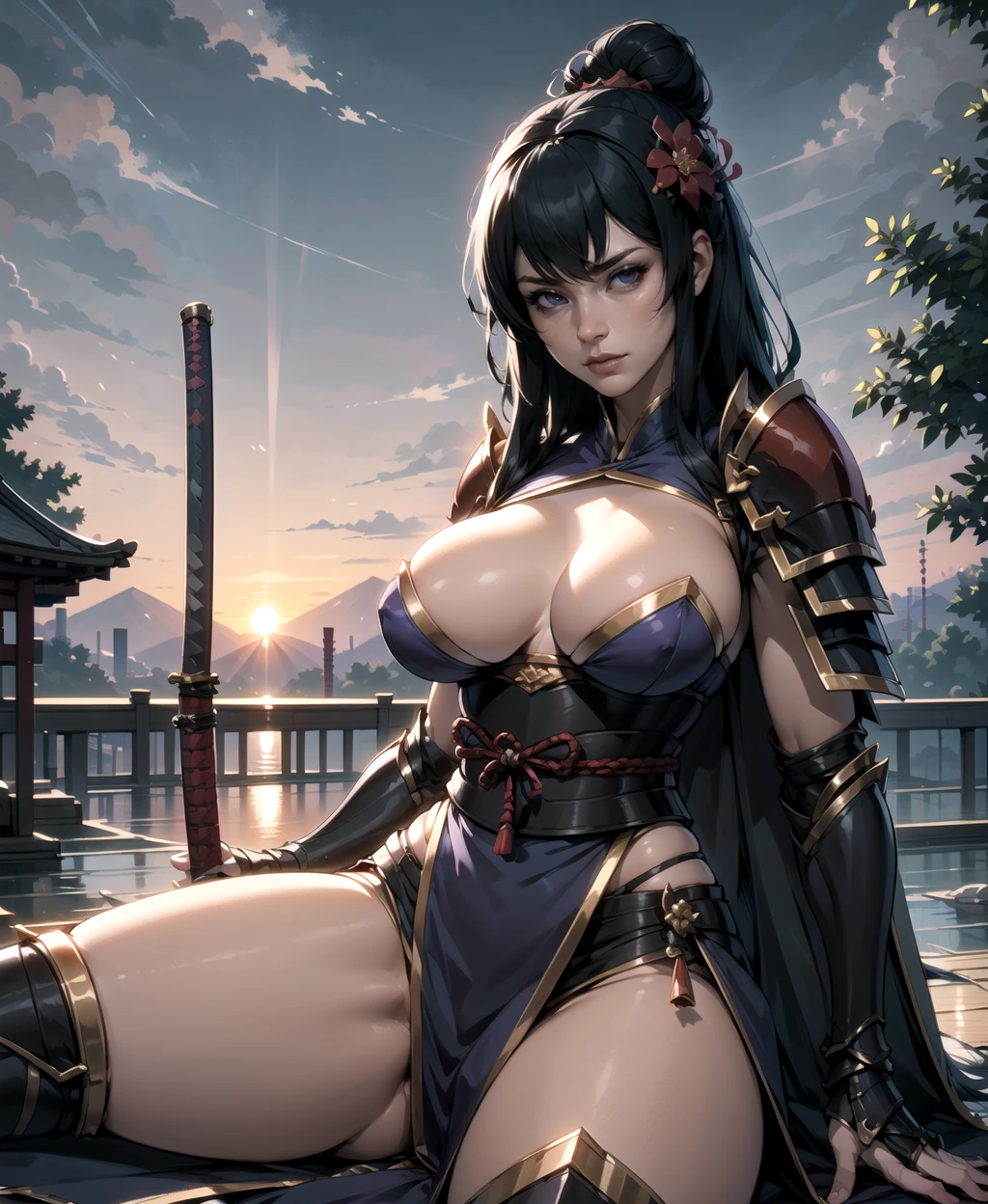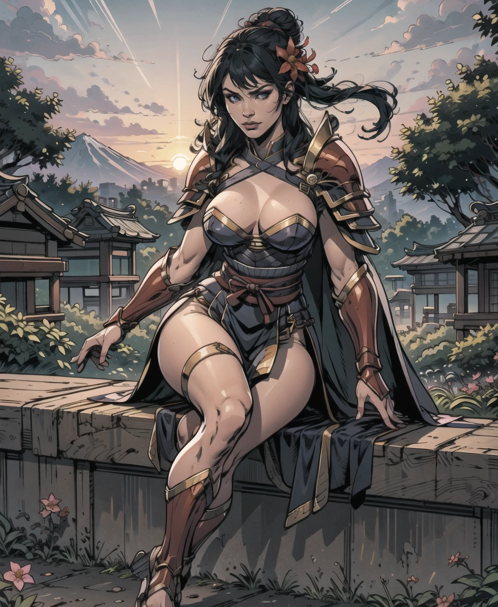 long hair, black hair, hair bun, hair flower, armor, sandals, shoulder armor, japanese armor, pelvic curtain, coat,leg armor,