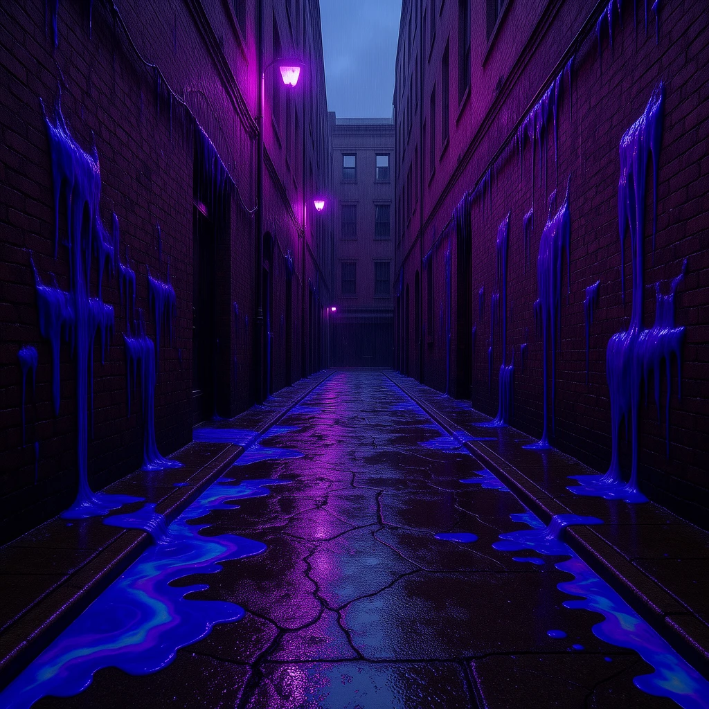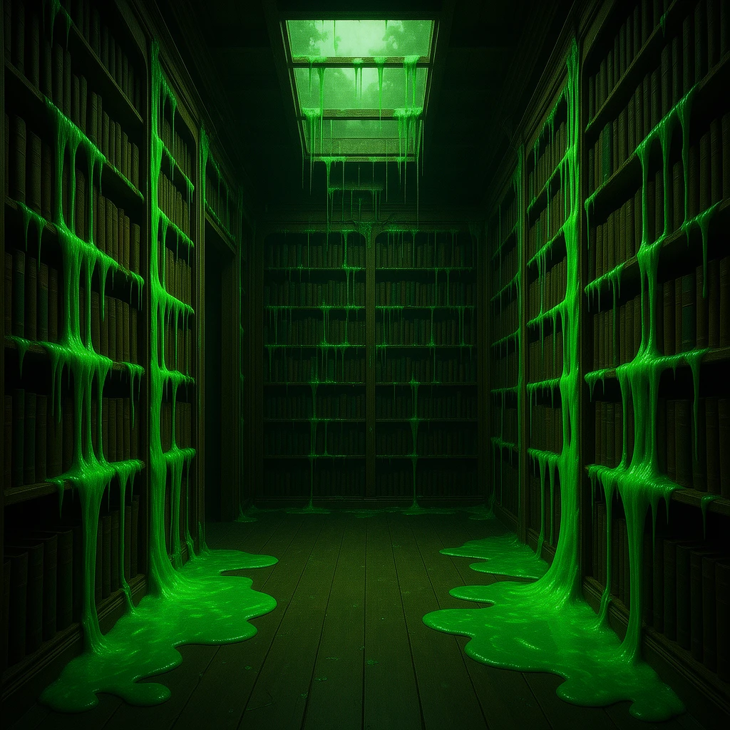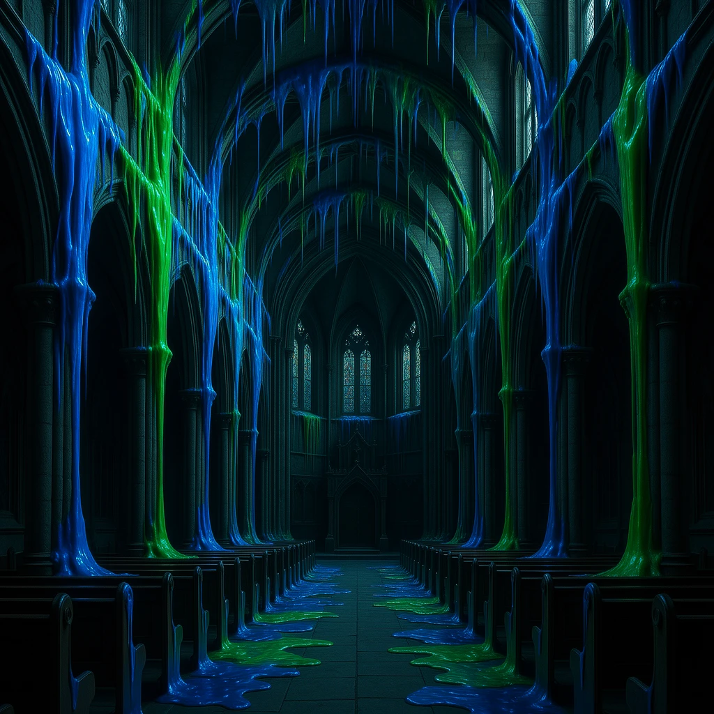The walls are weeping. Not water. Something that seepingβthick bioluminescent fluid, iridescent oil slicks, toxic sludge, chemical runoff. Every surface leaks: stone bleeds neon, metal weeps rainbow film, wood oozes with corrupted life.
