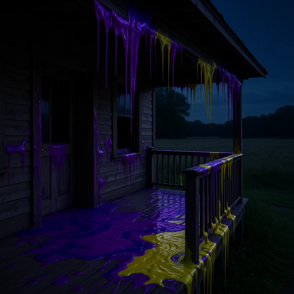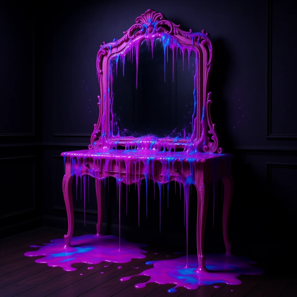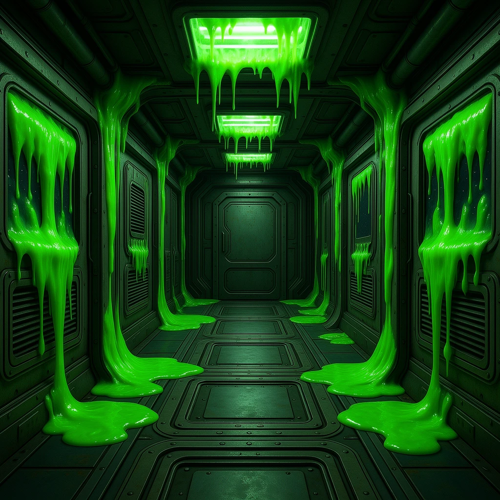 The walls are weeping. Not water. Something that seepingβthick bioluminescent fluid, iridescent oil slicks, toxic sludge, chemical runoff. Every surface leaks: stone bleeds neon, metal weeps rainbow film, wood oozes with corrupted life.