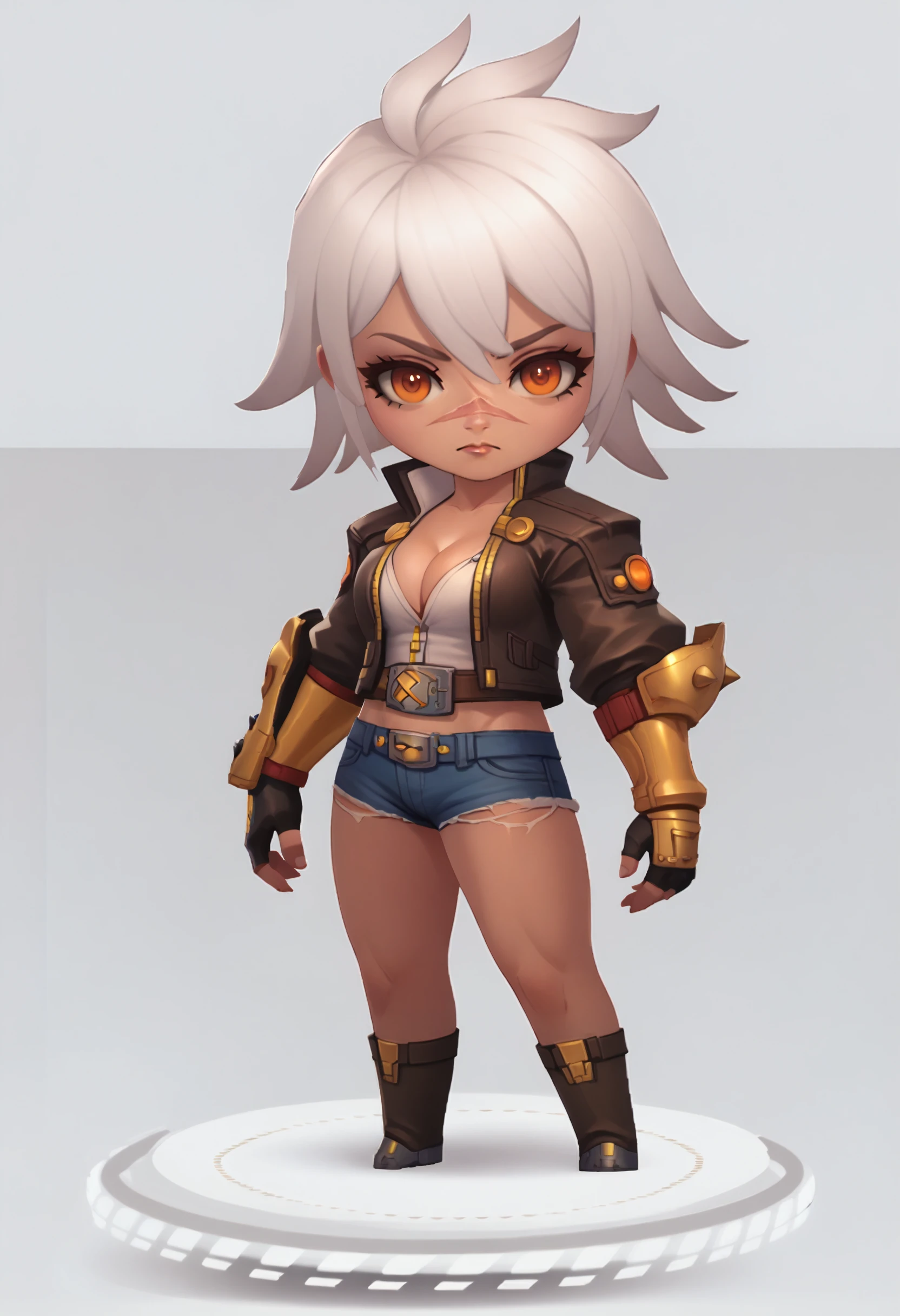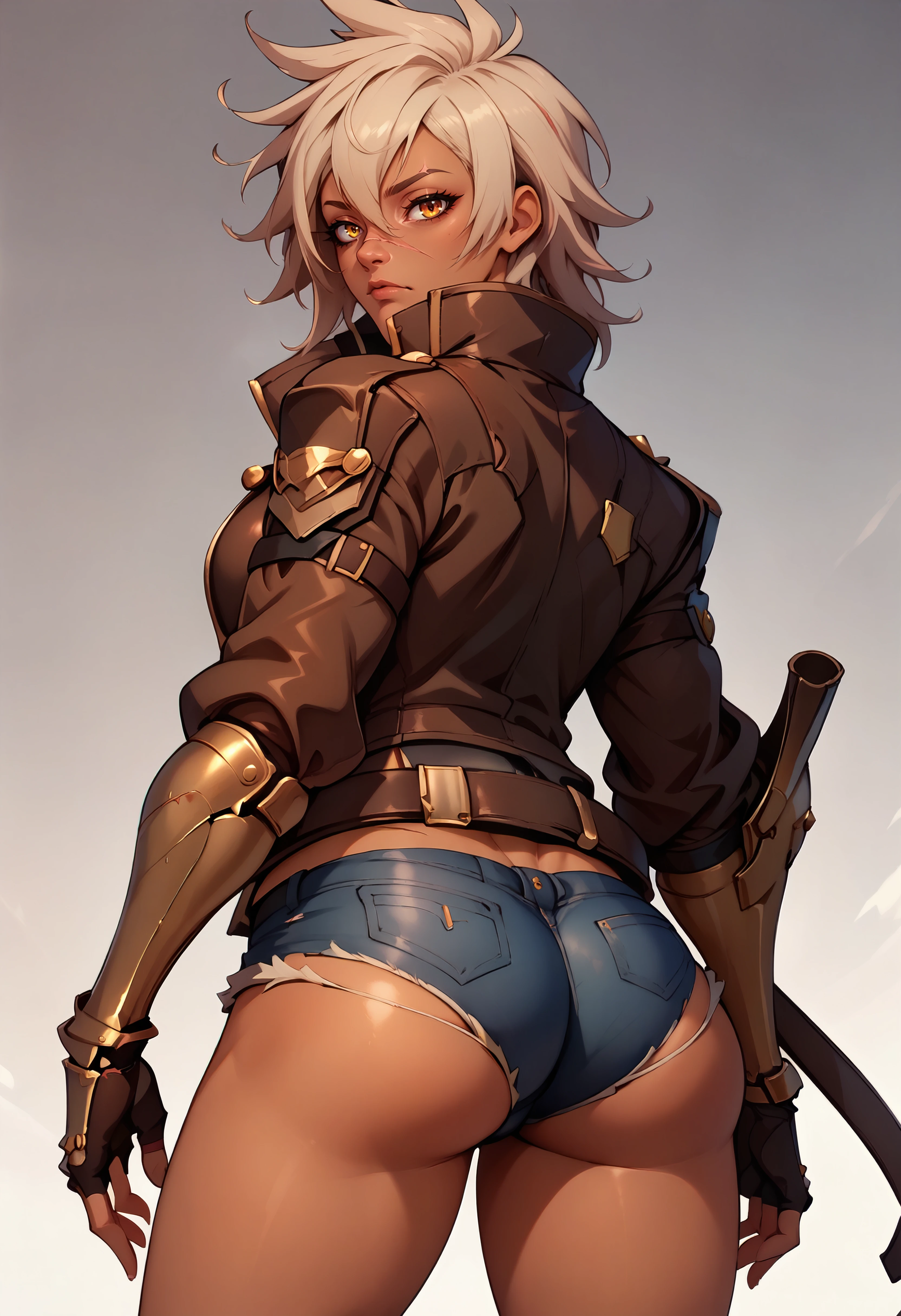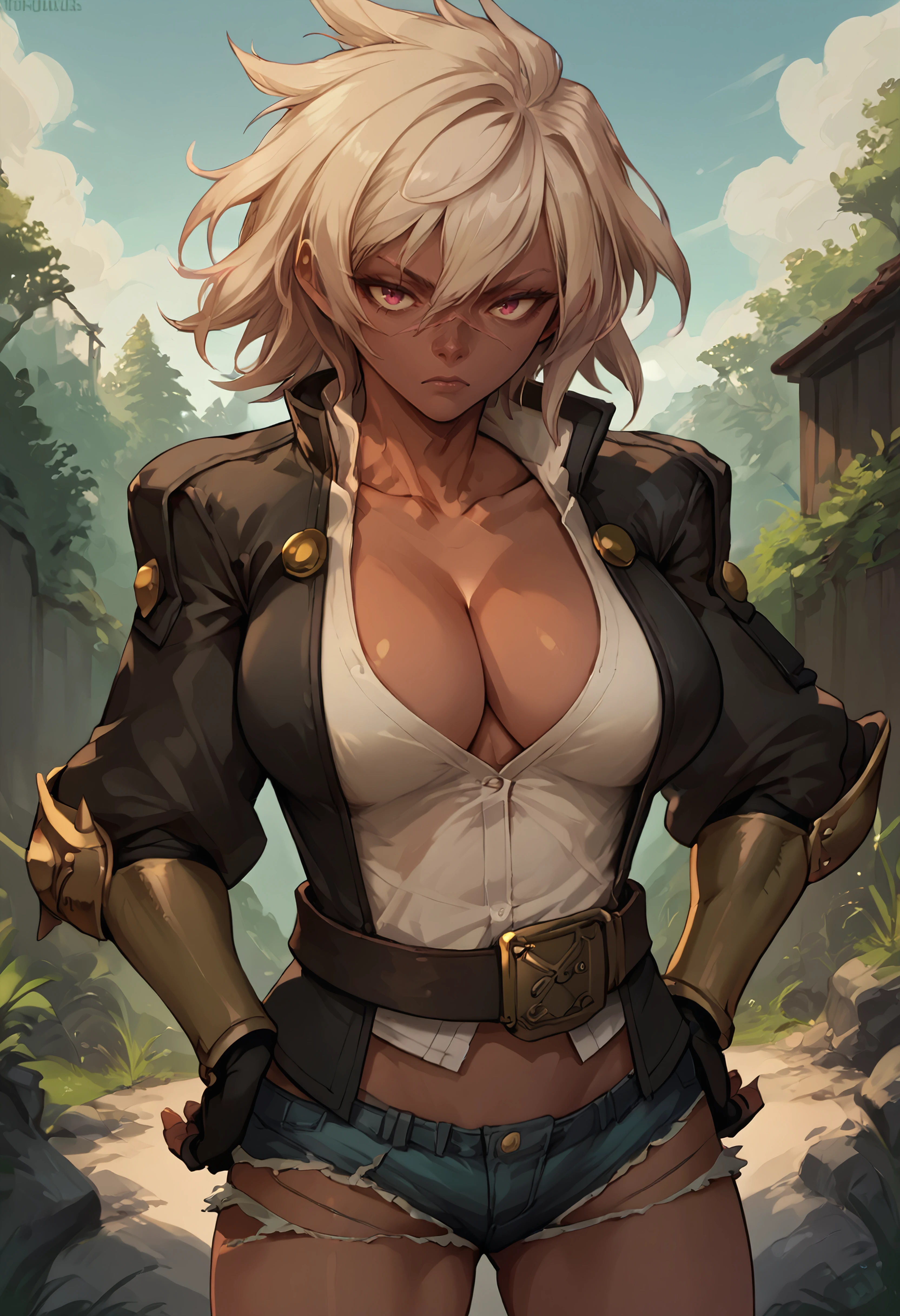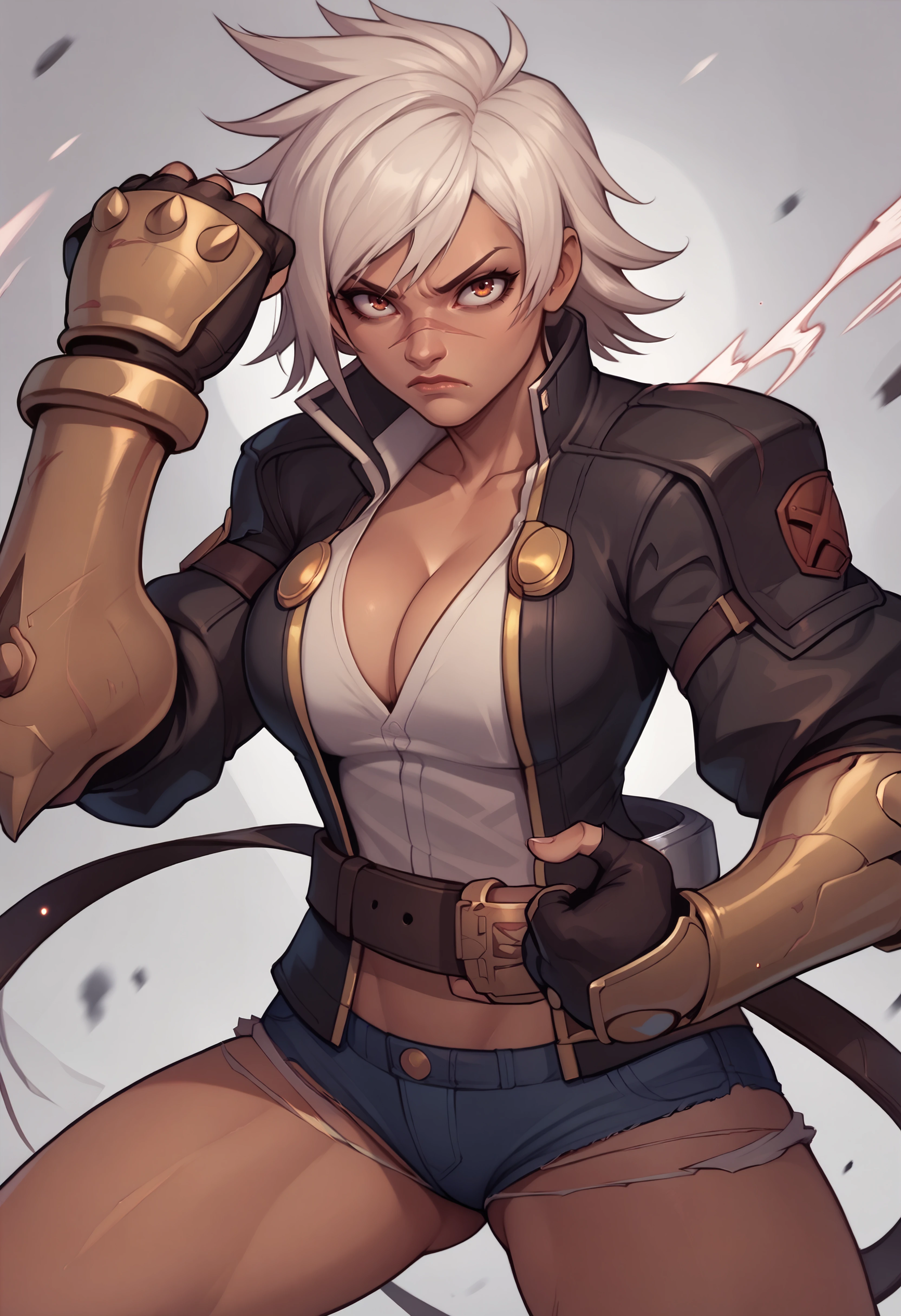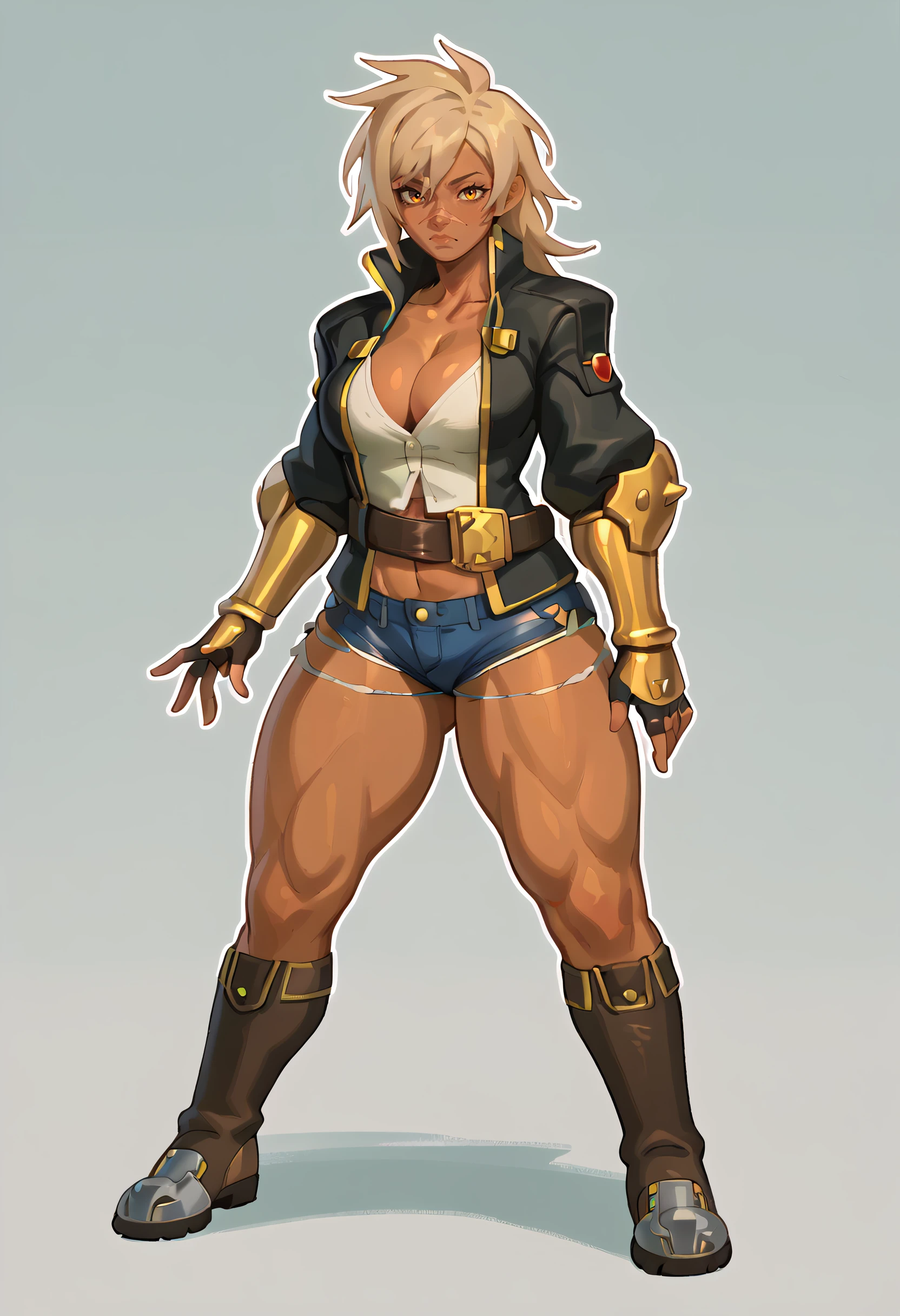 jacket, shirt, cleavage, belt, cutoffs, fingerless gloves, gauntlets, boots
