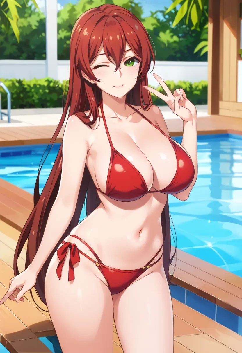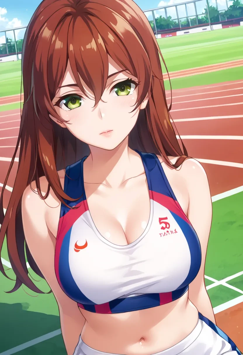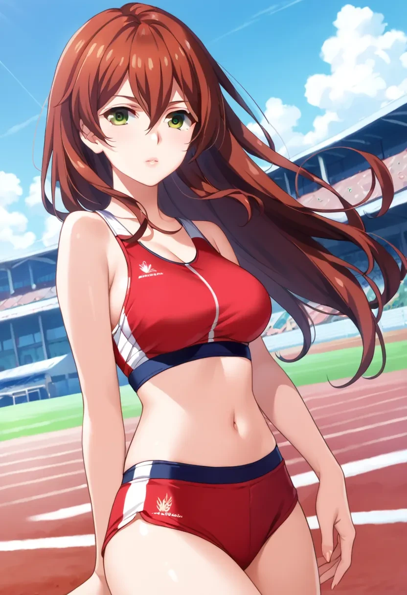 Hiragi Akira, red hair, long hair, brown hair, green eyes, hair between eyes,Description