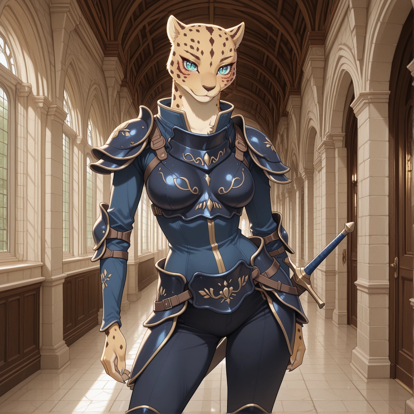 Armor look: 1girl, solo, furry female, armor, pants, sword, sheathed, blue eyes, slit pupils, medium breasts