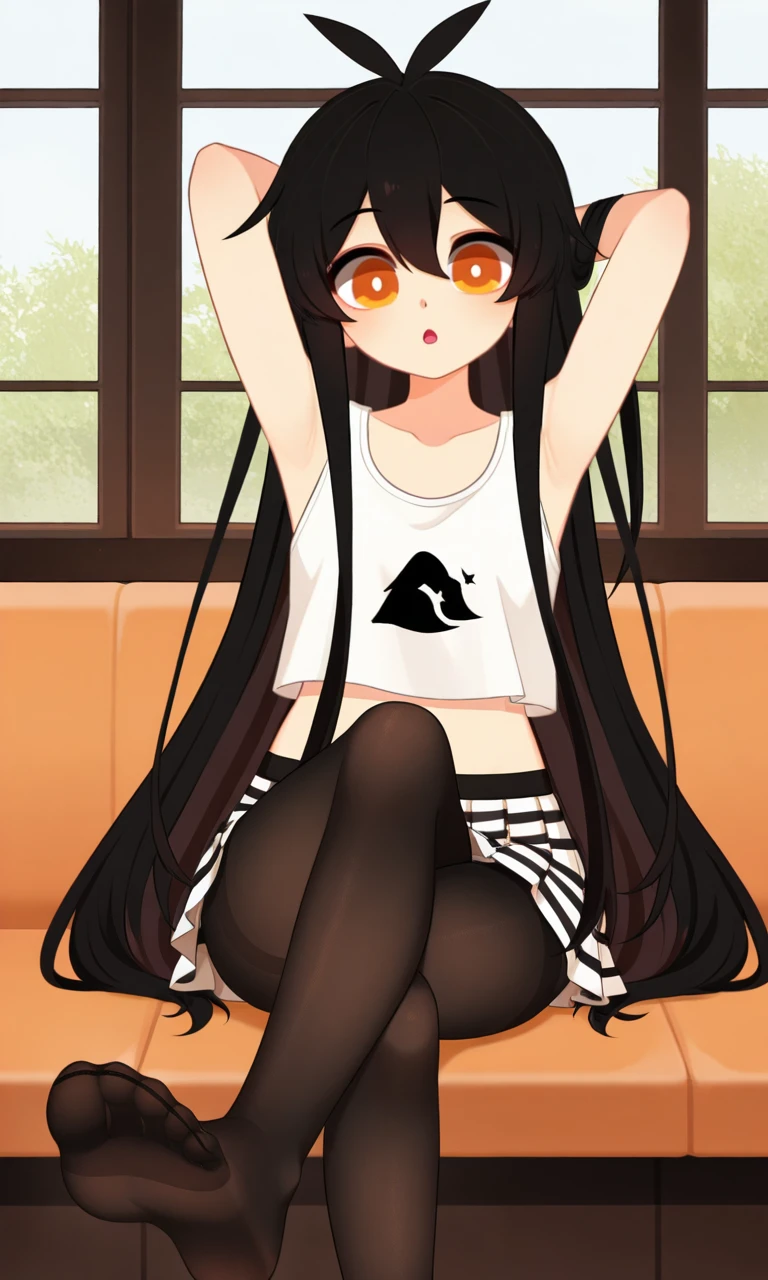 pantyhose, pleated skirt, midriff, miniskirt, striped clothes, crop top, black pantyhose, white skirt, white tank top, striped skirt, no shoes,