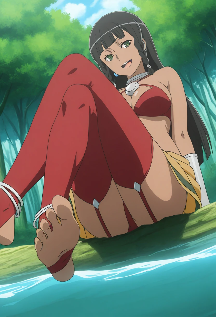 tione_danmachi,tione_main,dark skin,dark-skinned female, long hair, twin braids,toeless legwear, o-ring top, black hair, blunt bangs, green eyes,earrings, neck ring, red bikini,sarong,yellow sarong,anklet, bracer, garter straps, red thighhighs,thighhighs