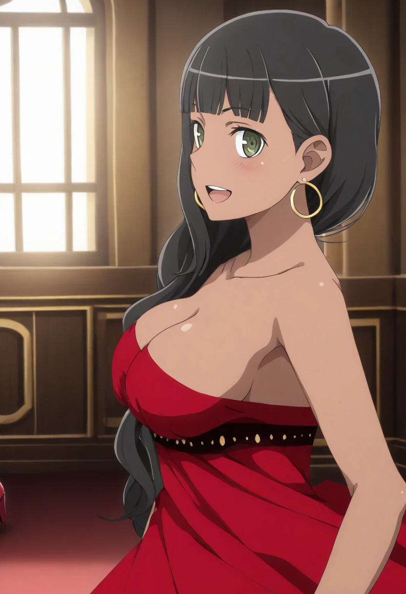 tione_danmachi,dark skin,dark-skinned female, black hair, blunt bangs,green eyes, tione_longdress, absurdly long dress,long dress,strapless, strapless dress, red dress,hoop earrings,hair over shoulder,long dress,red heels,(multicolored dress,layered dress),bare shoulders, earrings, sleeveless dress