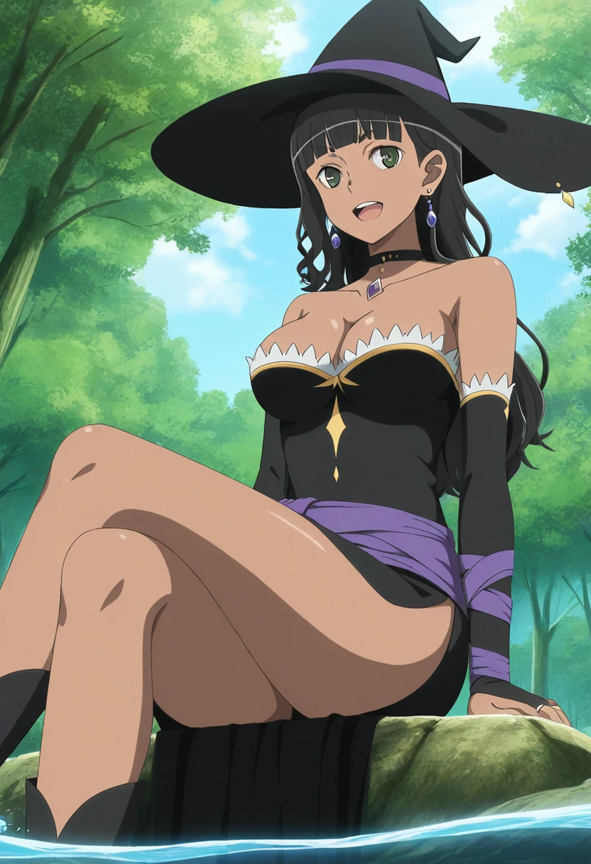 tione_danmachi,dark skin,dark-skinned female, black hair, blunt bangs,green eyes, tione_witch, hat,witch hat, black dress,long stragiht hair, dress,black choker, cleavage,earrings,side slit, strapless dress, collarbone,jewelry,choker,bridal gauntlets,sleeveless dress,golden ring,purple ribbon,ribbon,purple ribbon on arm, purple sash,sash,gem, elbow gloves,black gloves