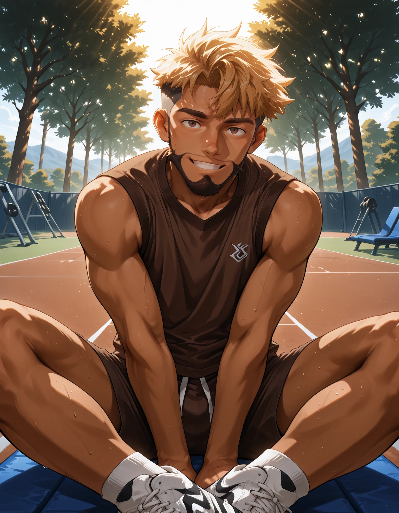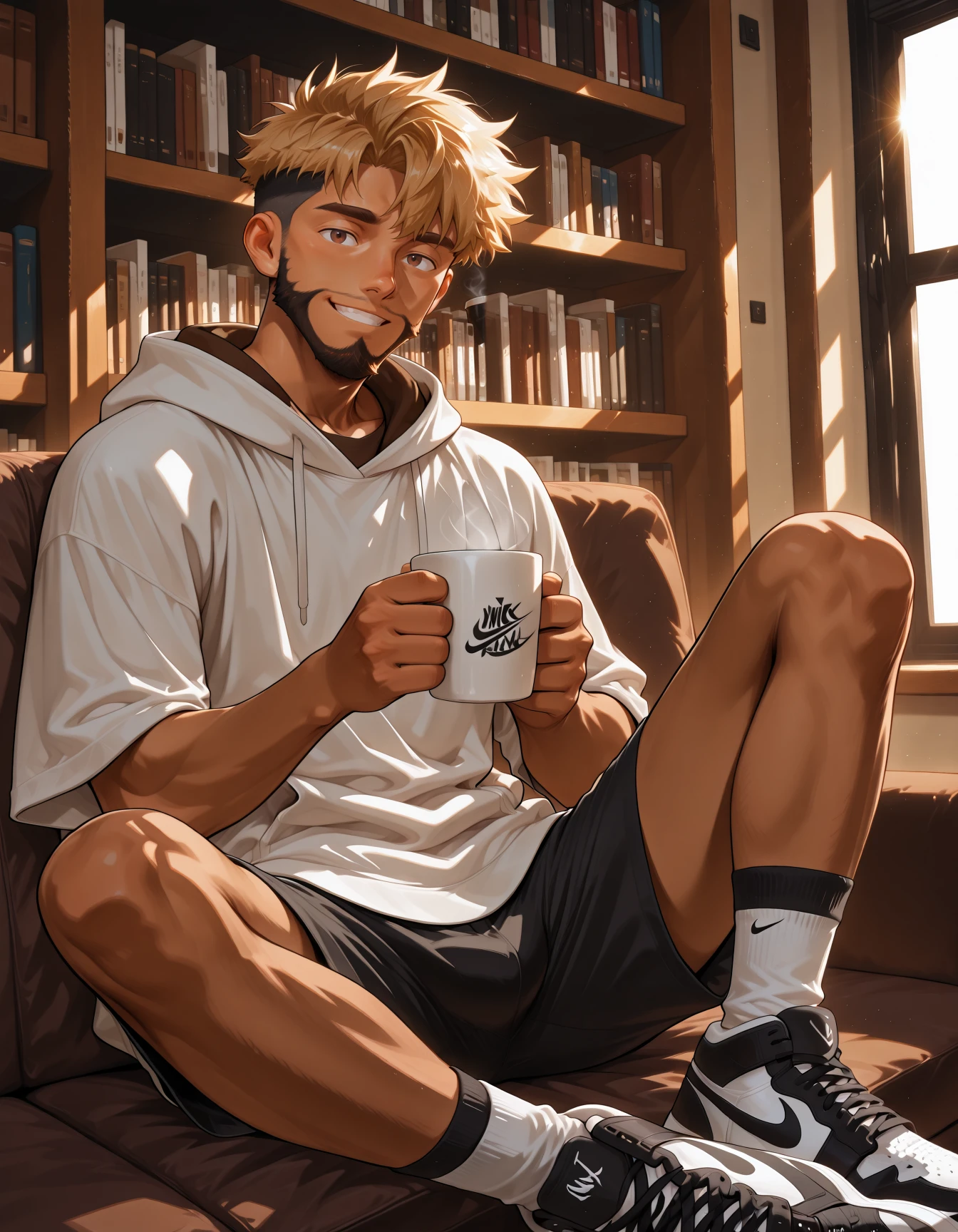 1boy, long black undercut, blond hair, leftsided bright blond bangs, dark brown eyes, brown eyebrows, brown short full box beard, smile, male focus, iyory skin taint, short beard above mouth, lean, twink, slim,Secondary keywords: