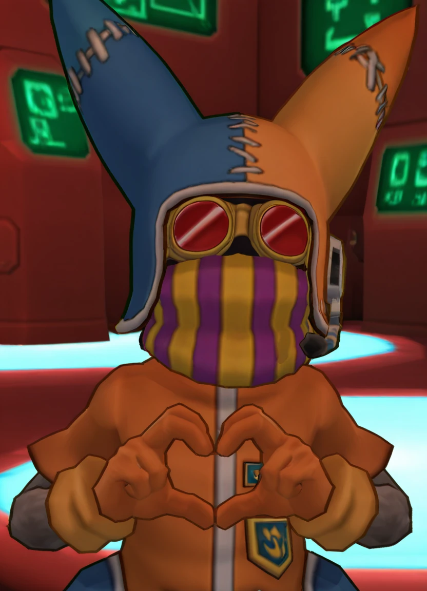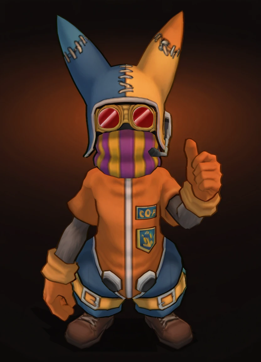 aviator cap, red goggles, scarf over mouth, earpiece, short sleeves, jumpsuit, orange gloves, brown shoes