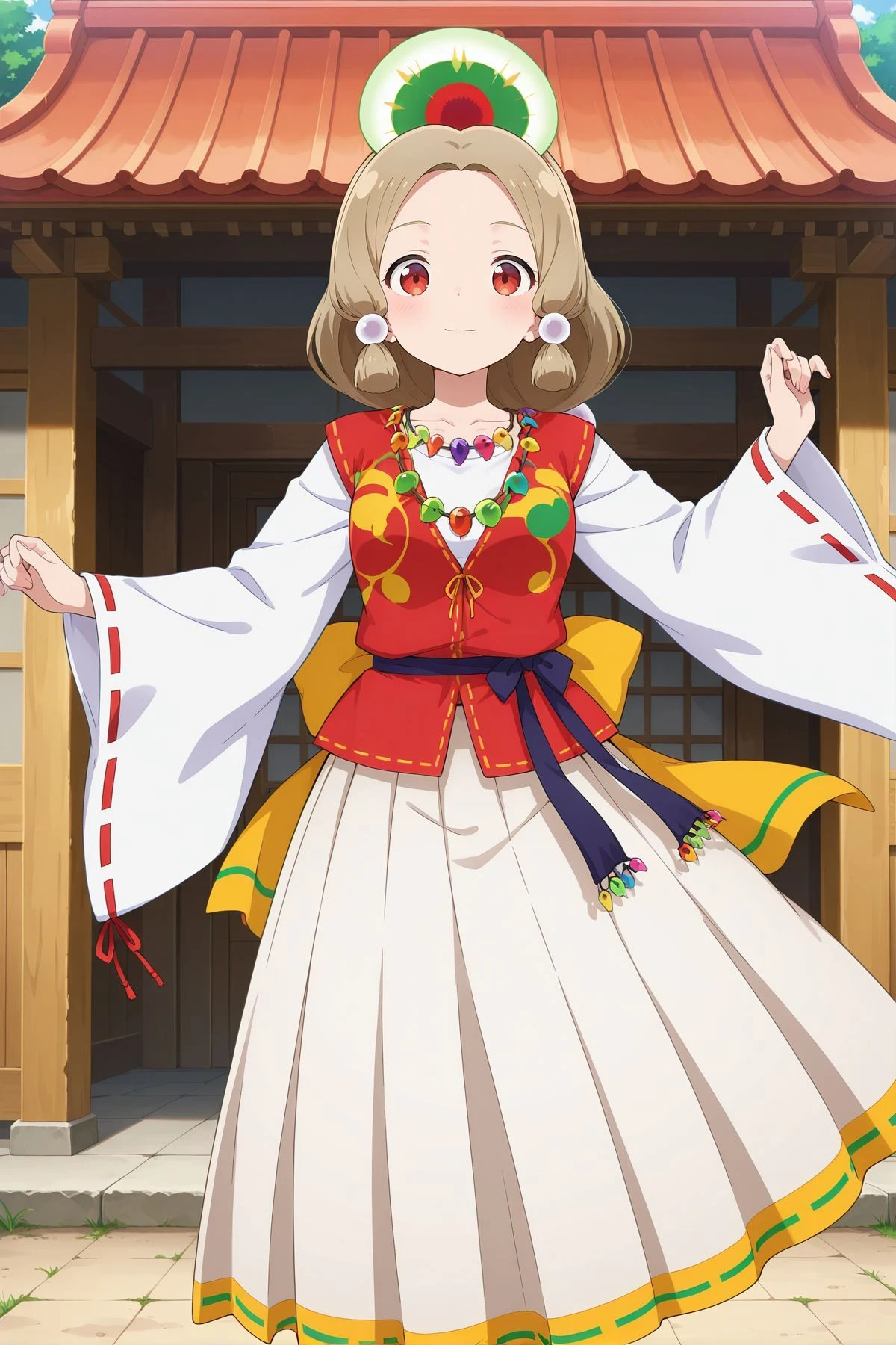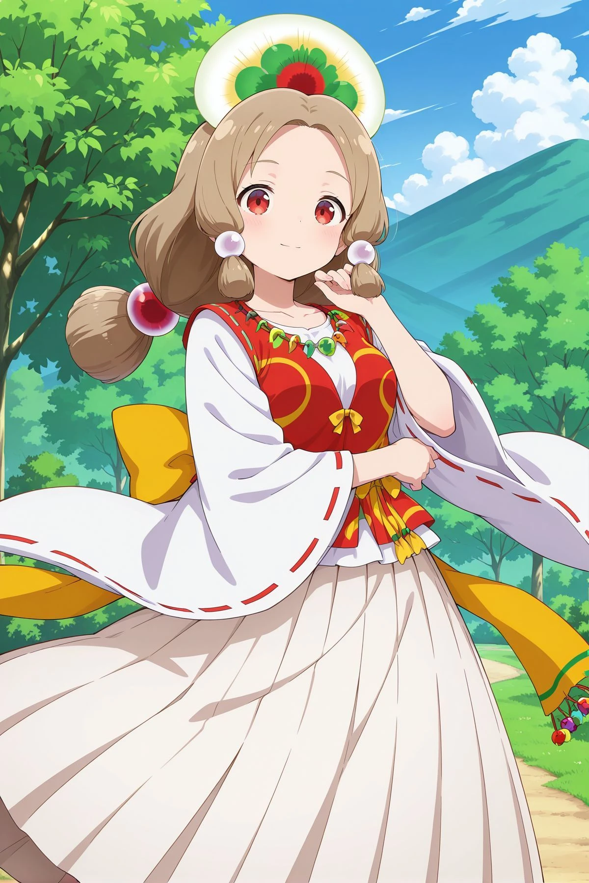 tamatsukuri misumaru, 1girl, solo, red eyes, brown hair, sidelocks, tamatsukuri misumaru \(capsule toy goddess\), alternate costume, necklace, jewelry, red vest, white shirt, long sleeves, wide sleeves, ribbon-trimmed sleeves, back bow, yellow bow, white skirt, long skirt, pleated skirt, yellow sleeves, Description