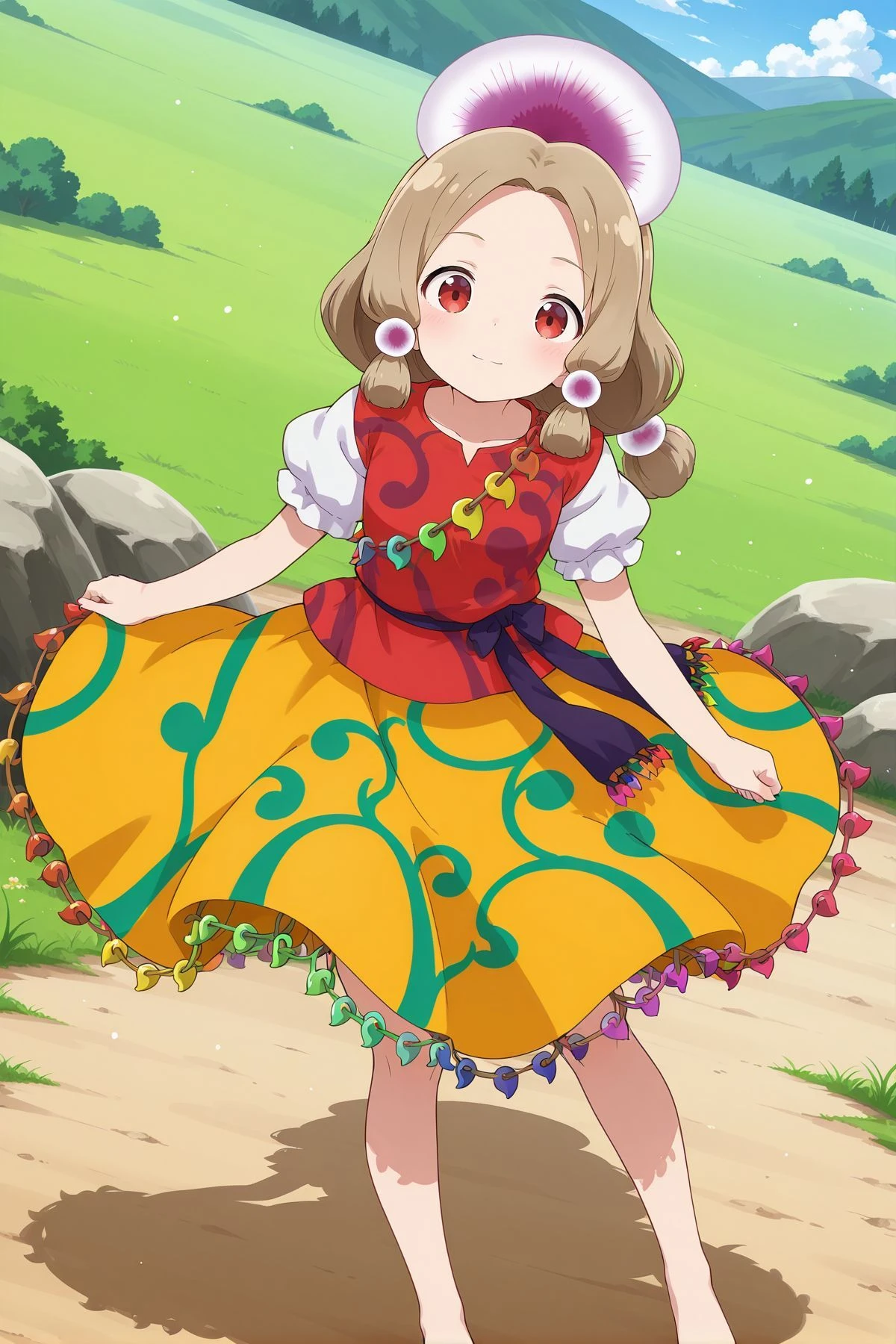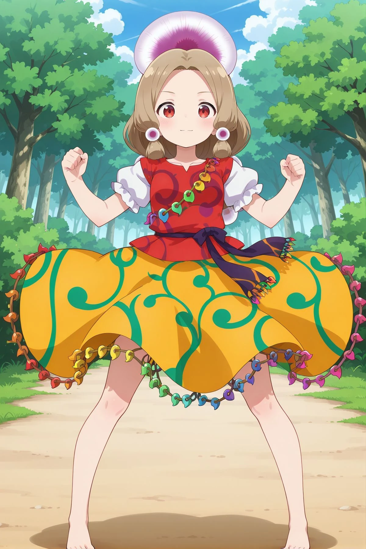 tamatsukuri misumaru, 1girl, solo, red eyes, brown hair, sidelocks,hair ornament, red shirt, frilled shirt, puffy short sleeves, yellow skirt, frilled skirt, barefoot,Alternatives :