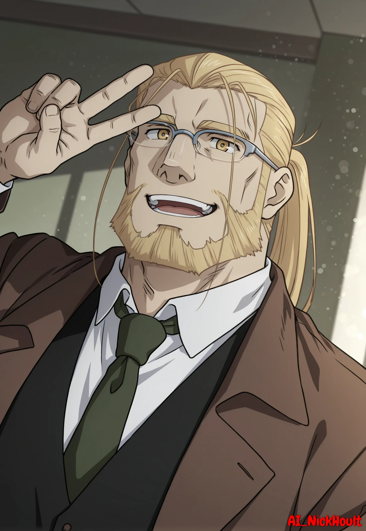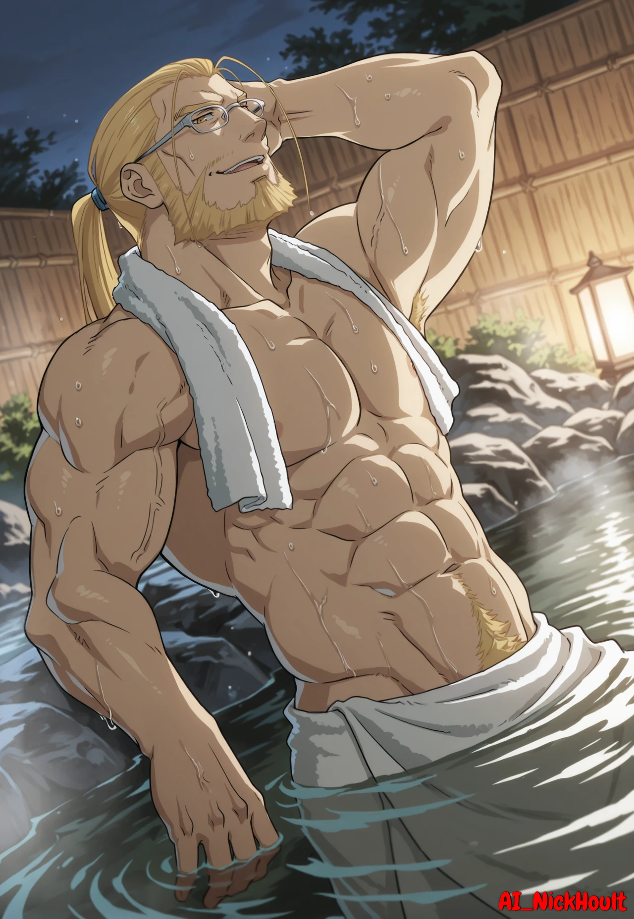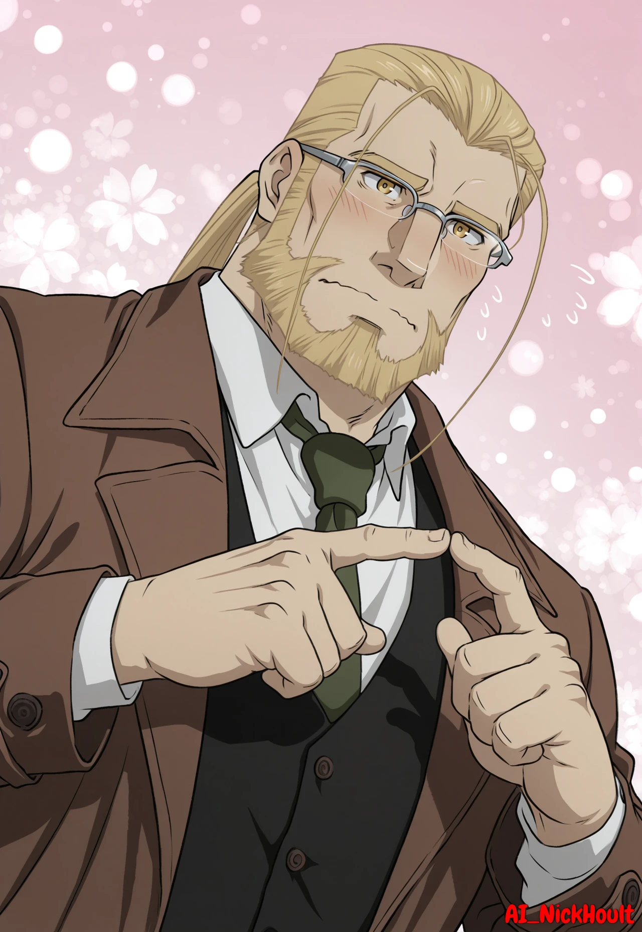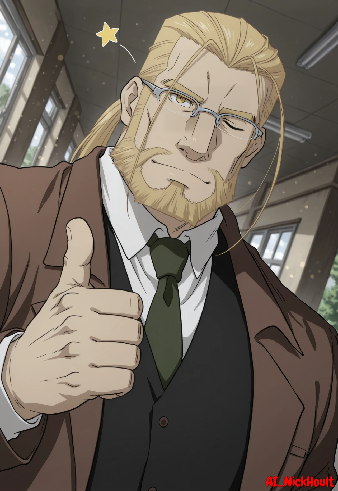 Hohenheim, mature man, long blonde hair, ponytail, loose strands of hair, facial hair, glasses, golden eyes,