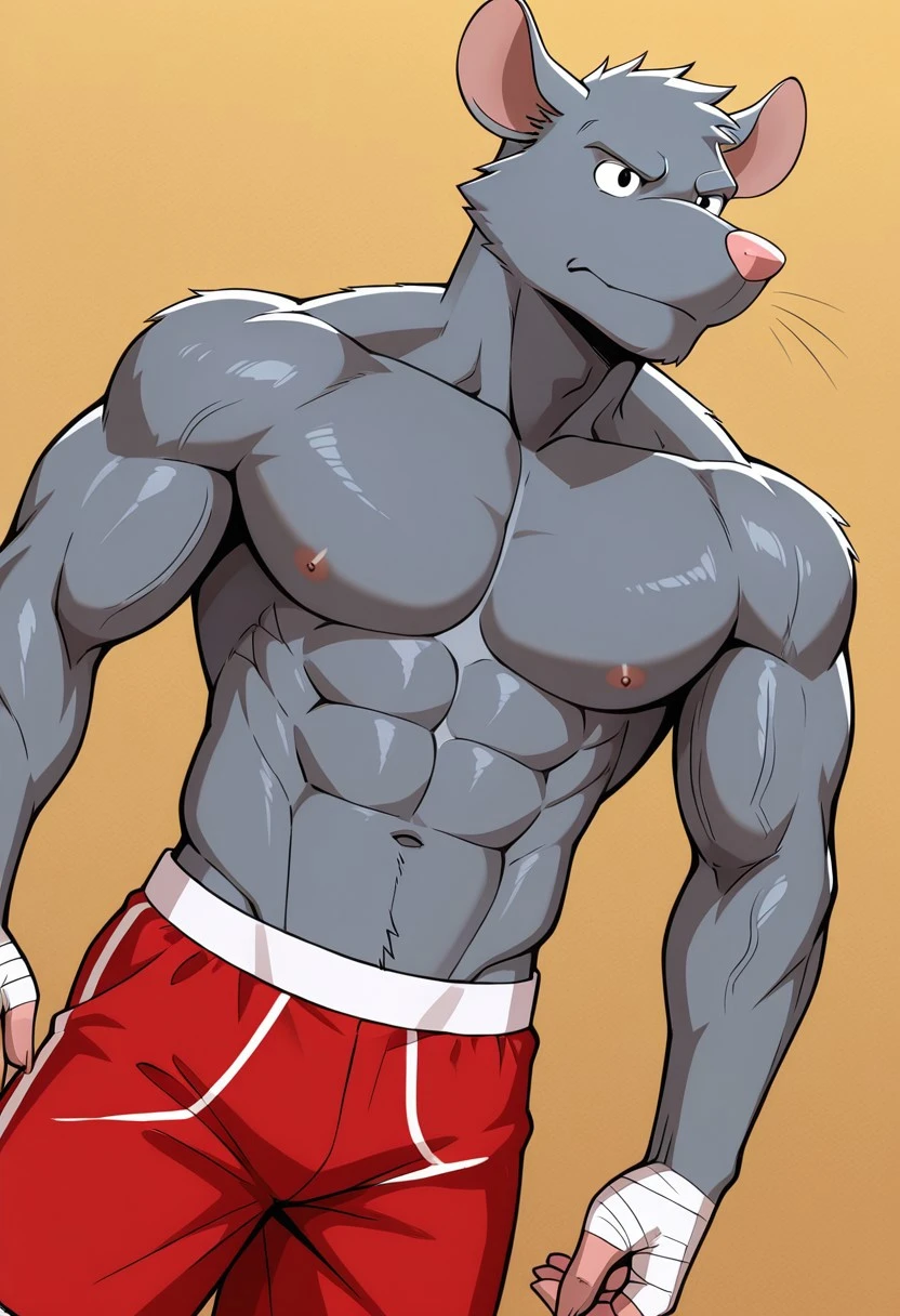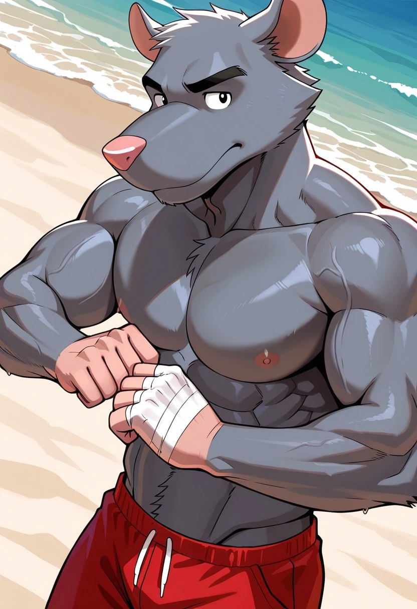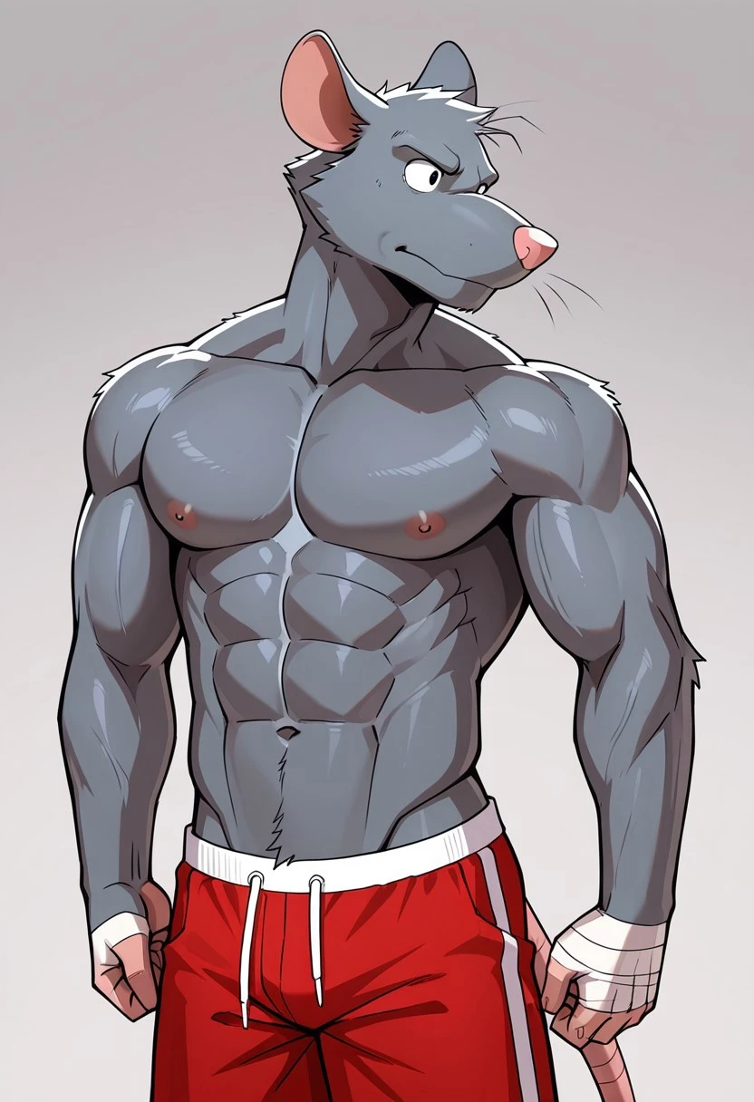 solo,male,anthro rat, muscular body,gray fur,cheeks tufts,head tufts,pink nose,black eyes,red shorts,bandage on hands