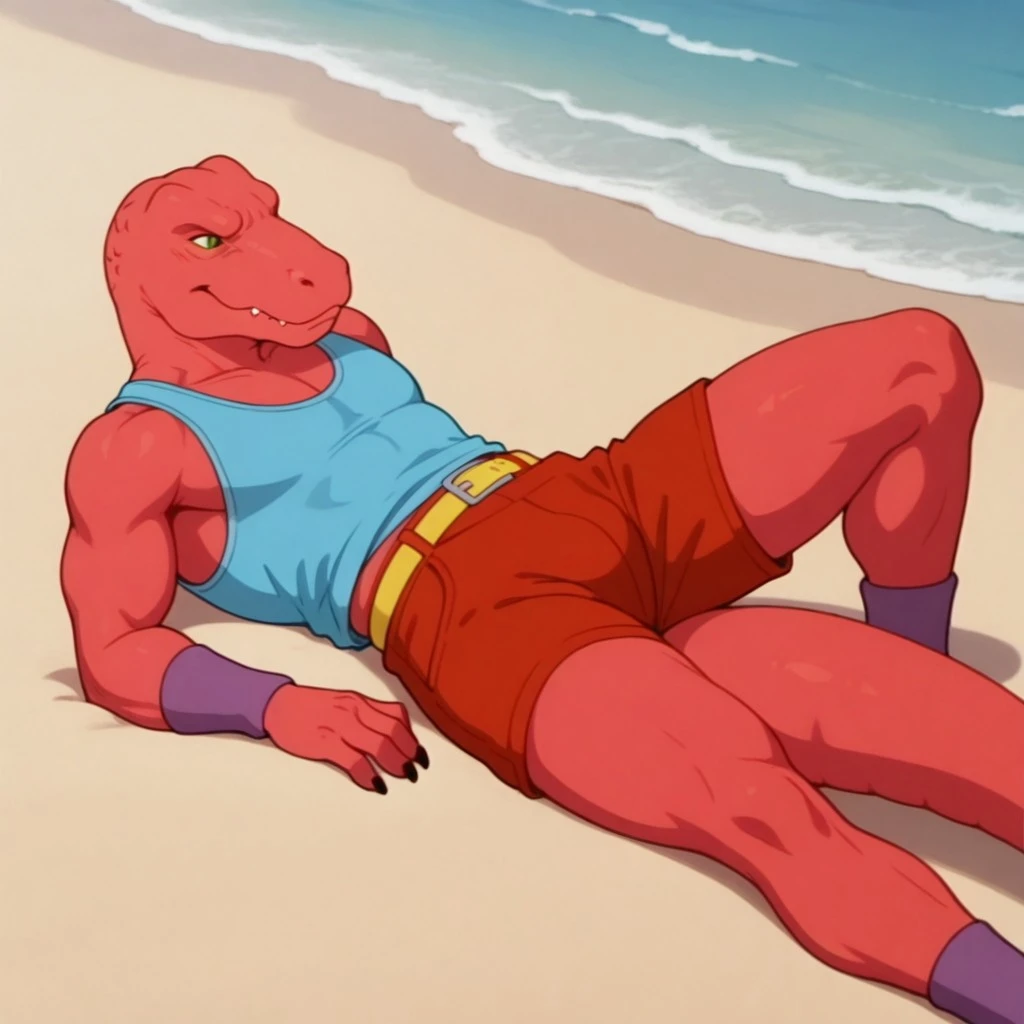 blue tank top, yellow belt, red shorts, wristbands