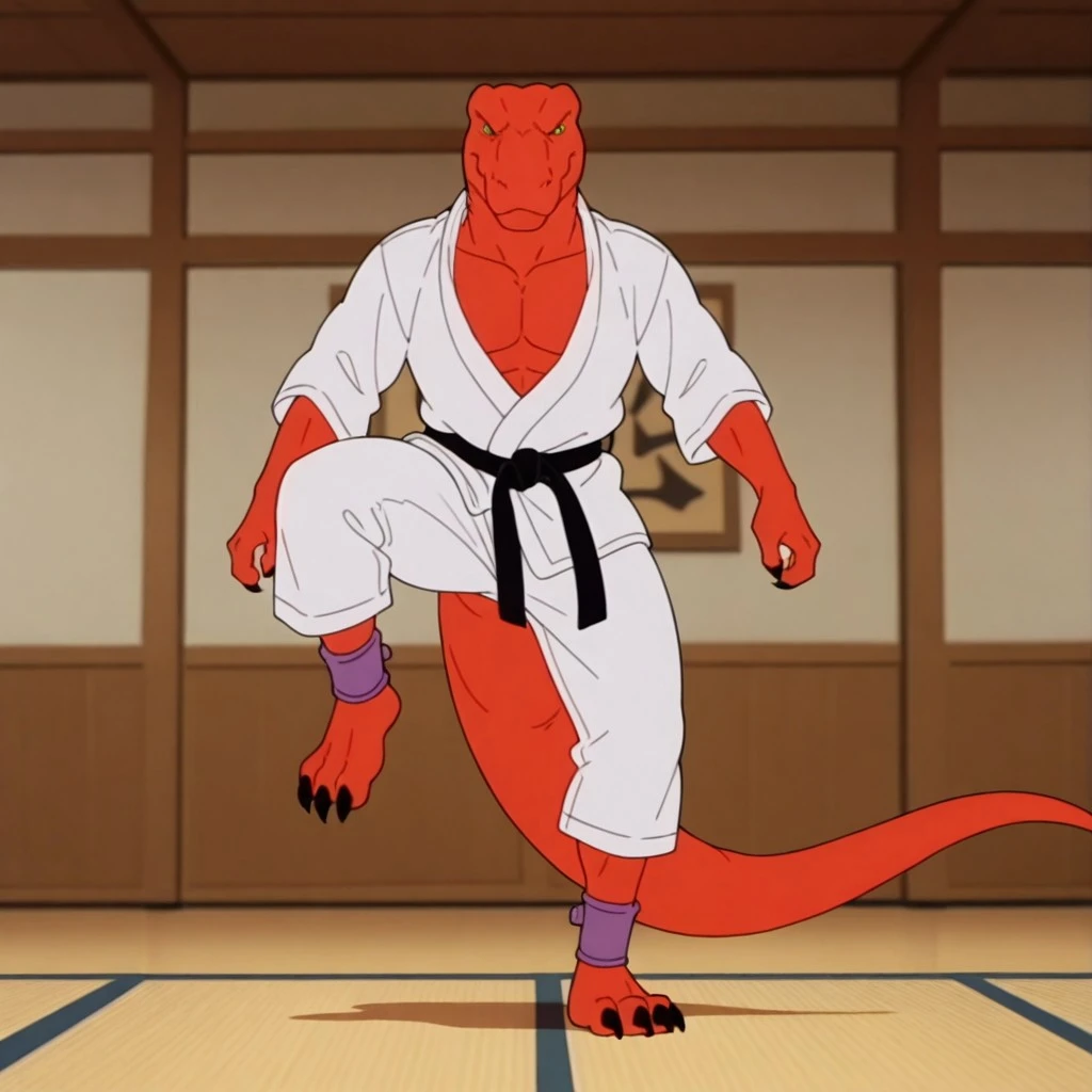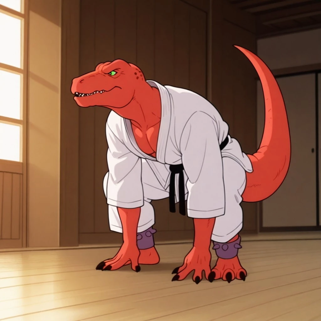 GRexdsIL, anthro, male, Tyrannosaurus, red skin, green eyes,