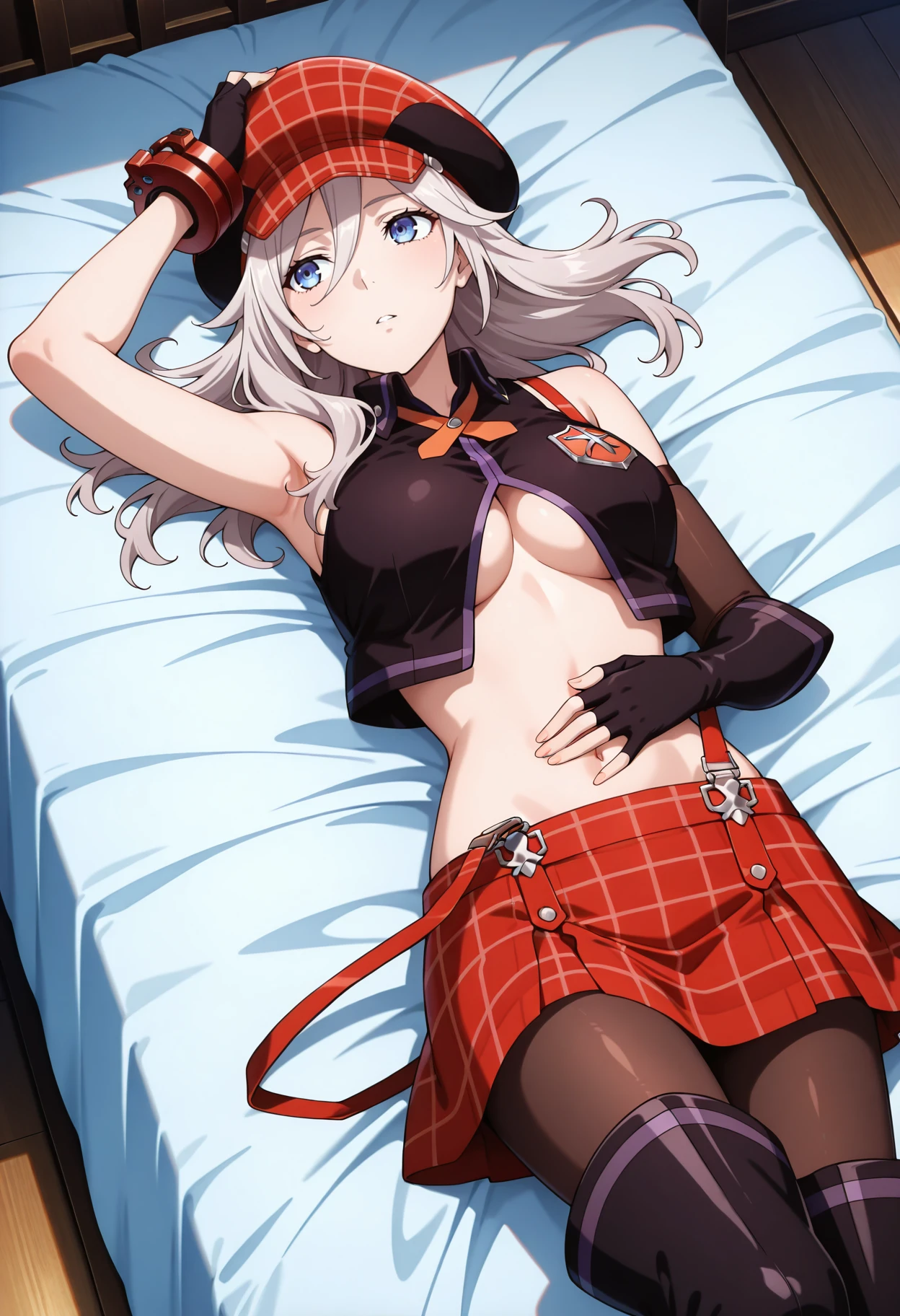 Base: alisage, 1girl, anime coloring, solo, long hair, white grey hair, cabbie hat, blue eyes, collared sleeveless cropped vest, red ge bracelet, alisa suspenders slip skirt, neck x ribbon, pantyhose, asymmetrical fingerless gloves, single elbow glove,red skirt, plaid skirt, underboob, midriff, navel, thigh boots,