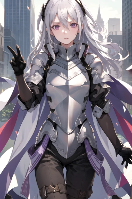 JeanneEAnise, 1girl, solo, long hair, black gloves, hair between eyes, purple eyes, grey hair, white cape, armor, breastplate