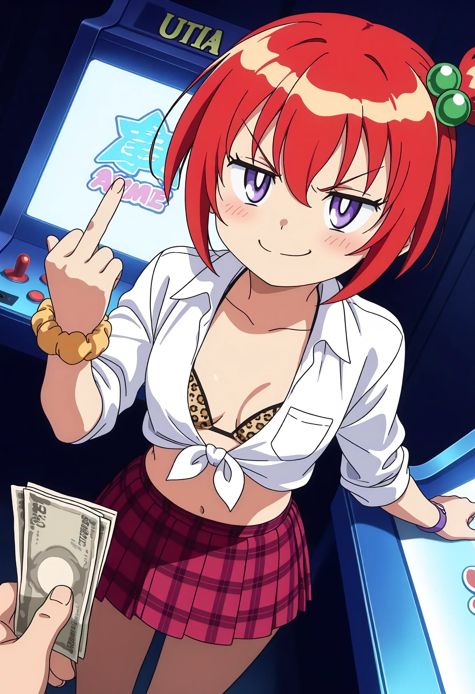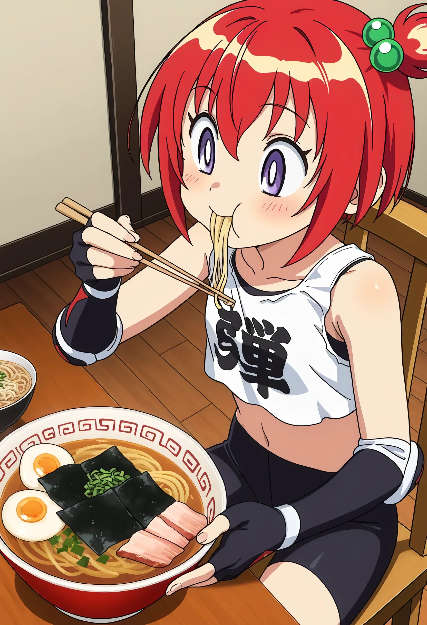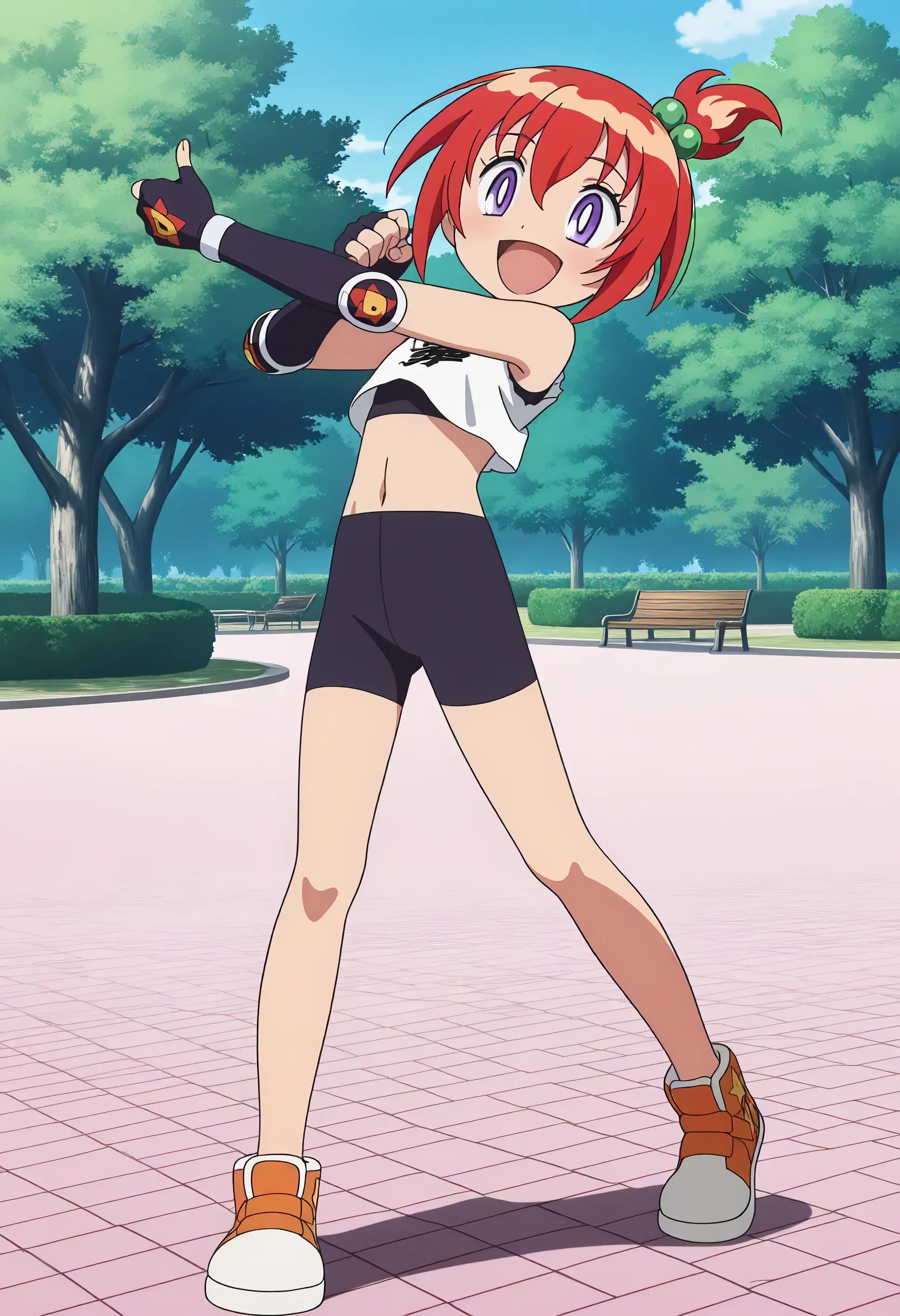 ichigeki danko, red hair, one side up, purple eyes, hair bobbles, white tank top, black inner shirt, black fingerless gloves, elbow gloves, midriff, black bike shorts, orange shoes,