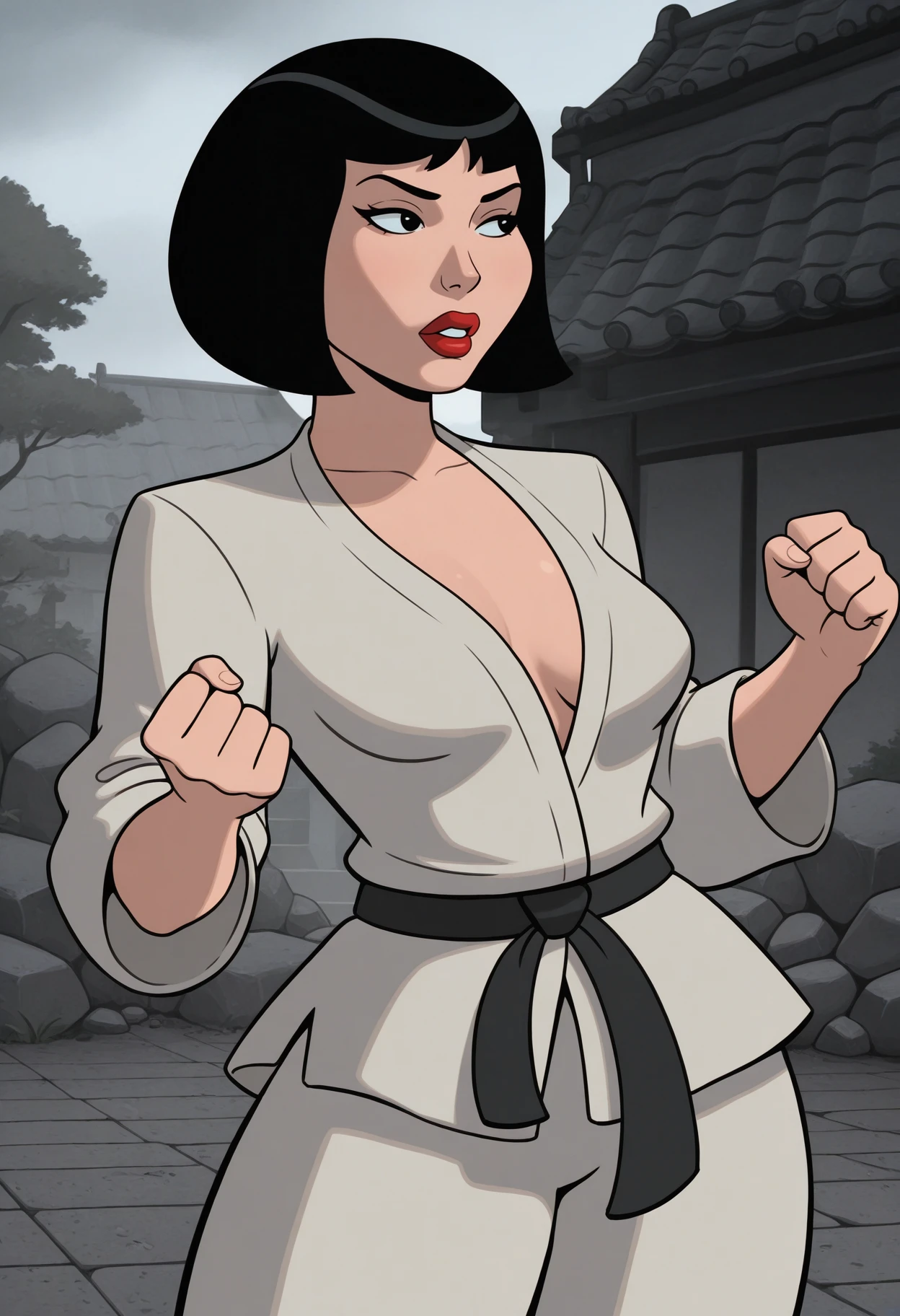 1girl, solo, black eyes, black hair, short hair, bob cut, breasts, medium breasts, lipstick, red lips,main outfit: