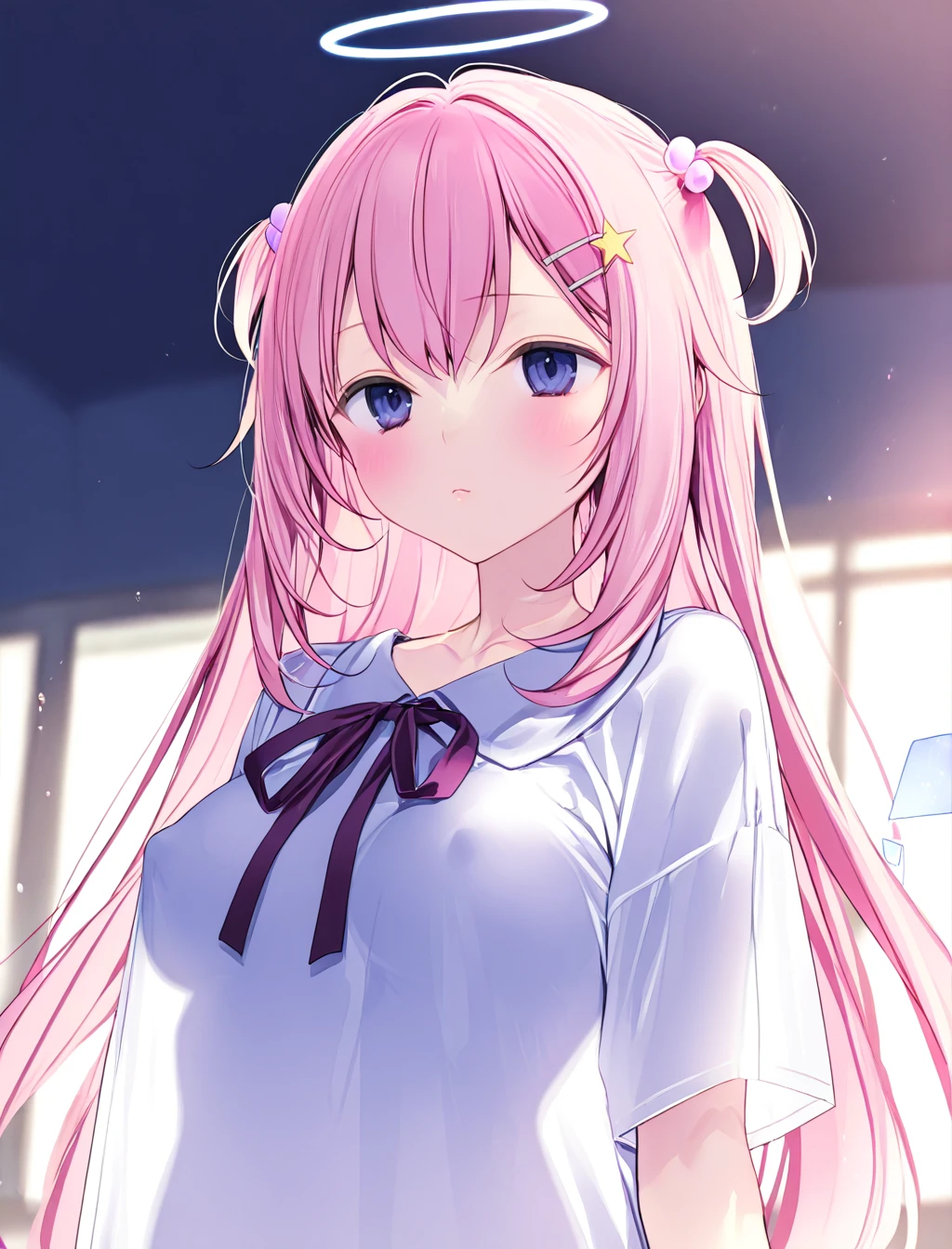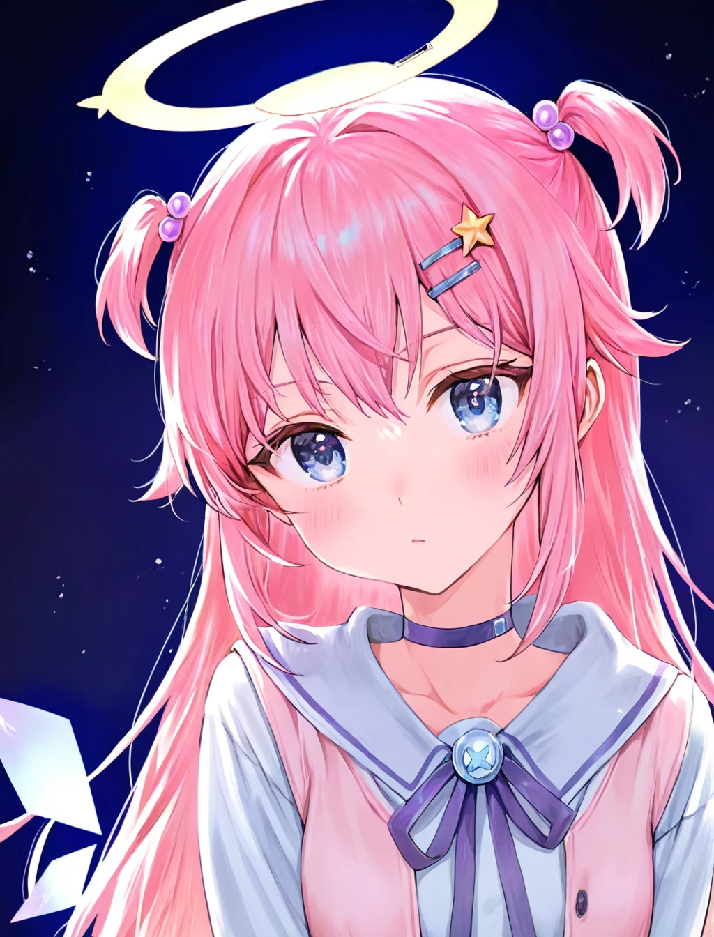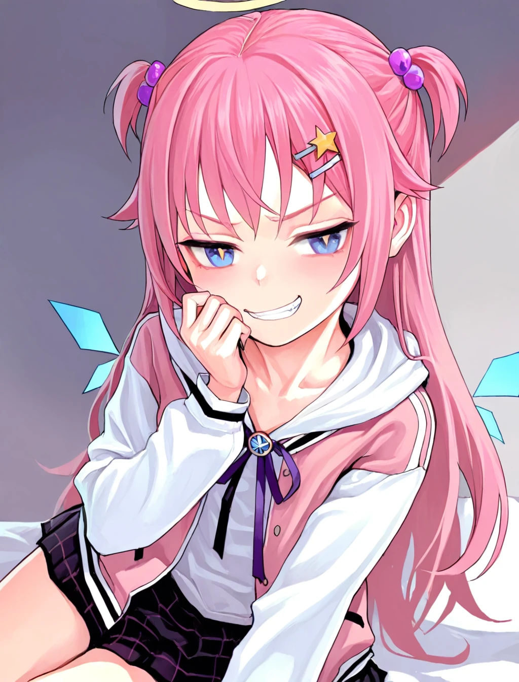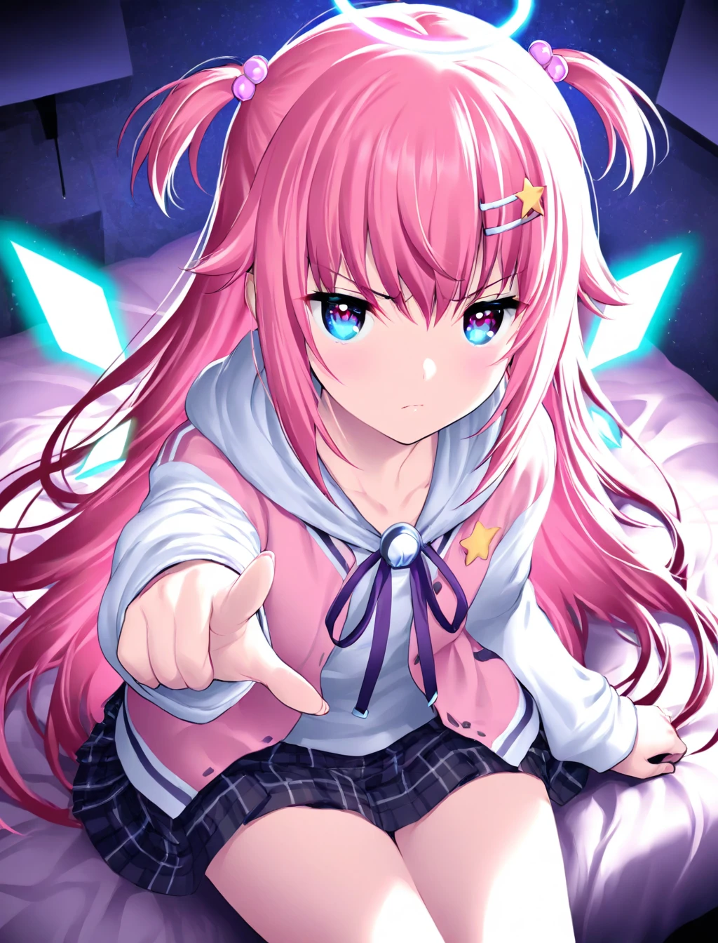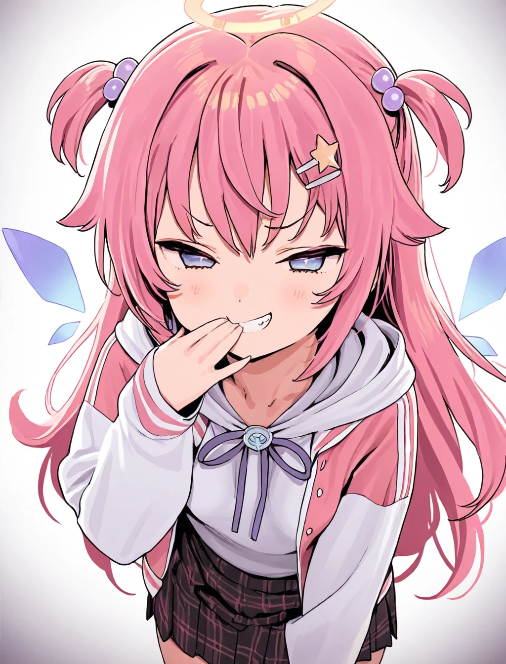 (pink hair:1),two side up,(long hair),(deep blue eyes:1),(star hair ornament,hairclip:1.1),hair (purple:1.2) bobbles,(halo:1),(mini wings:1),(blue energy wings),purple neck ribbon,(pink jacket:0.6) with (white sleeves:1),hood down,open clothes,plaid pleated skirt,black skirt, pink and white shoes,white socks