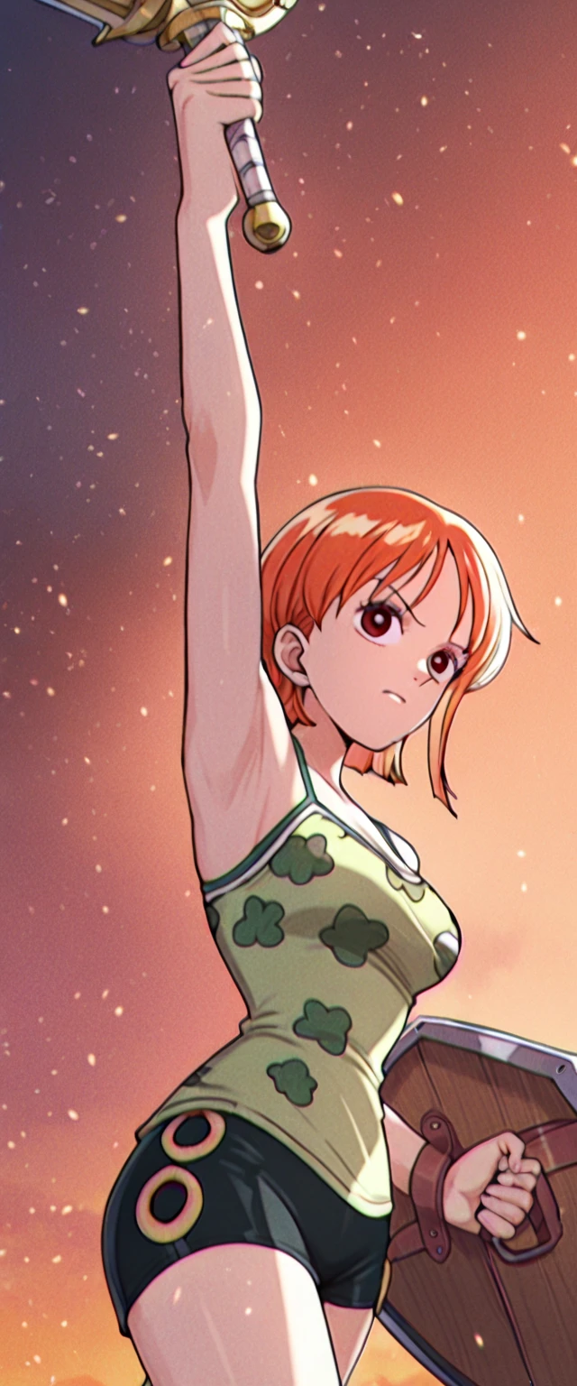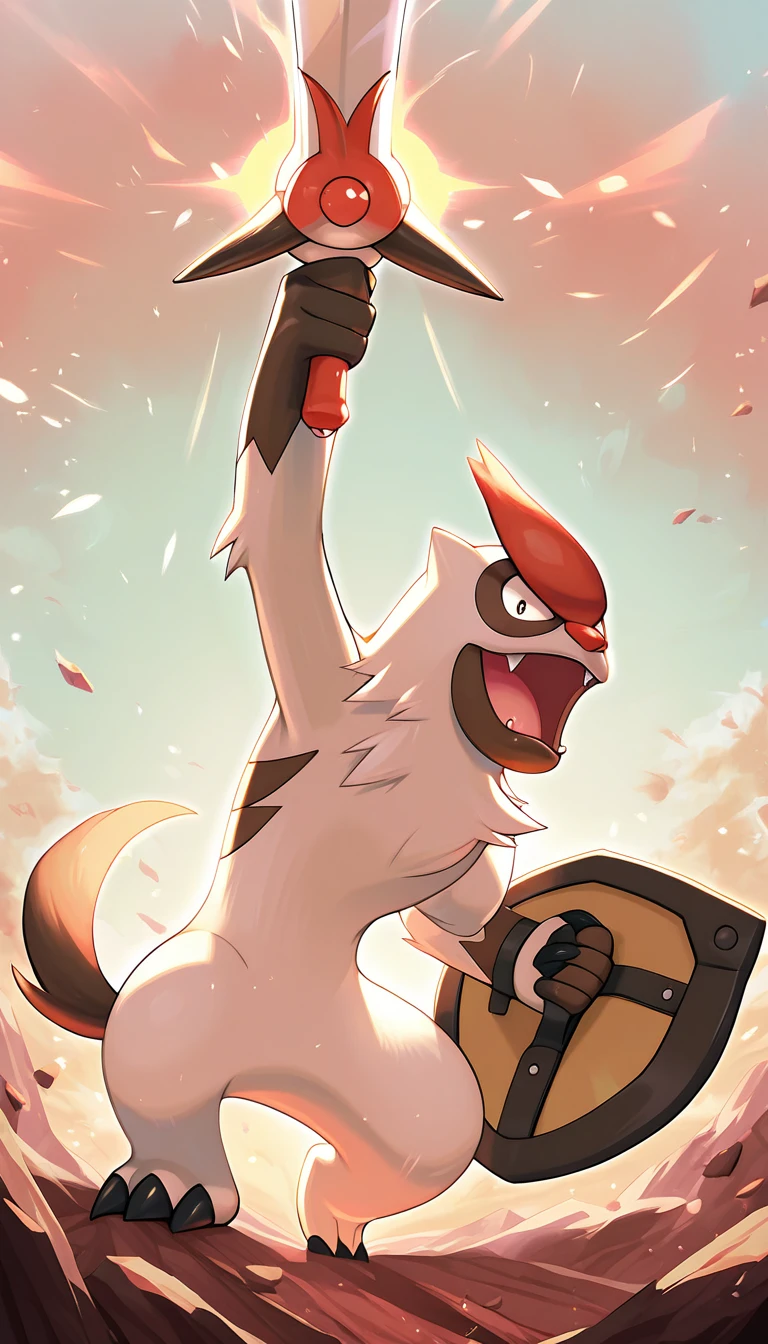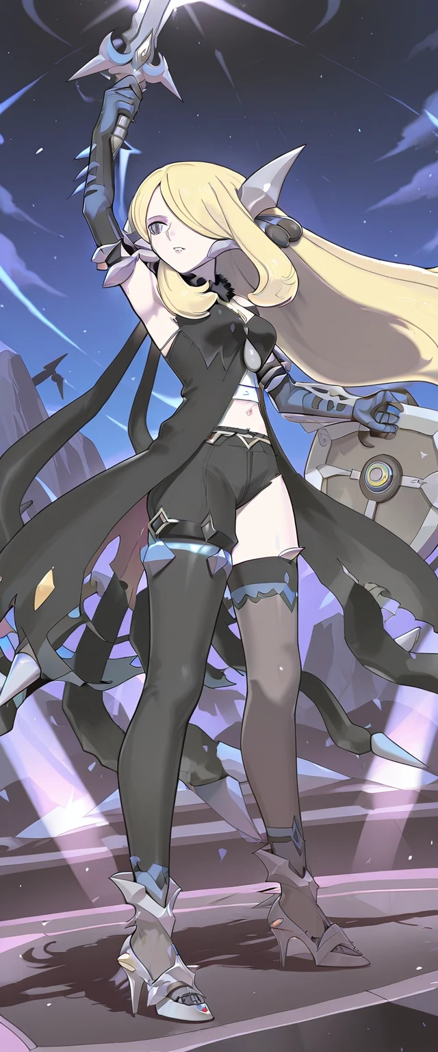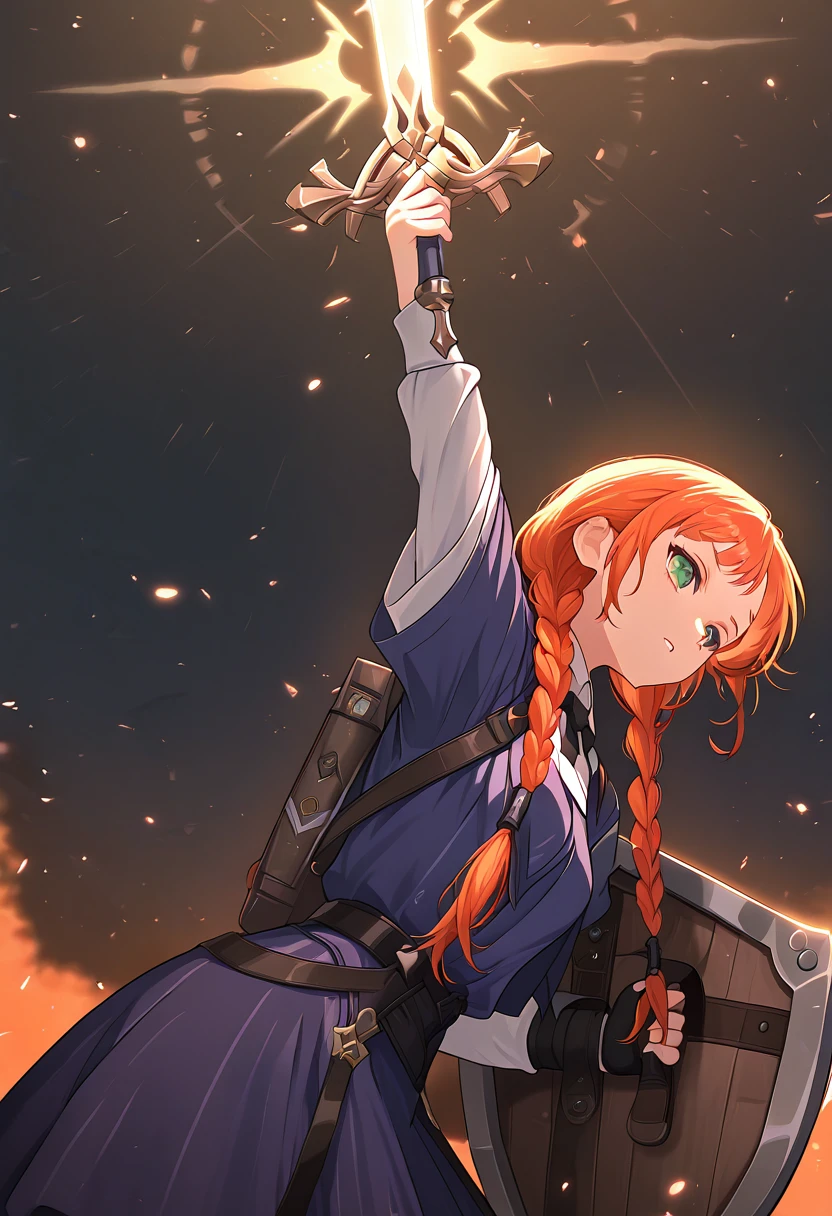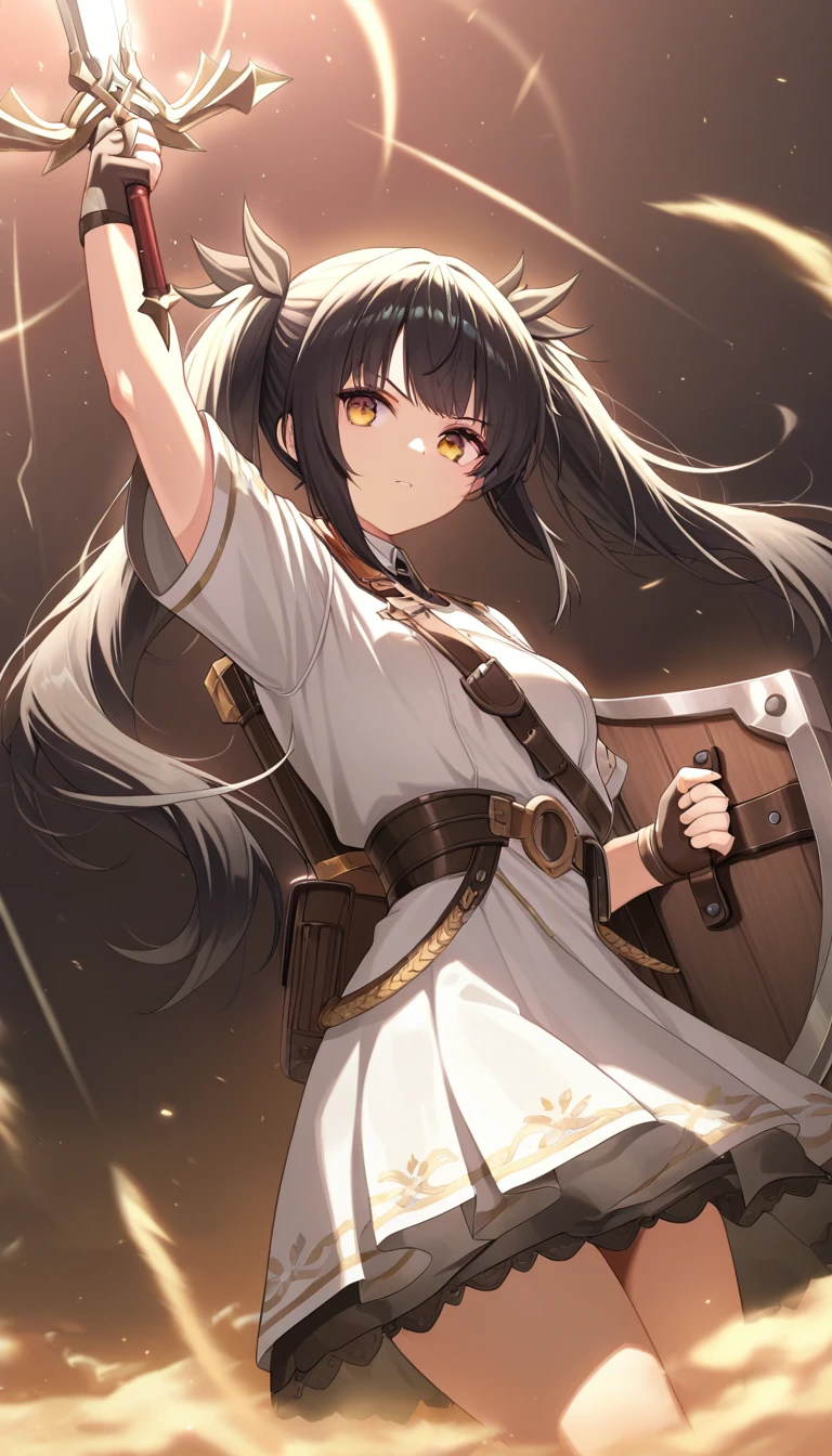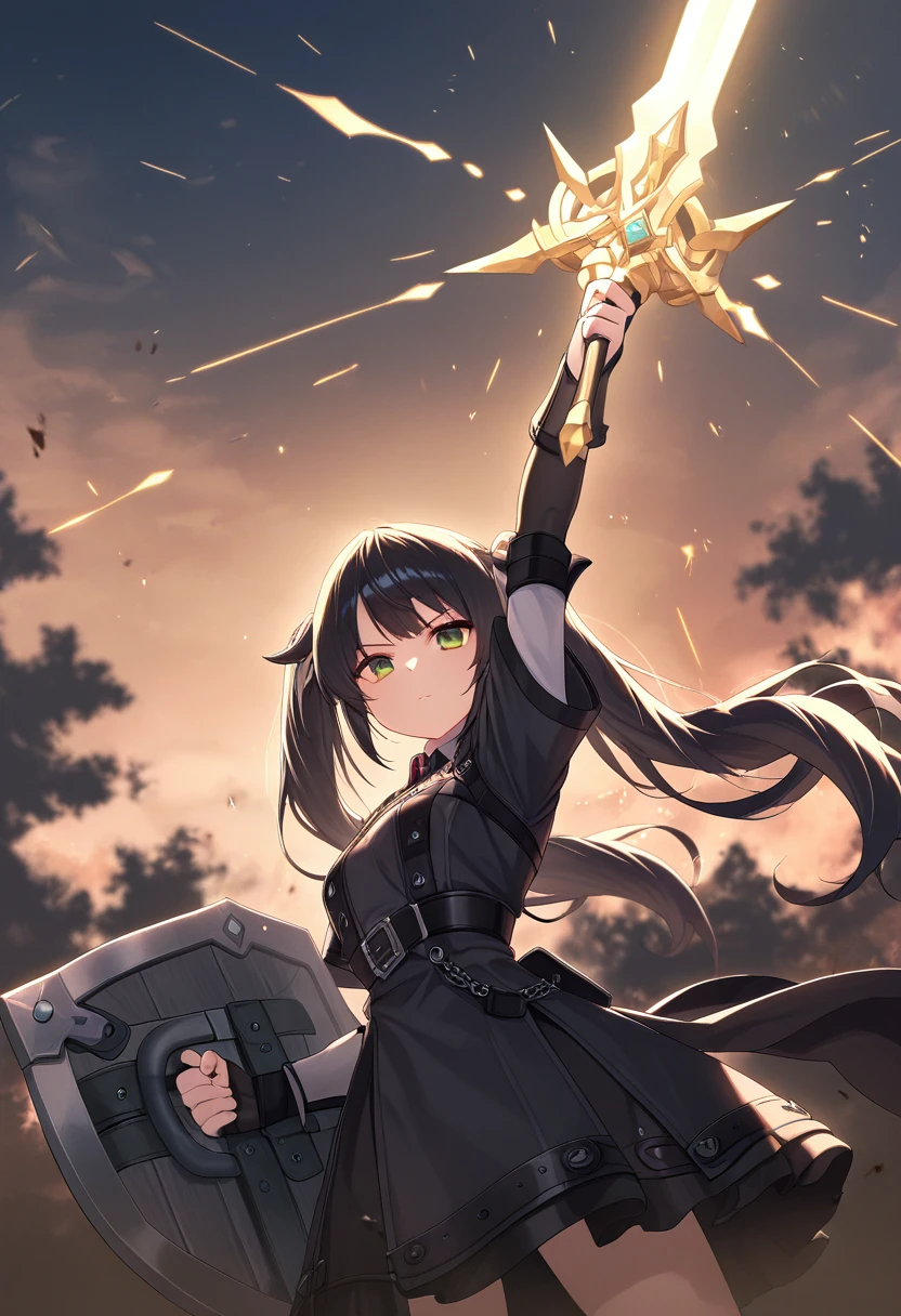 skywardswordpose, arm up, outstretched arm, holding sword, holding shield