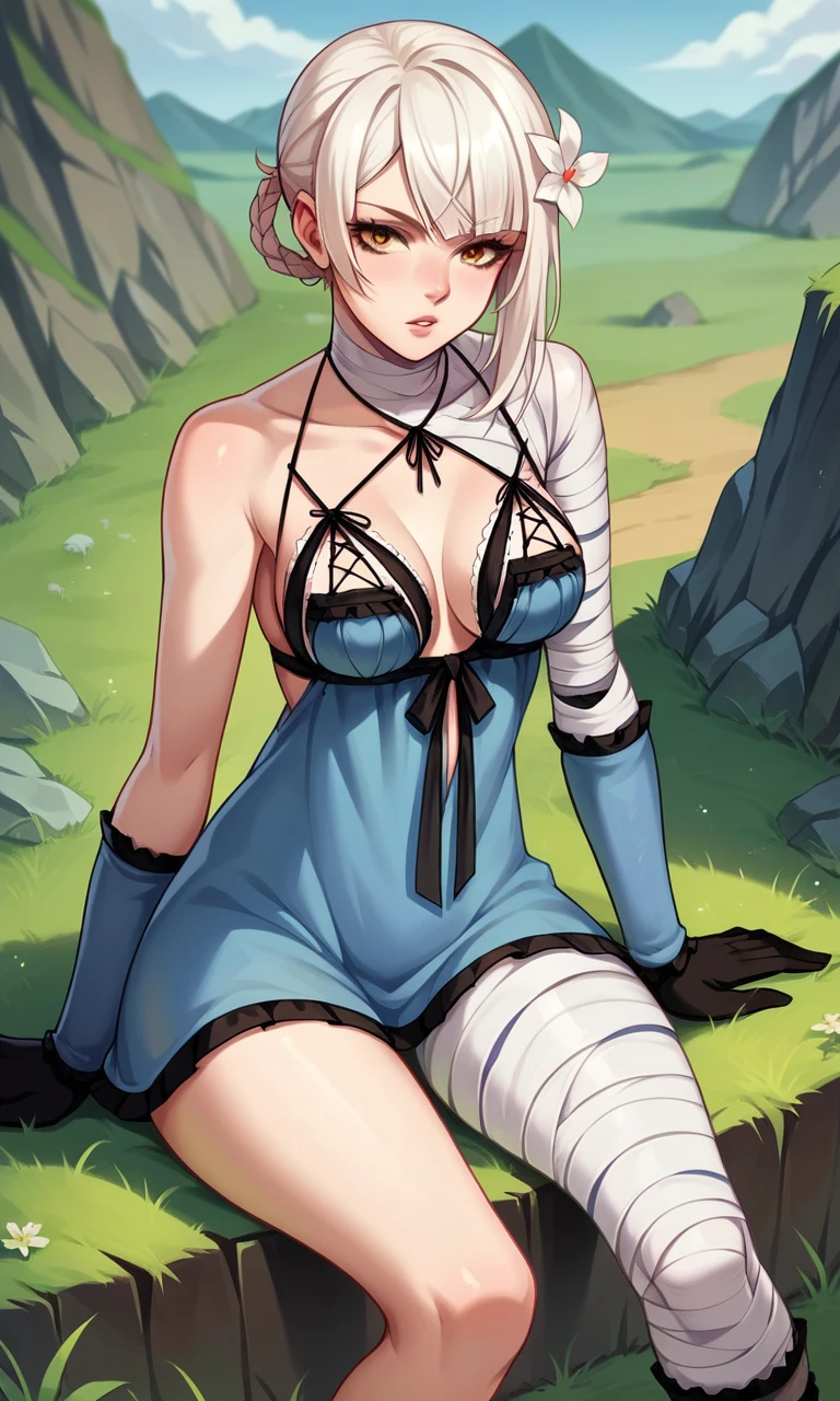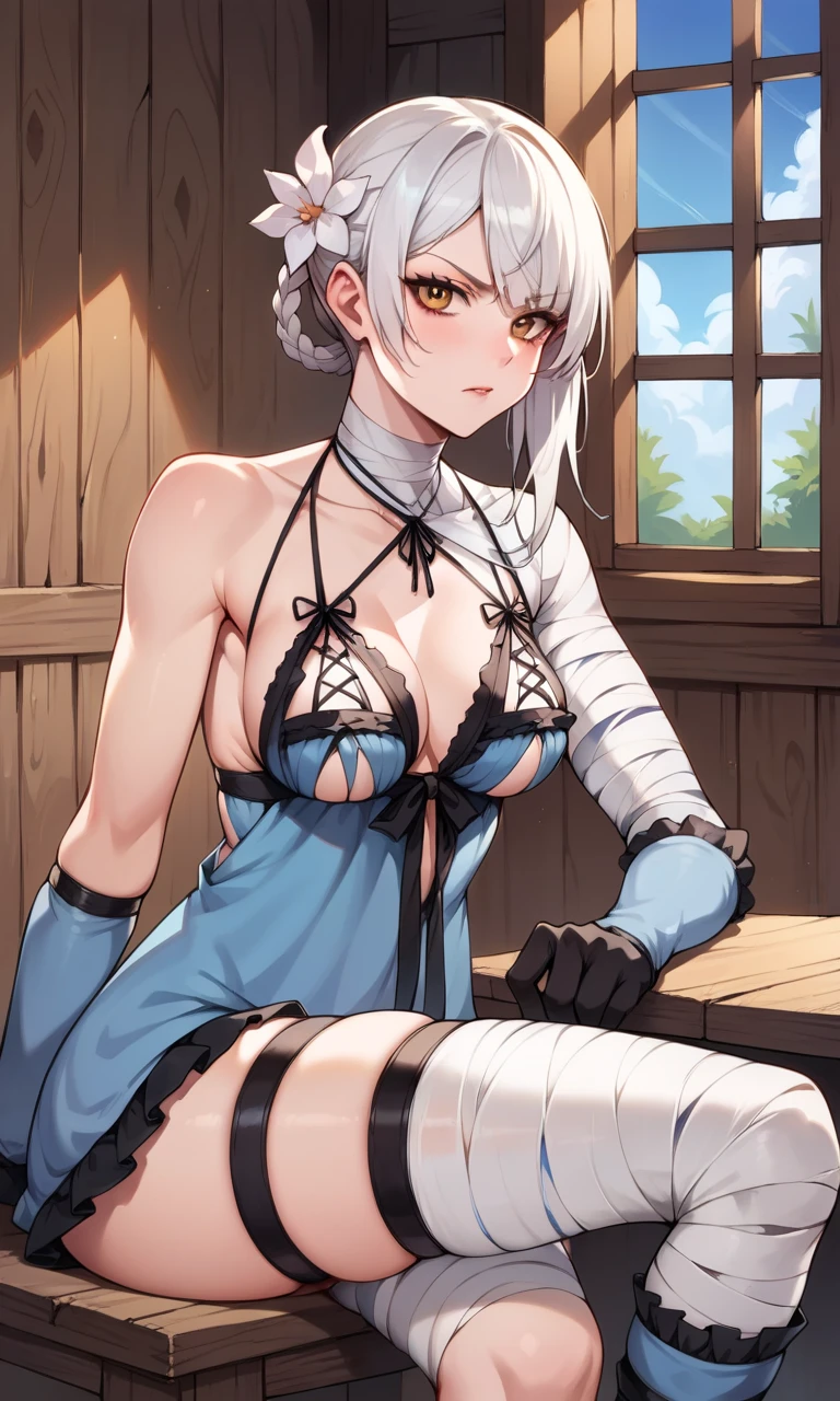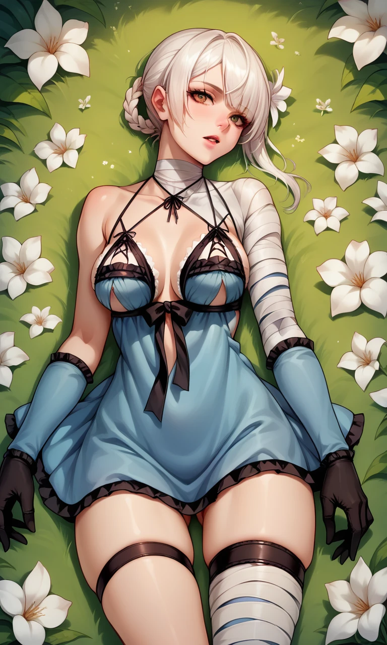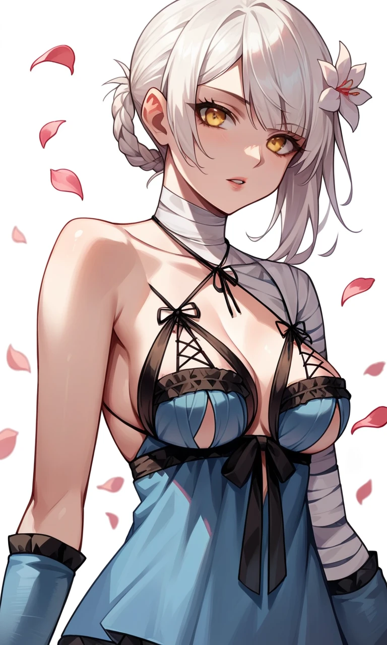 KaineRep, yellow eyes, white hair, hair flower, braid, asymmetrical hair, bandaged arm, negligee, bandaged leg, asymmetrical legwear