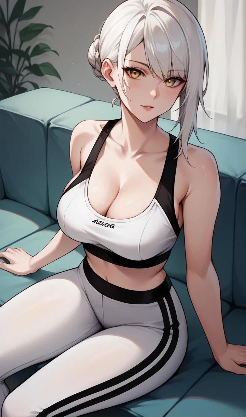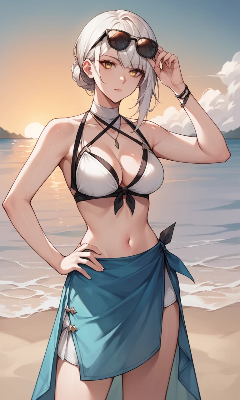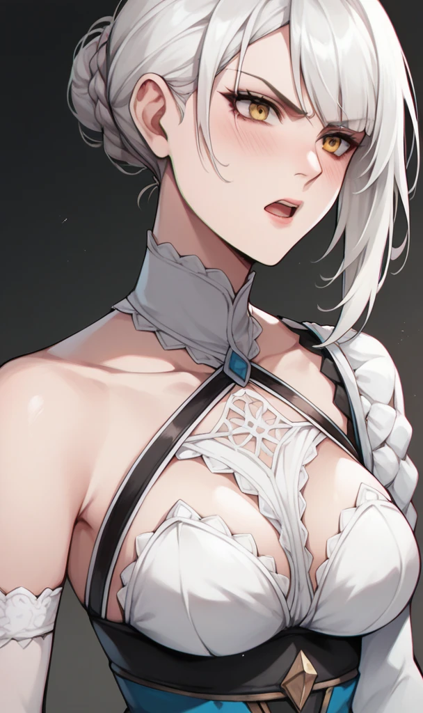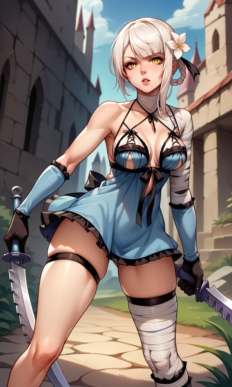 KaineRep, yellow eyes, white hair, hair flower, braid, asymmetrical hair, bandaged arm, negligee, bandaged leg, asymmetrical legwear