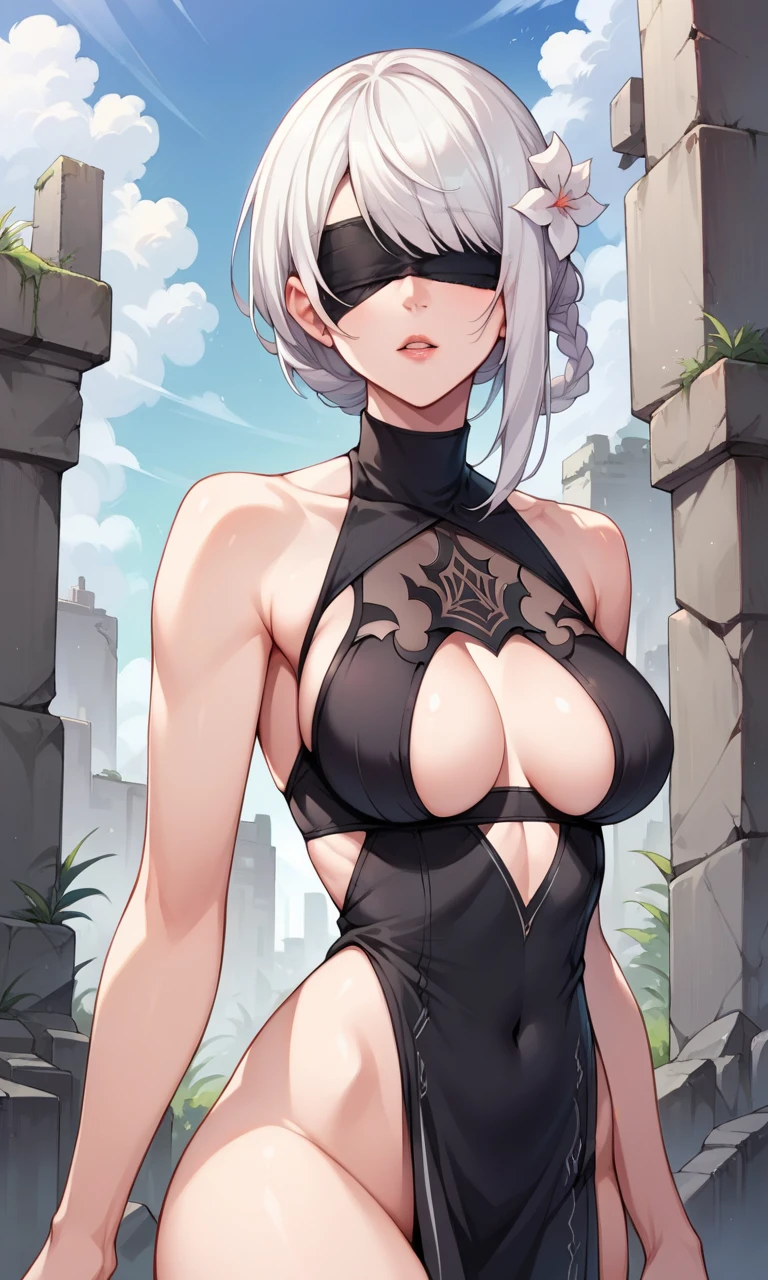 "KaineRep, yellow eyes, hair flower, braid, asymmetrical hair, bandaged arm, negligee, bandaged leg, asymmetrical legwear" to generate her outfit