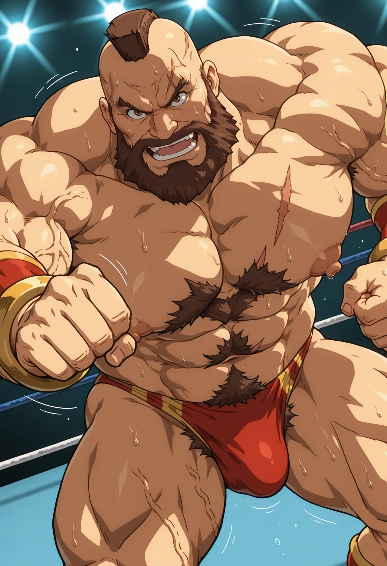 mohawk, scar, full beard, Brown eyes, brown hair,