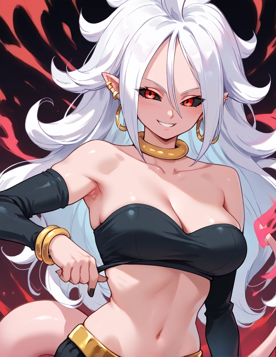 Majin:majin android 21, white hair, red eyes, (black sclera,colored sclera:1.3), hoop earrings, earrings, hair between eyes,pink skin,tail,tube top,strapless,pants