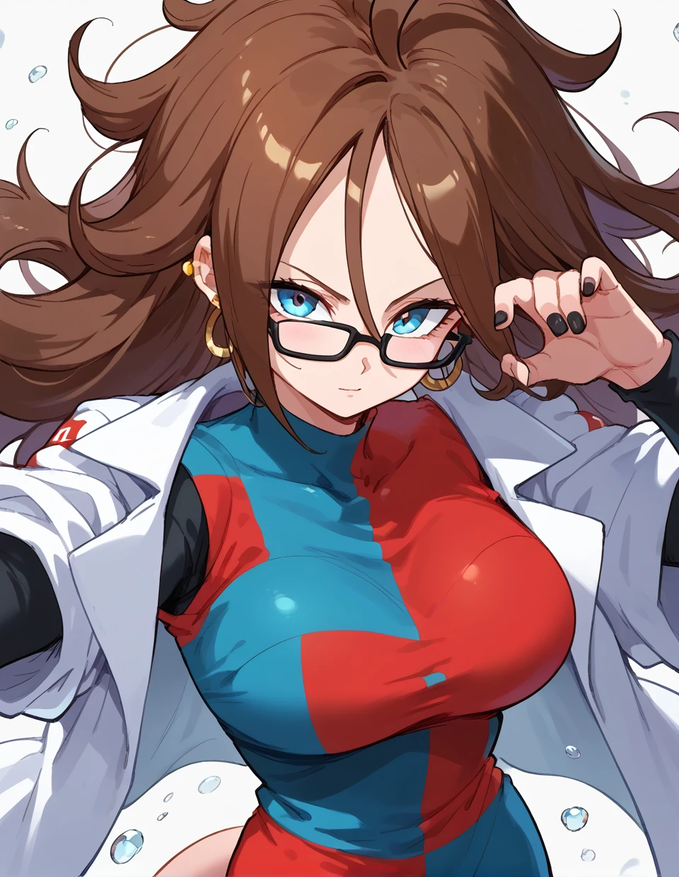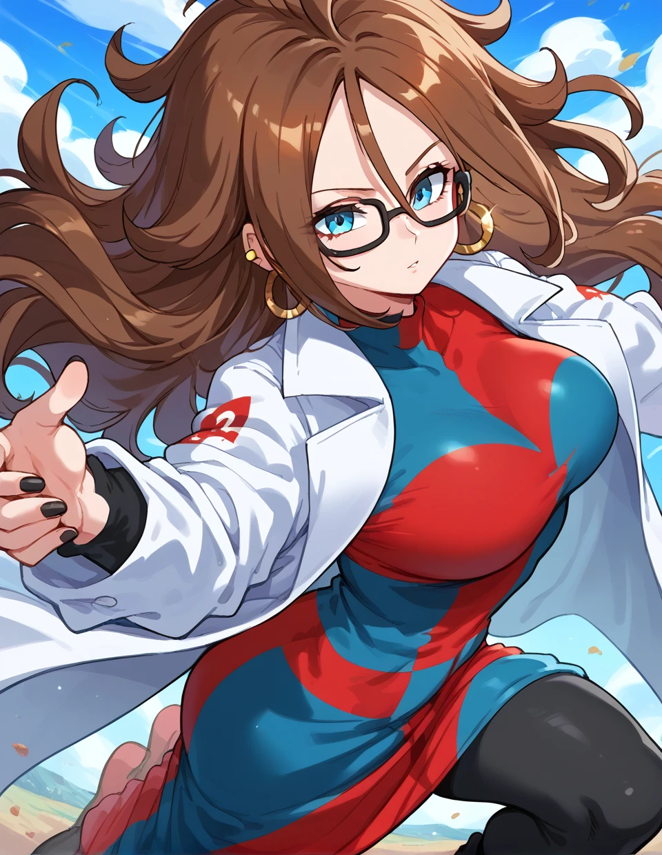 Lab coat:android 21, brown hair, blue eyes, glasses, hoop earrings, earrings, hair between eyes, two-tone dress, white coat/labcoat, black legwear