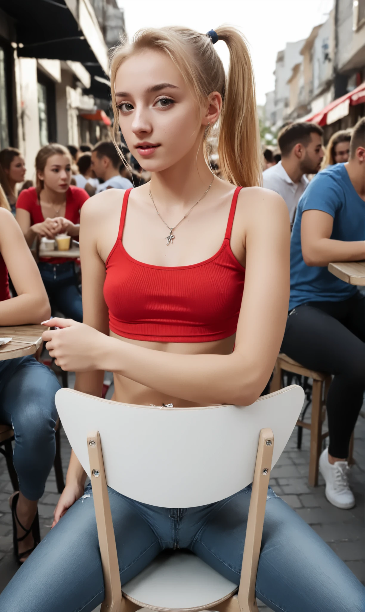 siastch, slim 25yo girl in yellow shirt and denim shorts sitting astride a chair with open back in a pub. long blonde ponytail.