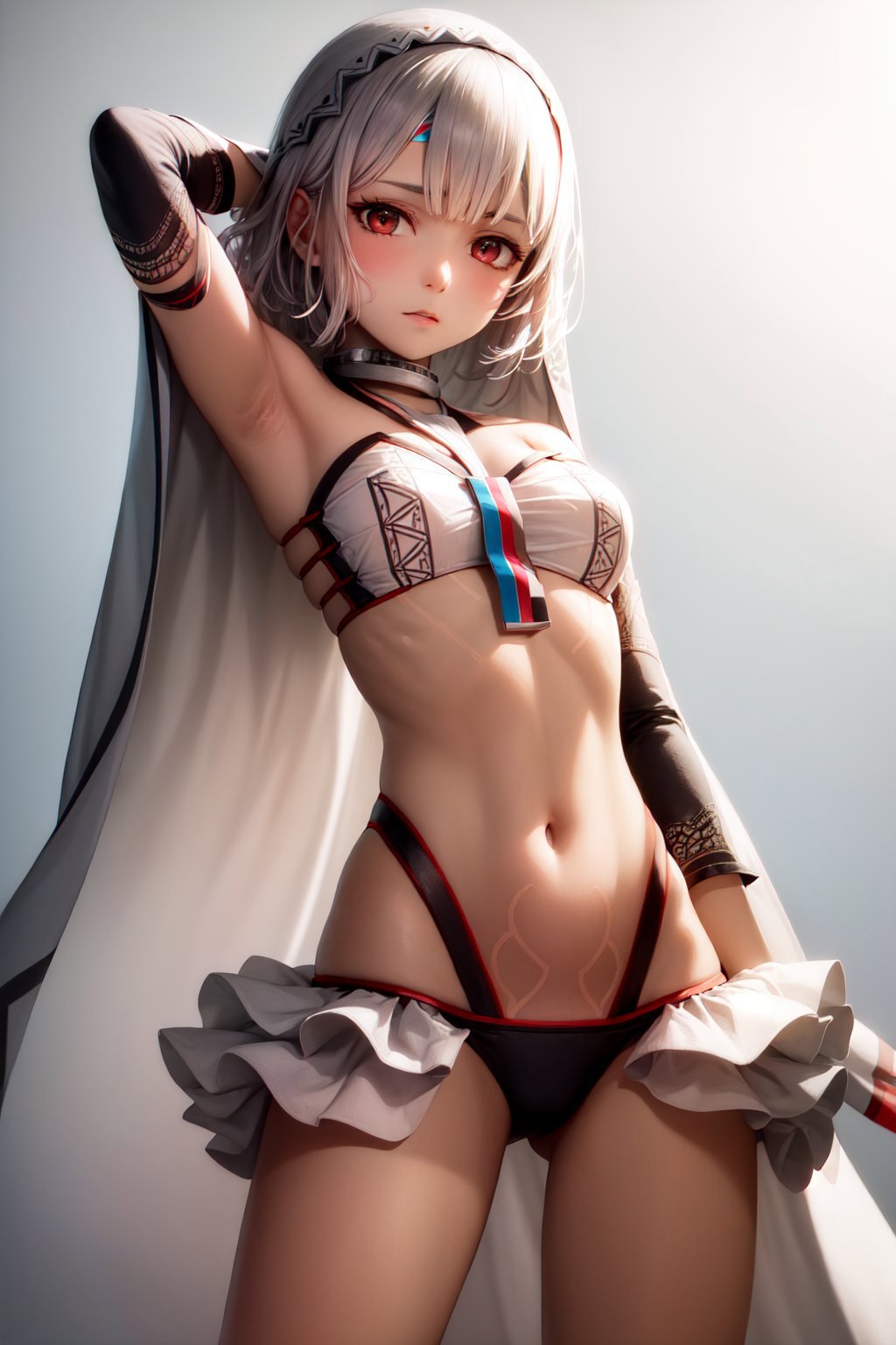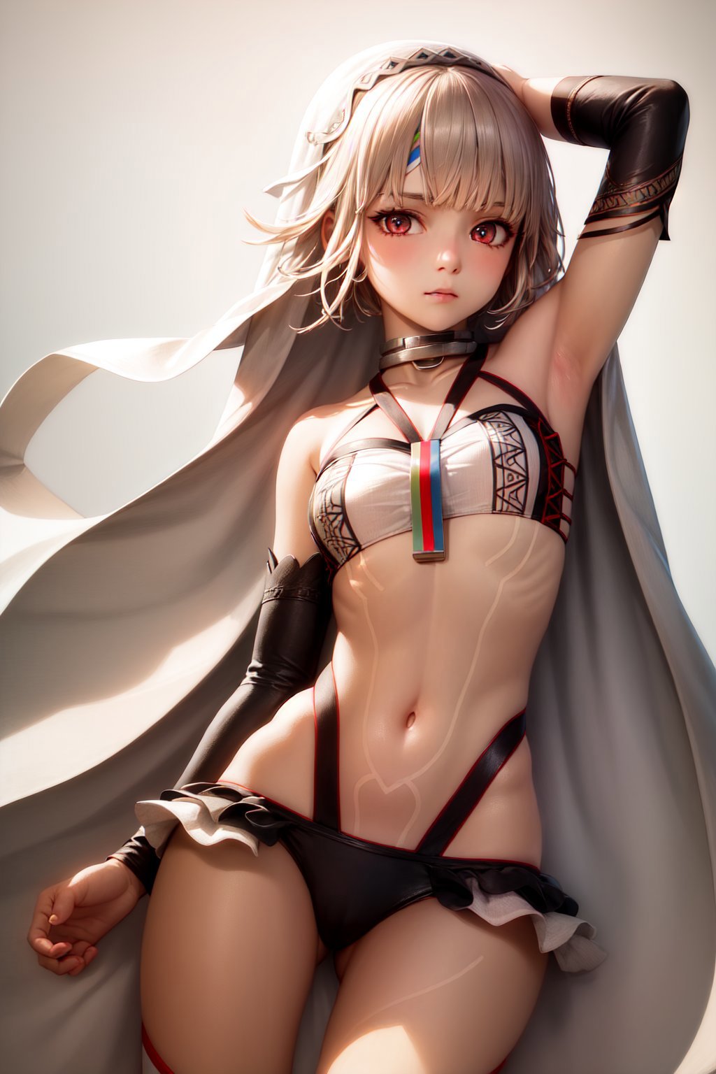 Default Outfit: altera, dark skin, dark-skinned female, full-body tattoo, veil, detached sleeves, choker, bare shoulders, midriff, navel