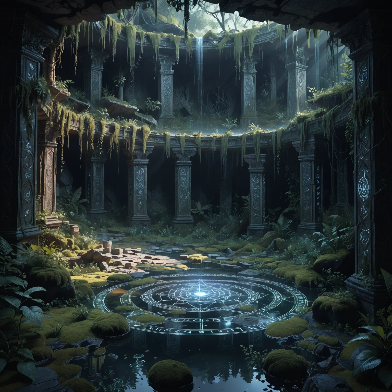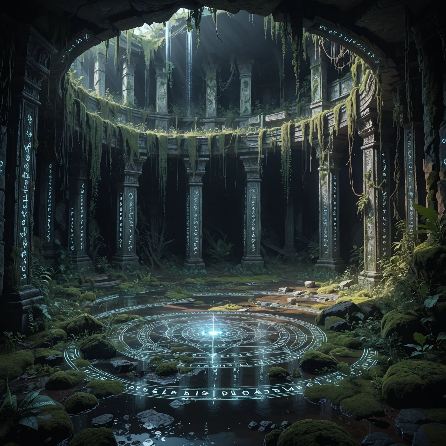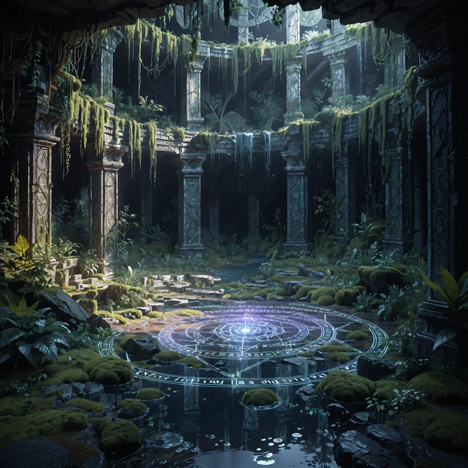 Moonlit reflections dance in shallow puddles across the floor 🌕🪞, the only light emanating from bioluminescent moss and arcane symbols that whisper secrets of lost civilizations.