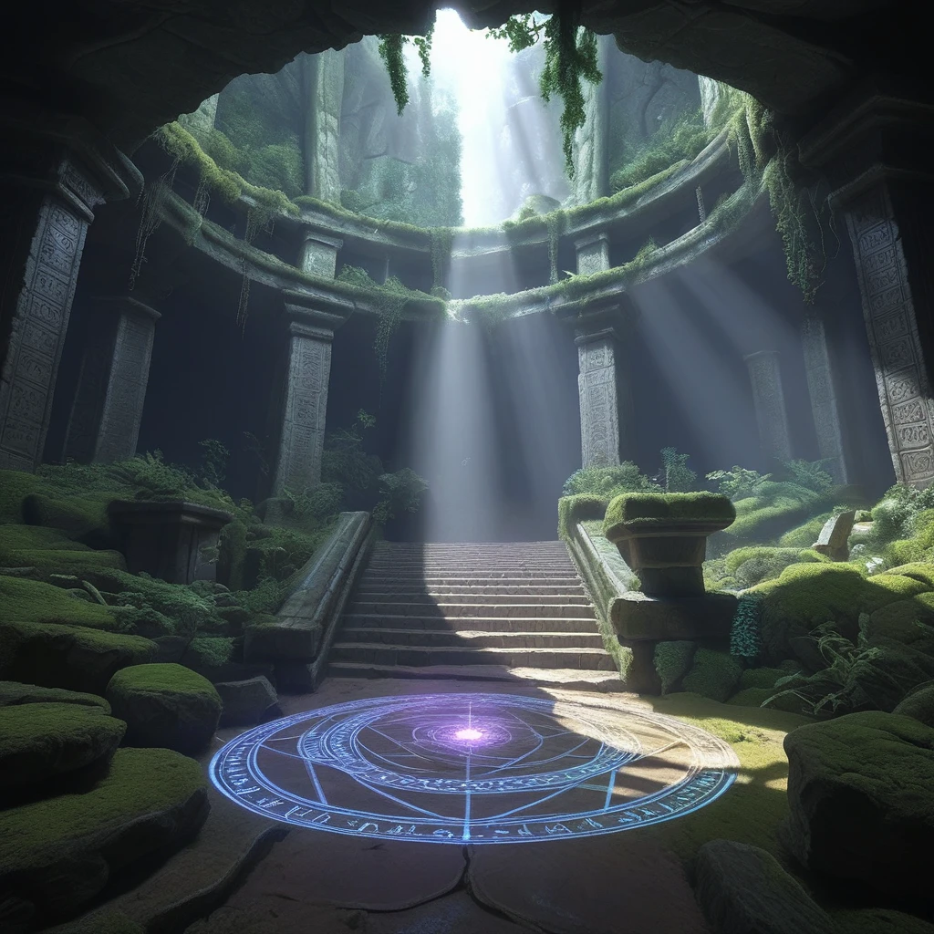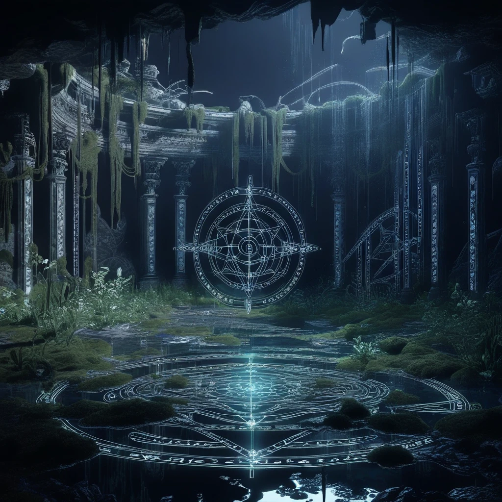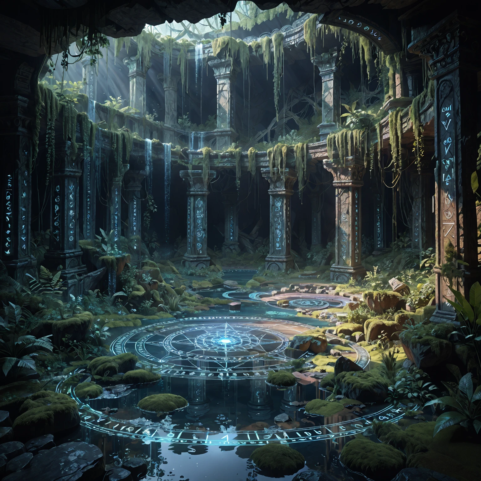 Moonlit reflections dance in shallow puddles across the floor 🌕🪞, the only light emanating from bioluminescent moss and arcane symbols that whisper secrets of lost civilizations.